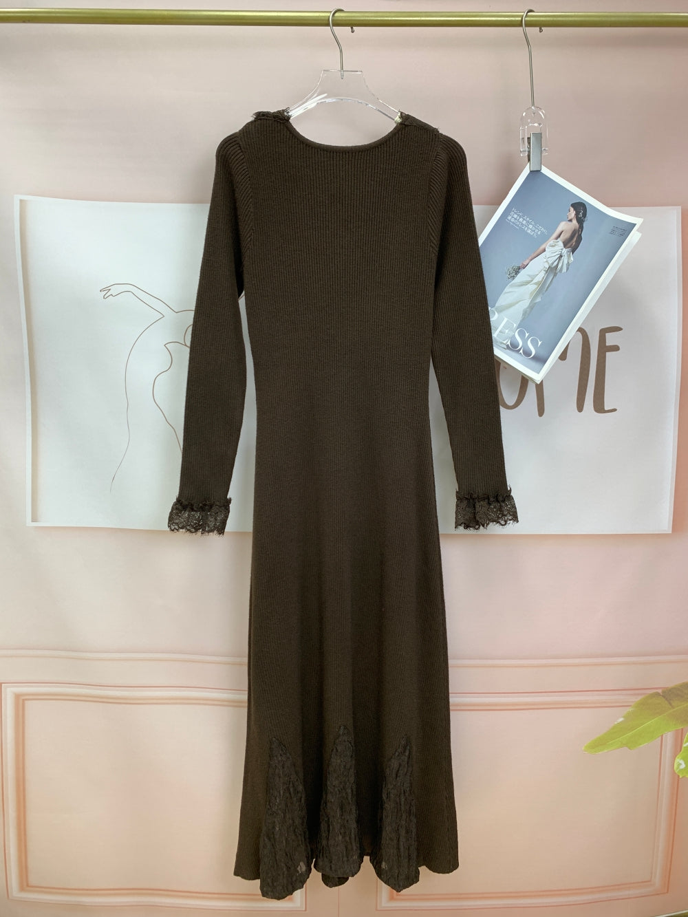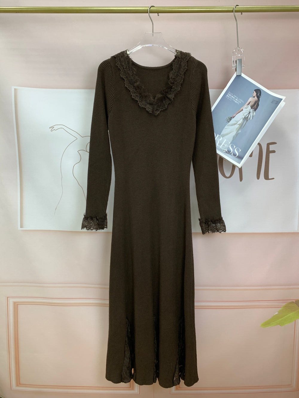 Ribbed Knit Midi Dress with Lace Insets