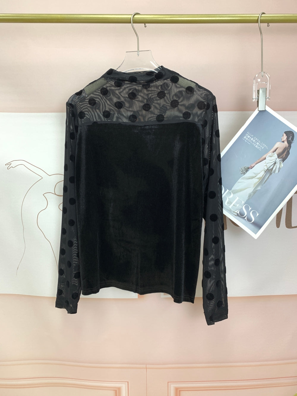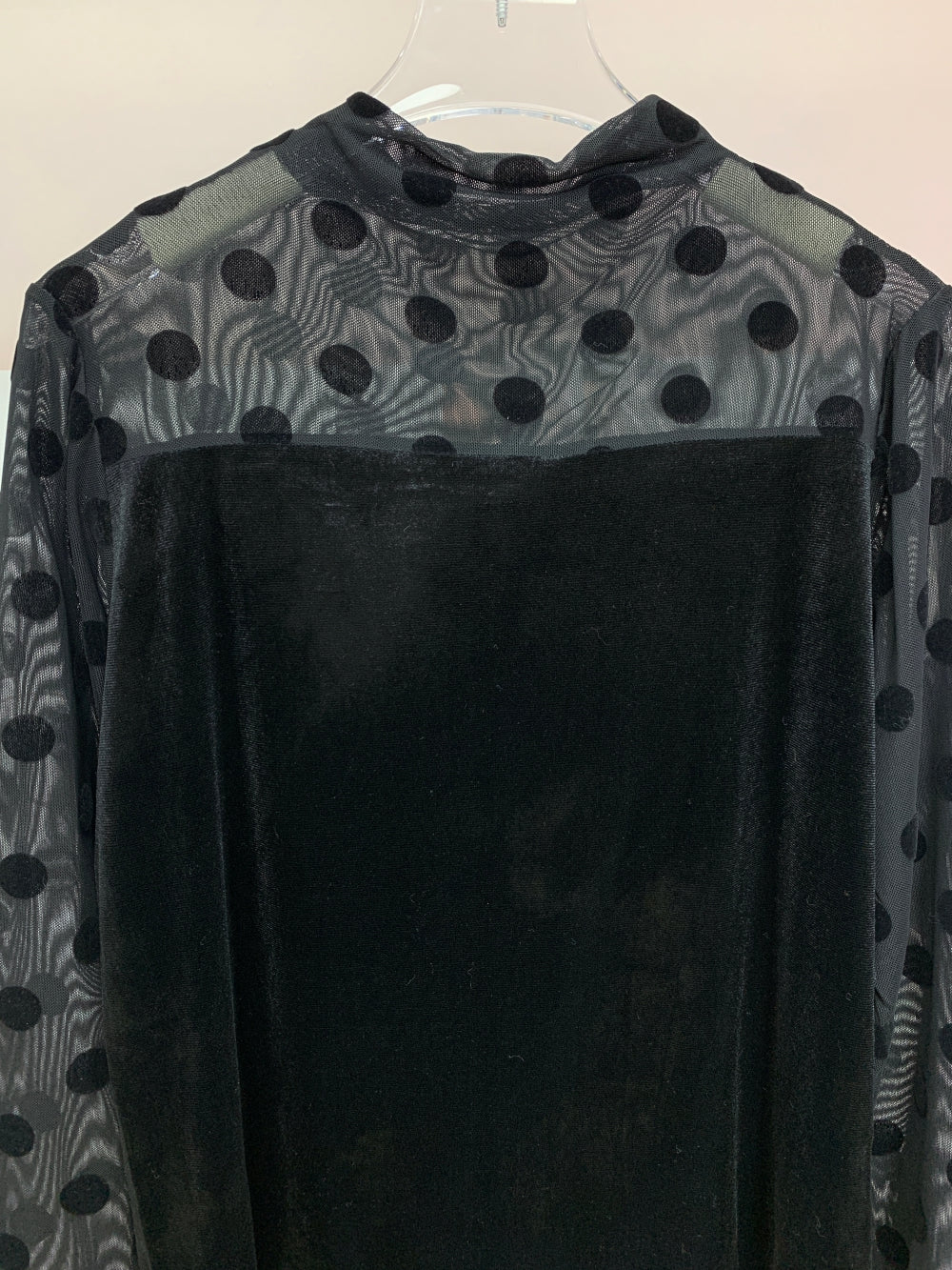 Details: Velvet front panel, see-through sleeves, high neckline