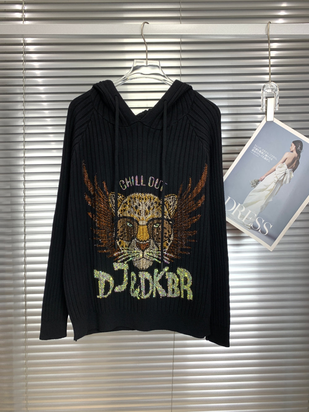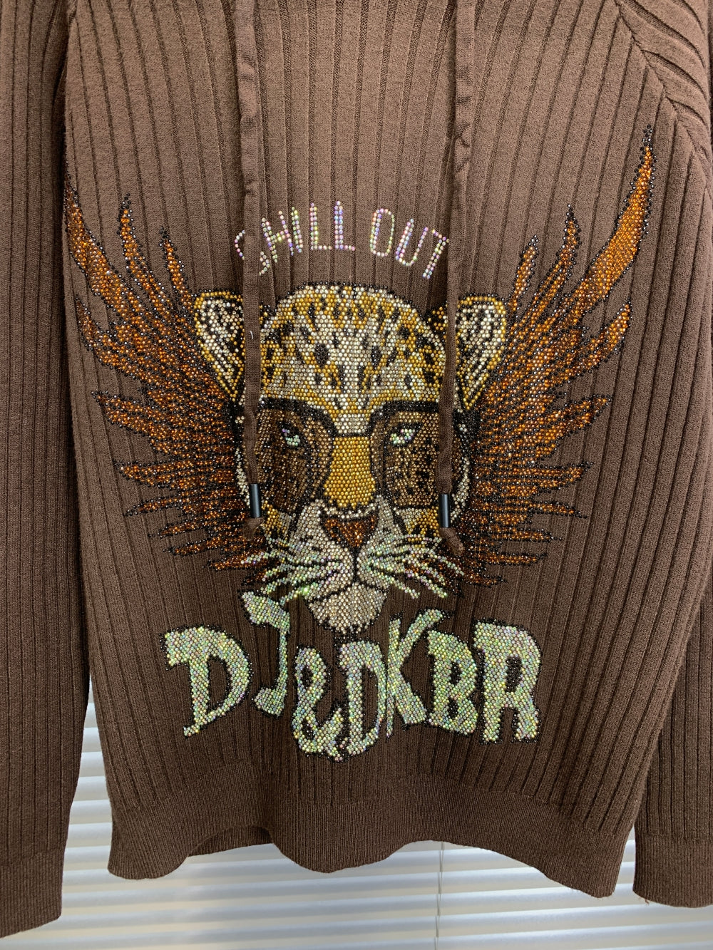 Details: Hooded design with drawstring, sequin leopard motif with “CHILL OUT” lettering, and wing detailing