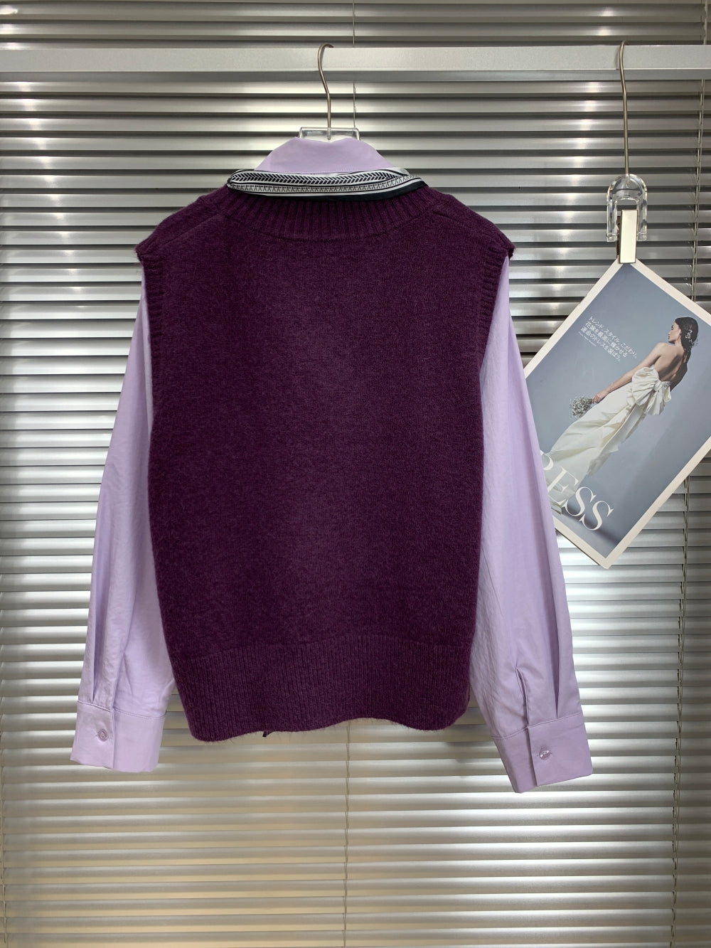 Details: Sleeveless knit vest over collared shirt with detachable printed scarf tie