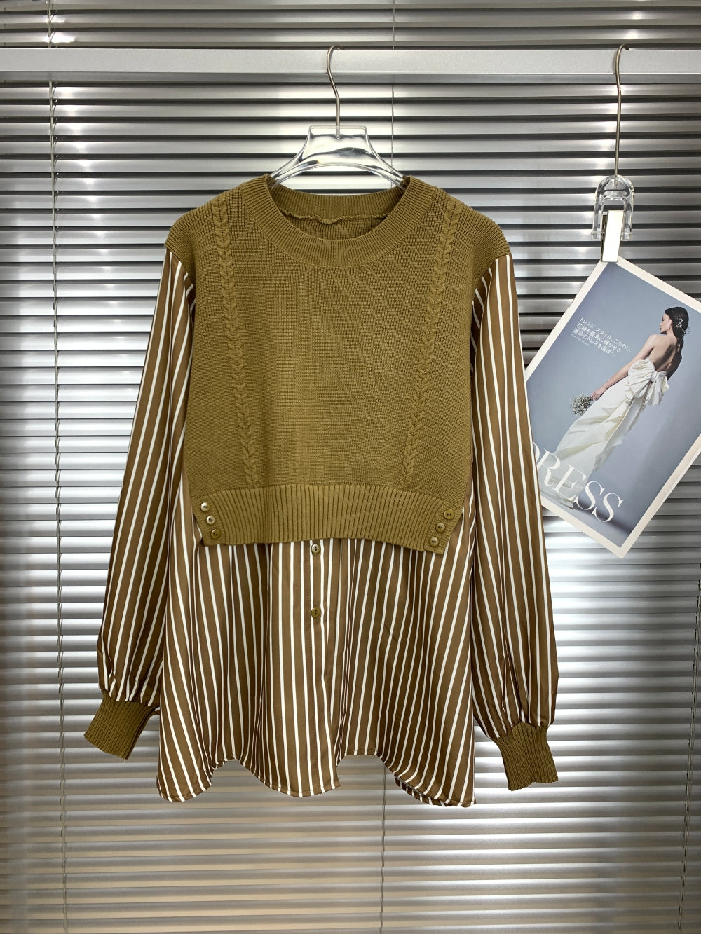 Details: Cable-knit vest front, buttoned shirt base, ribbed hem, layered hybrid style