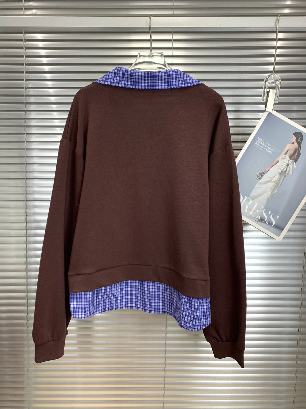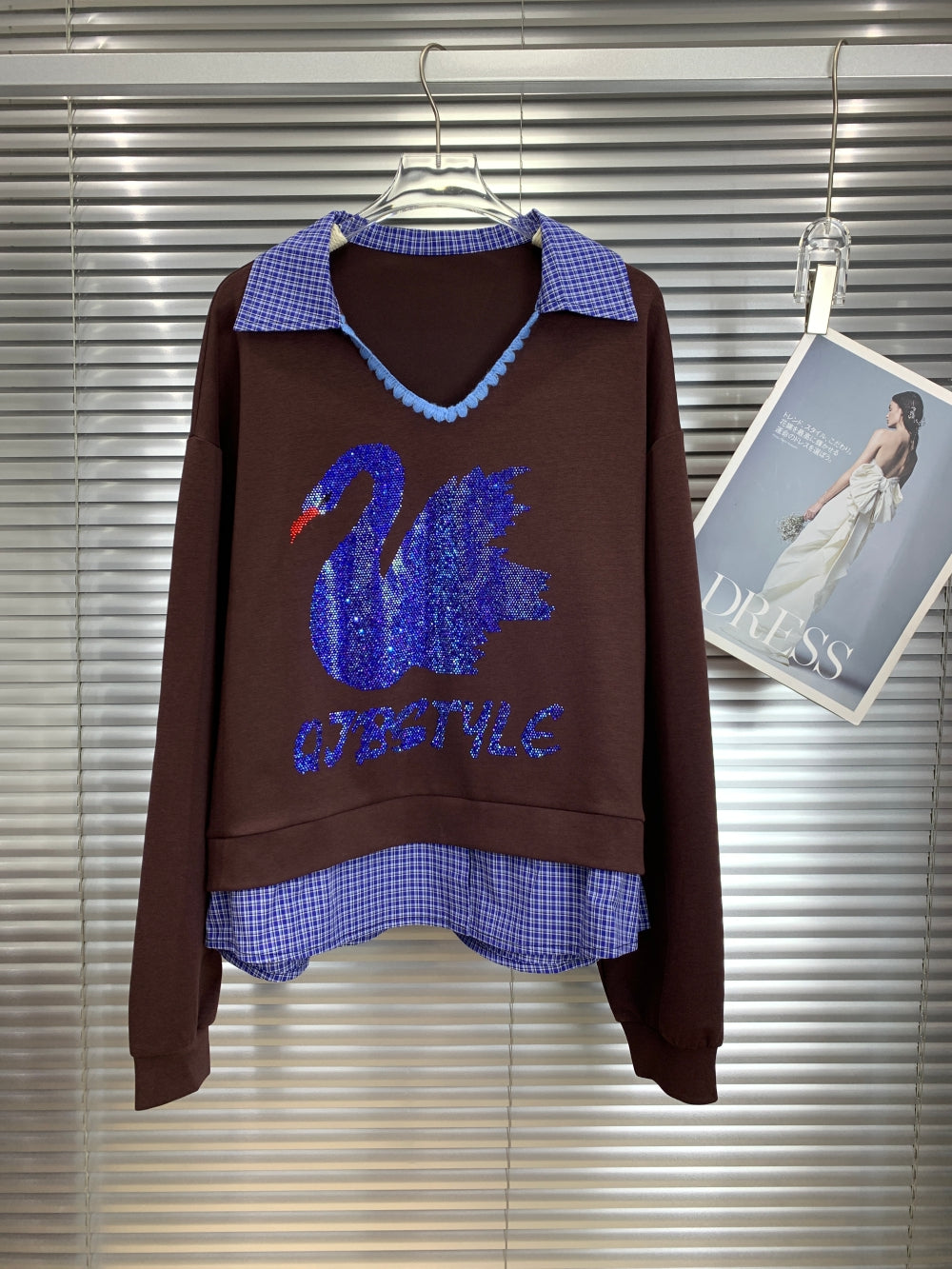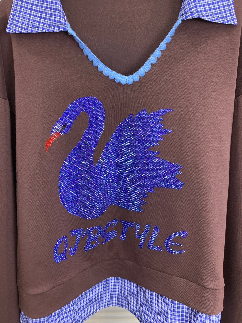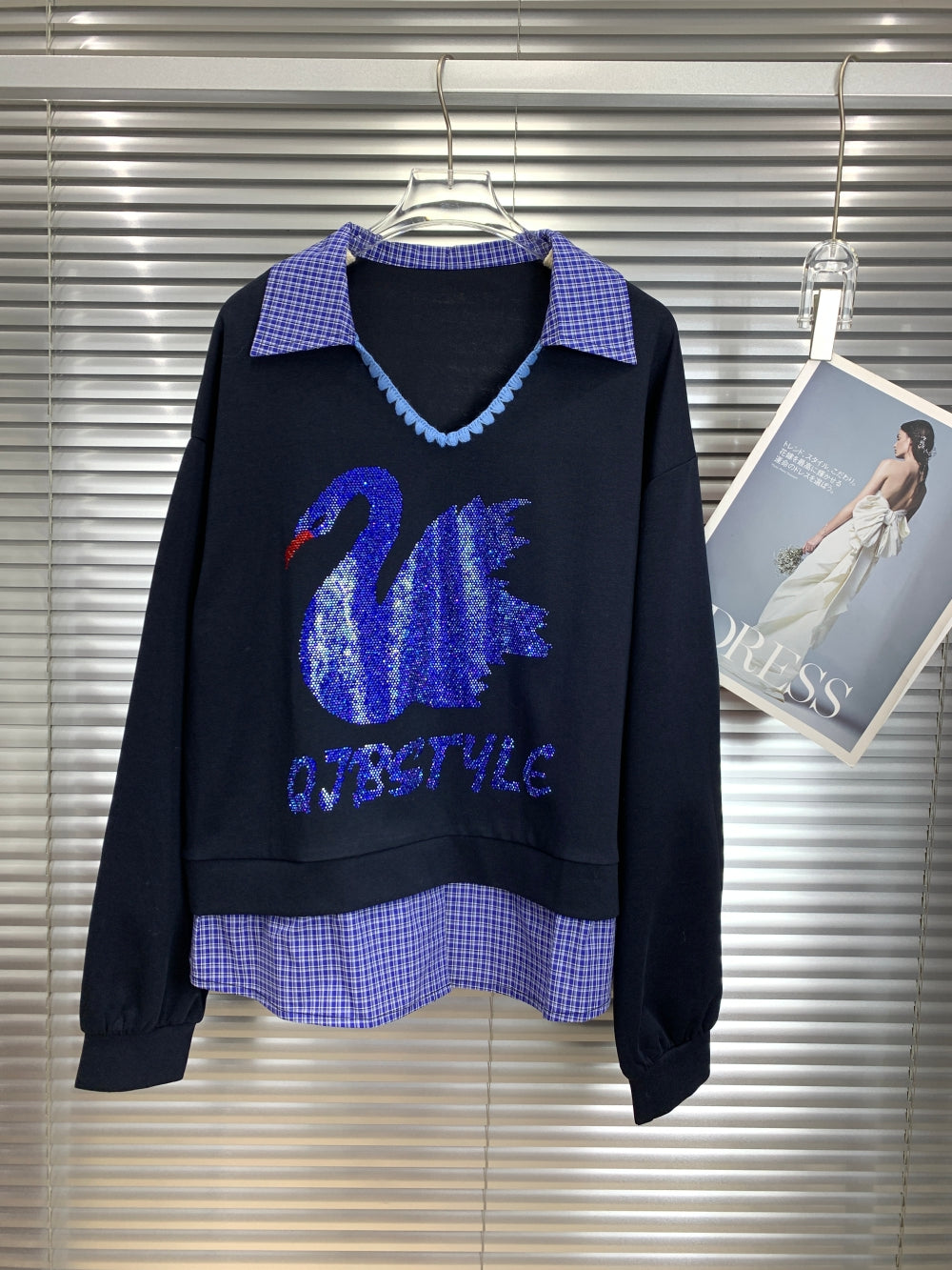Details: Sequin swan motif with slogan, layered check shirt collar and hem, contrast neckline trim, long sleeves