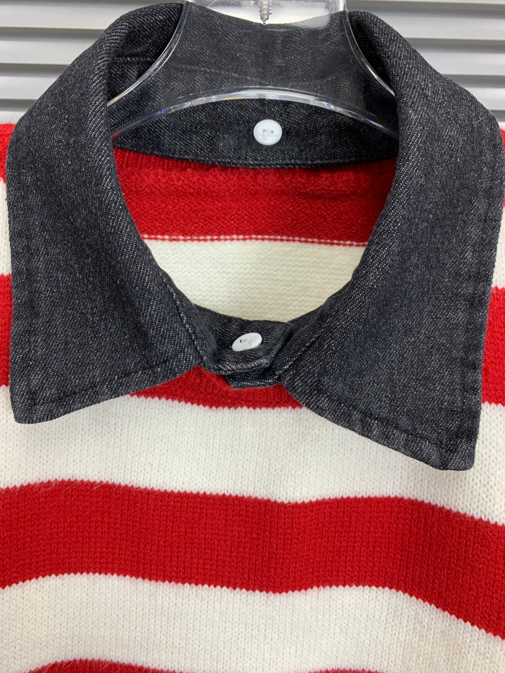 Details: Contrast corduroy collar, drop shoulders, pullover style