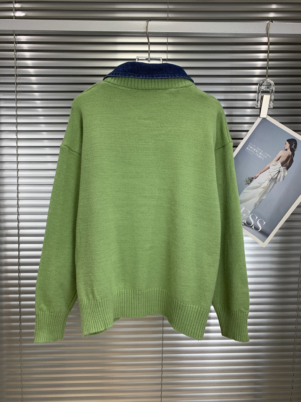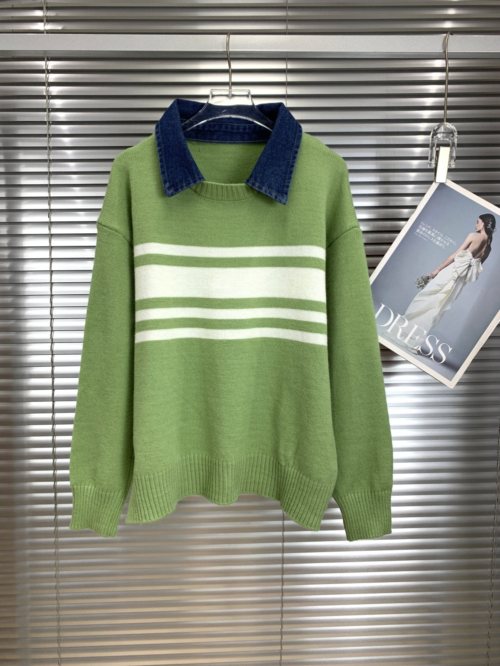 Details: Contrast denim collar, ribbed hem and cuffs, crew neckline