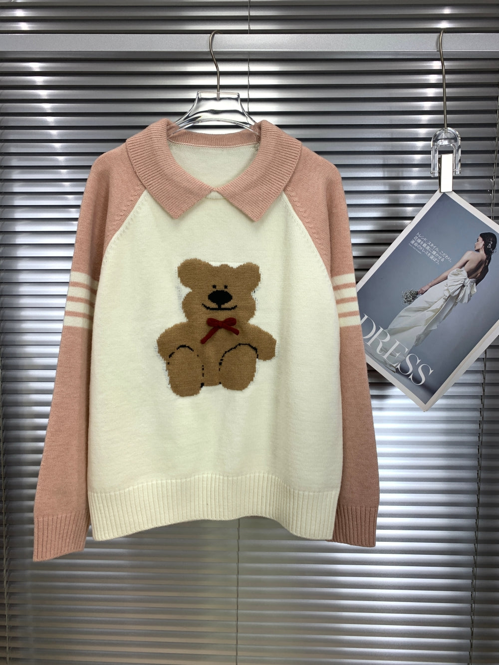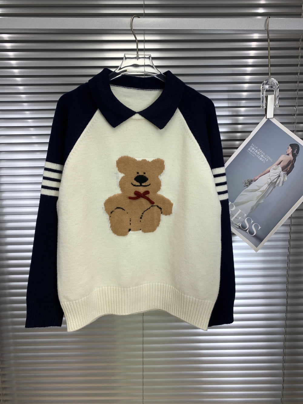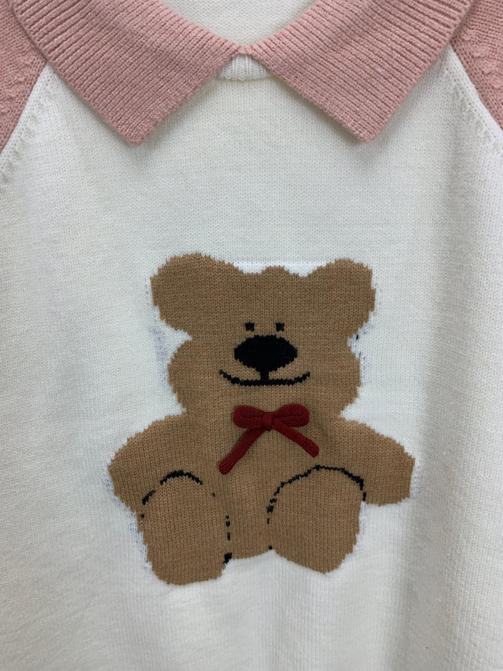 Details: Contrast collar, intarsia teddy bear design, ribbed trims