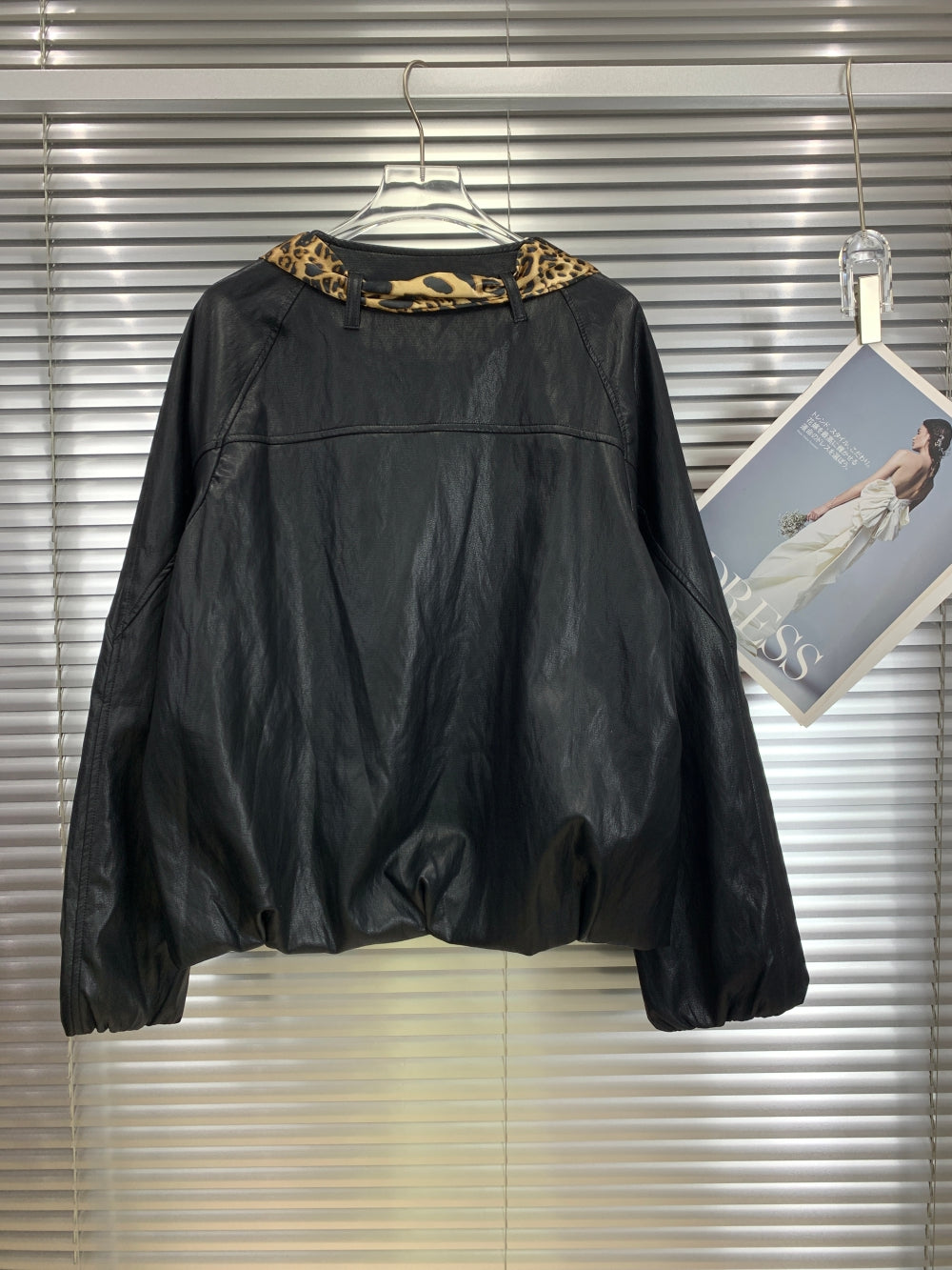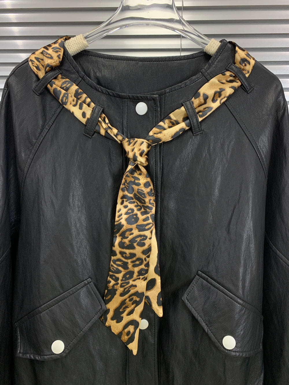 Details: Snap button closure, patch pockets, detachable leopard print tie