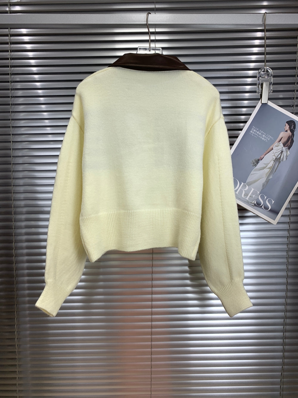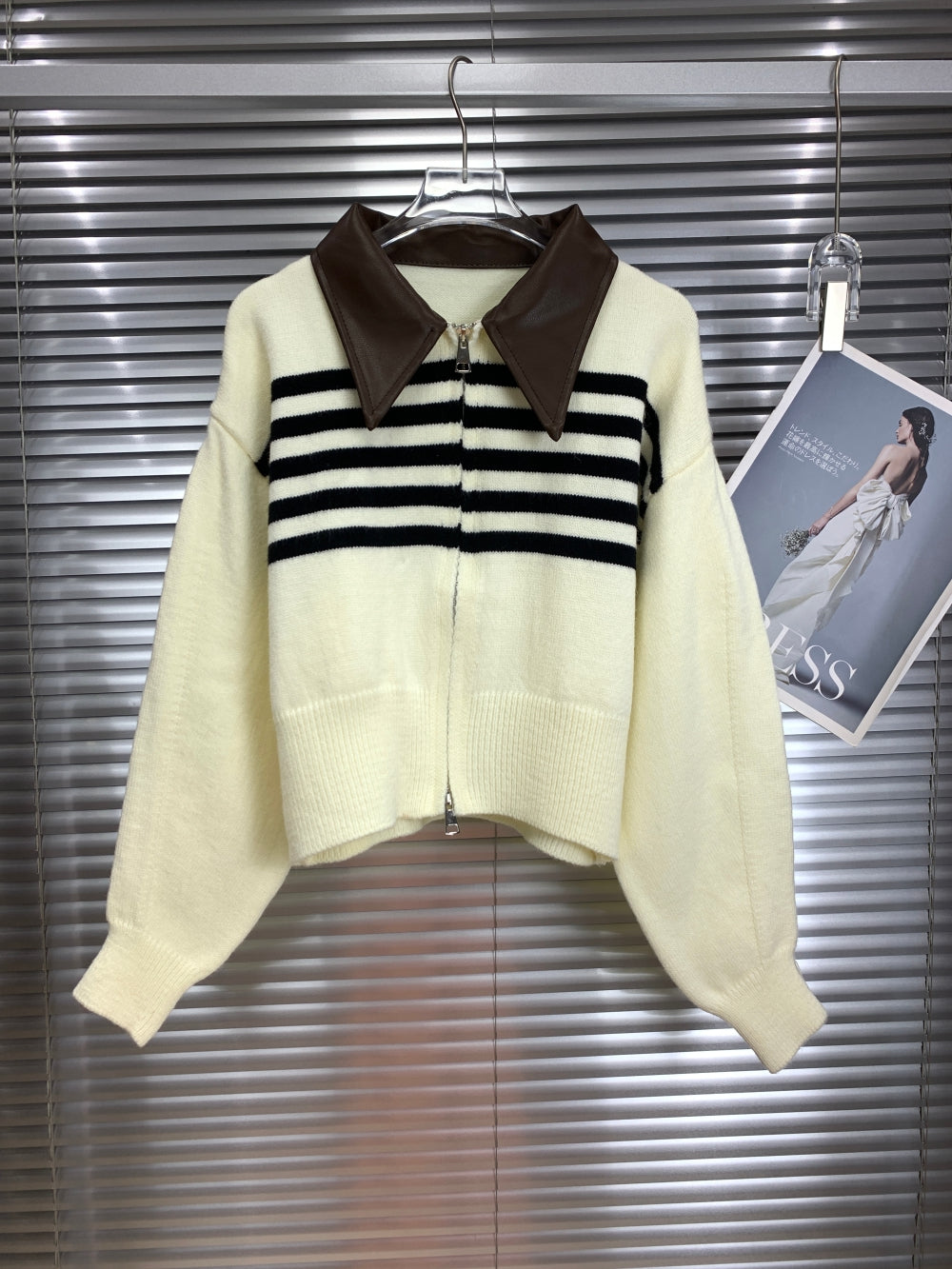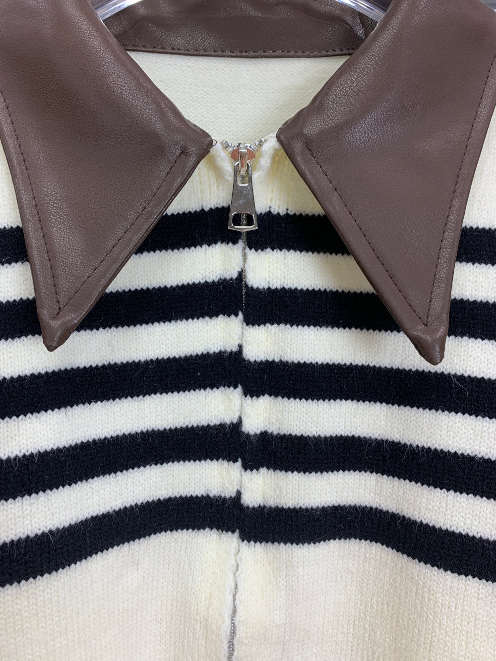 21684 Striped Knit Zip Cardigan with Leather Collar