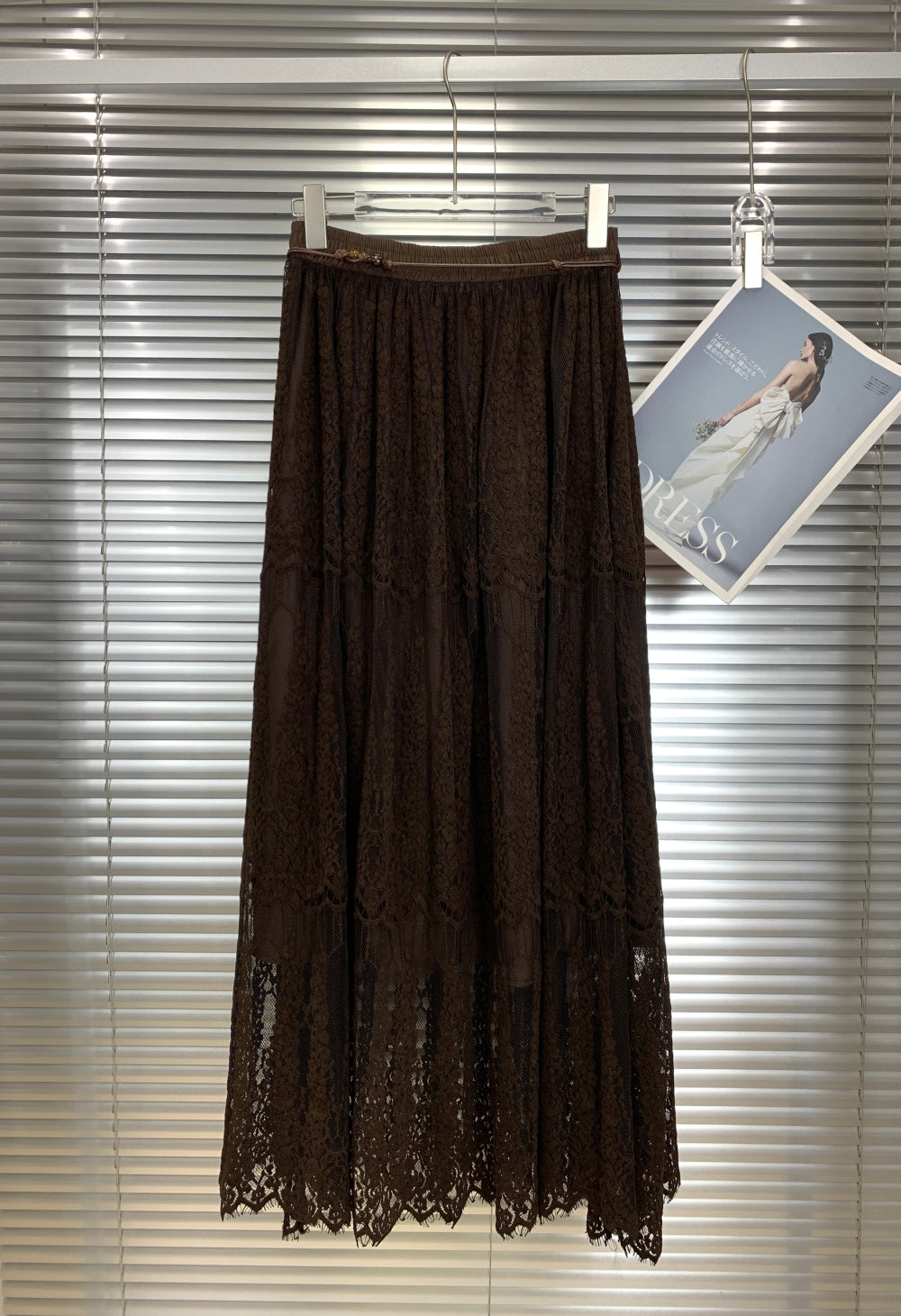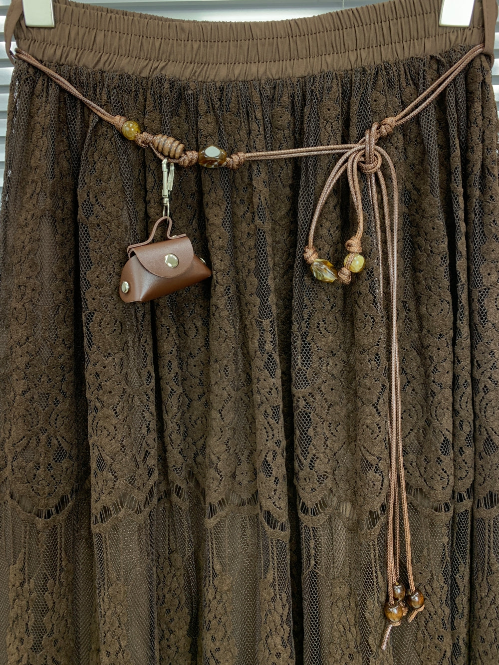 Details: Elastic waist, layered lace panels, decorative belt with charm