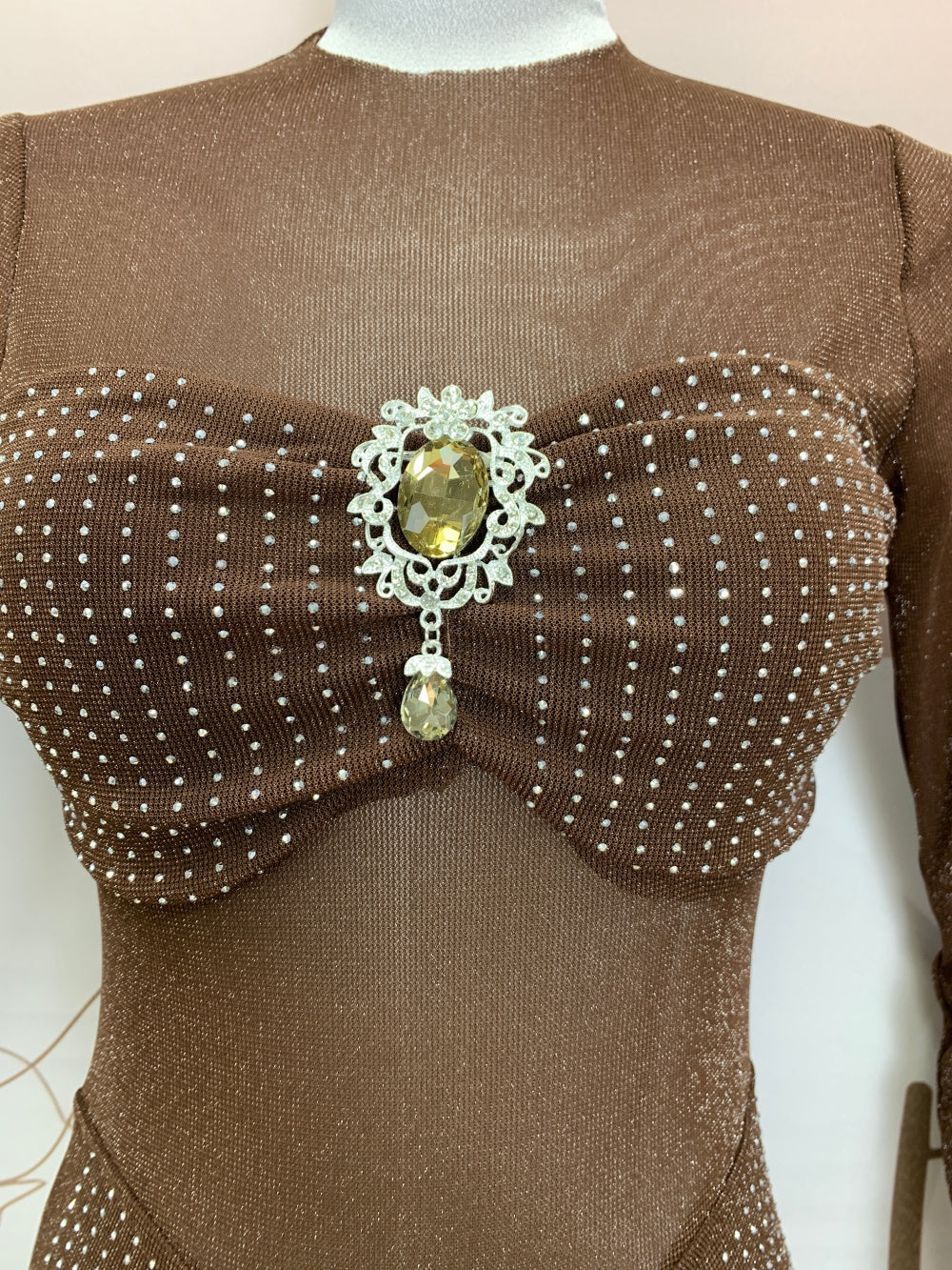 Details: Sheer illusion bodice, crystal brooch accent, long sleeves