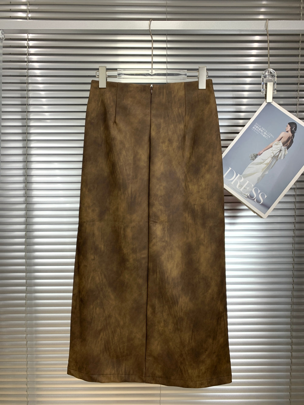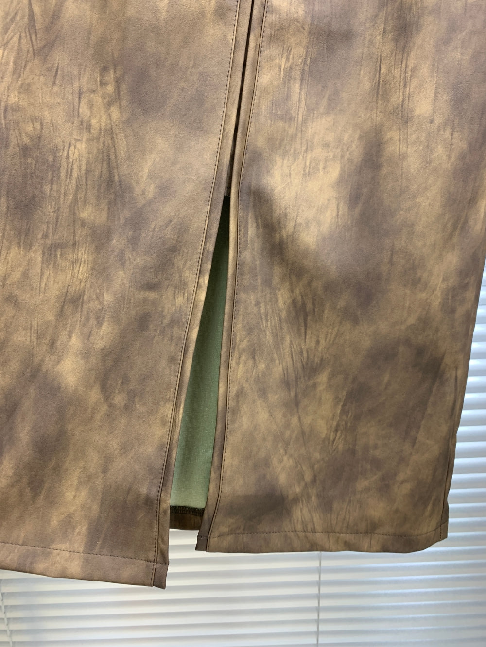 Details: Belted waist with metal buckle, front slit, back zip closure