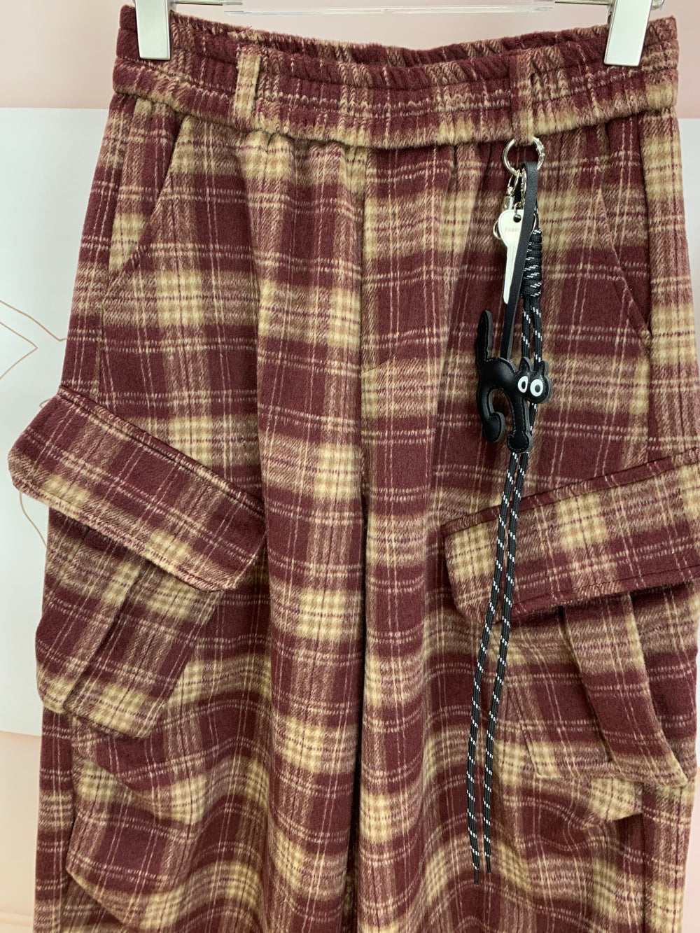 Details: Elastic waistband, side cargo pockets, decorative keychain detail