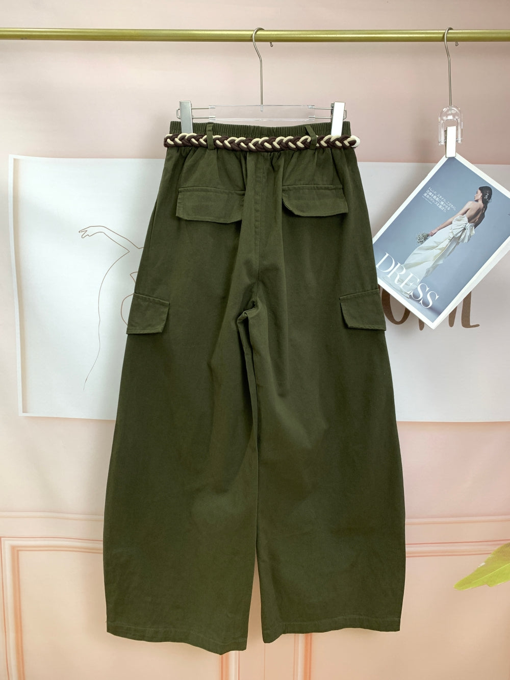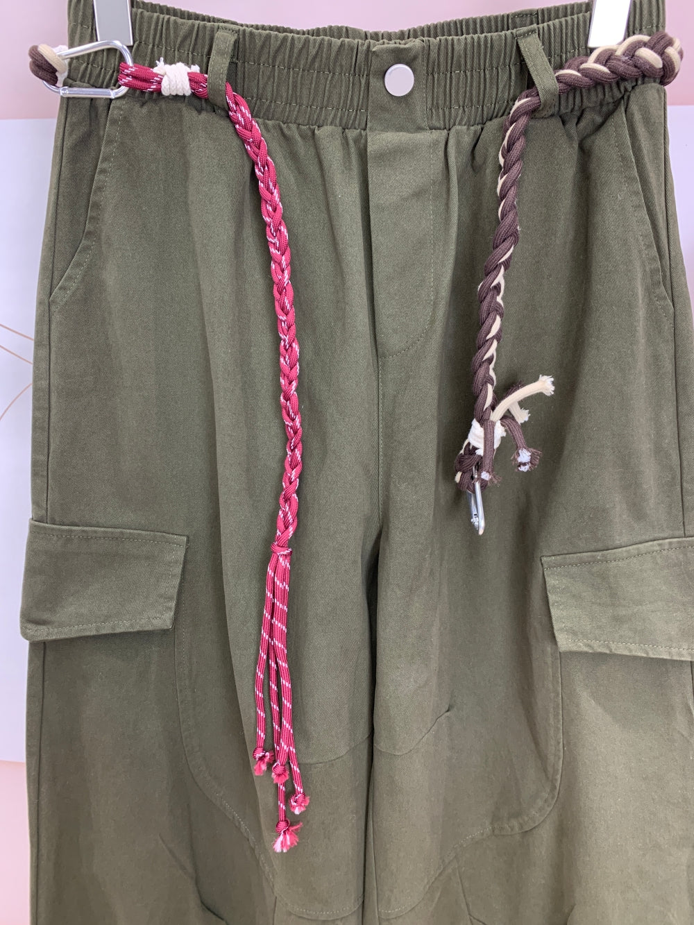 Details: Elastic waist, cargo pockets, braided rope belt detail, casual street style