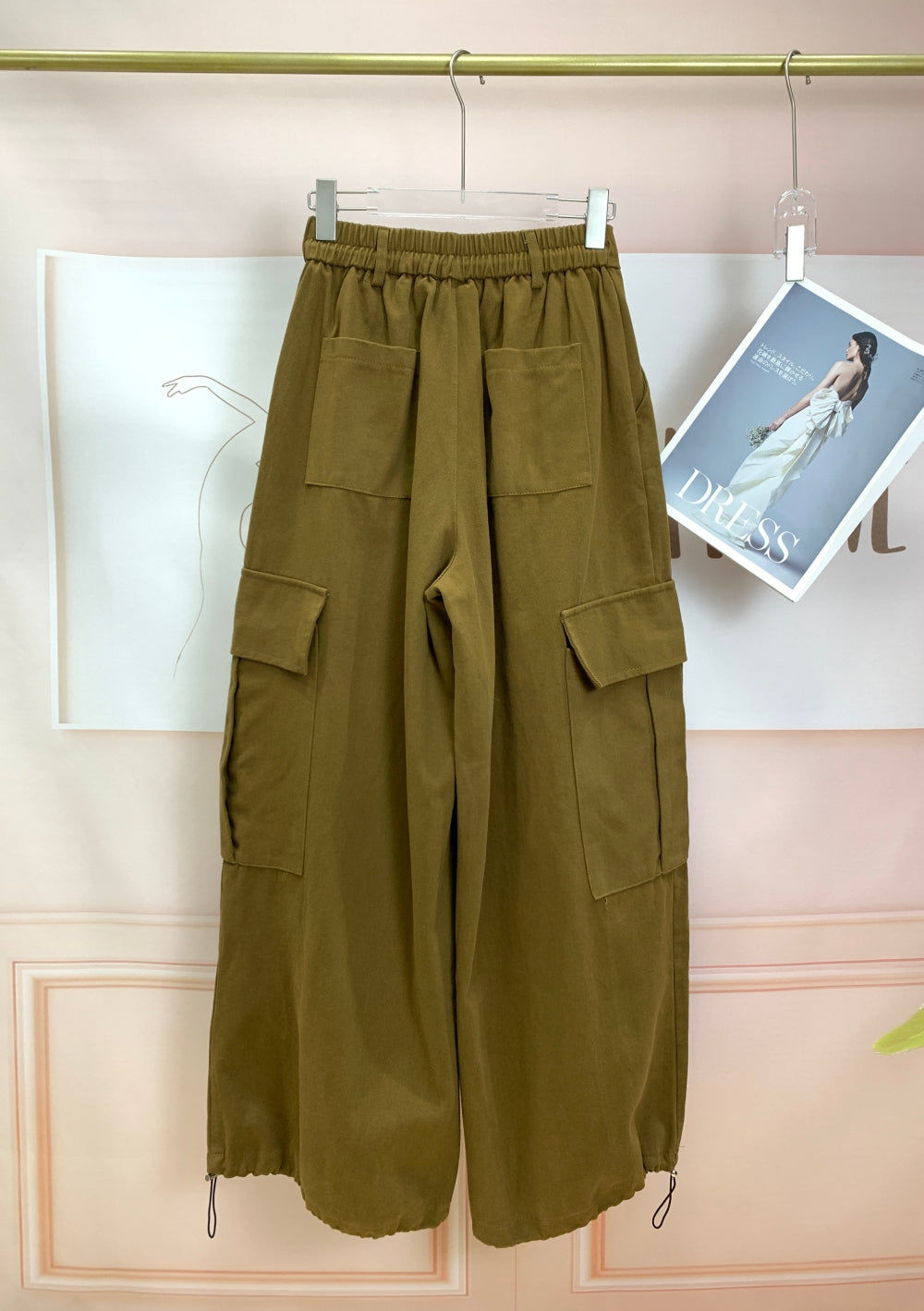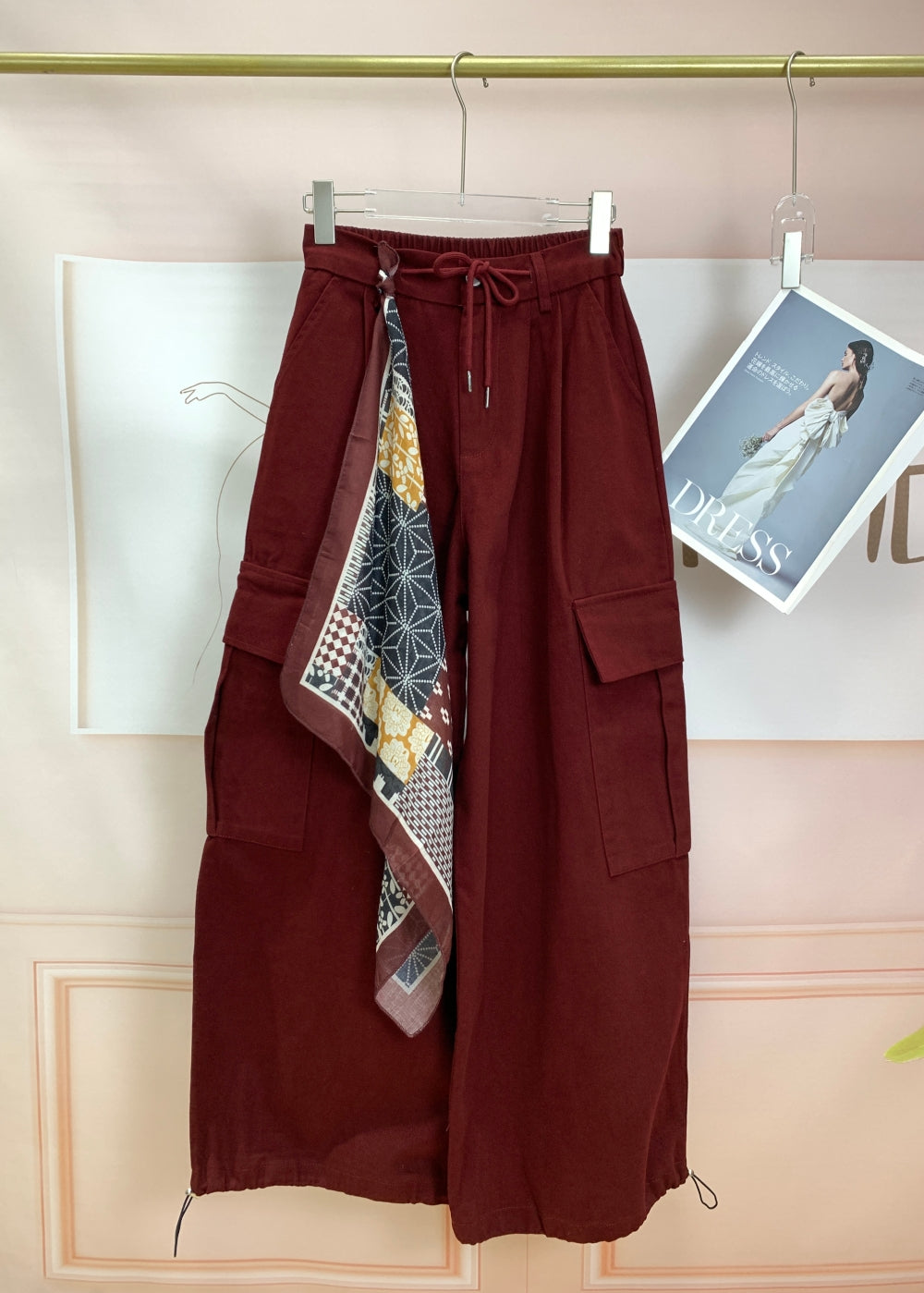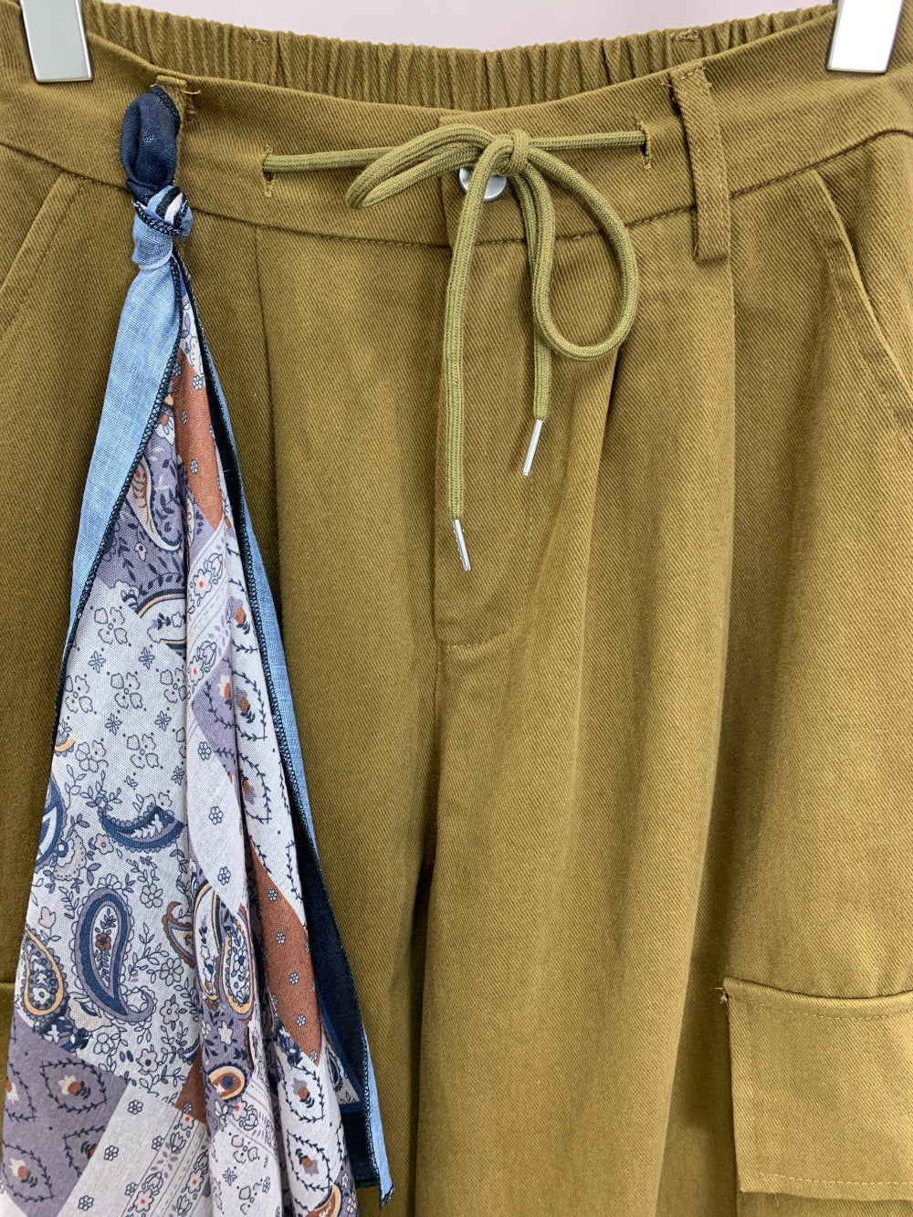 Details: Elastic waistband with drawstring, side flap cargo pockets, hem toggle cords, detachable printed scarf accessory