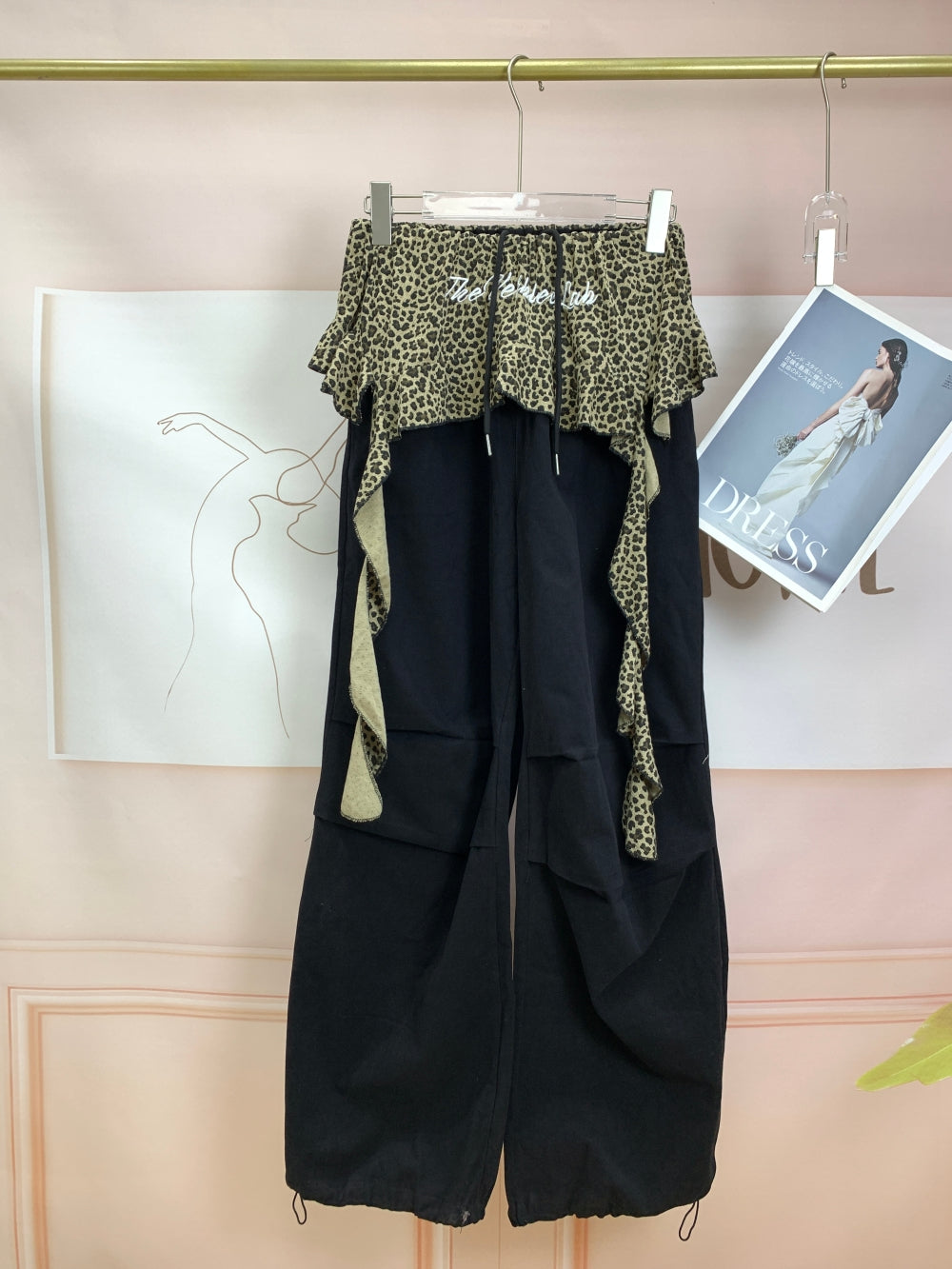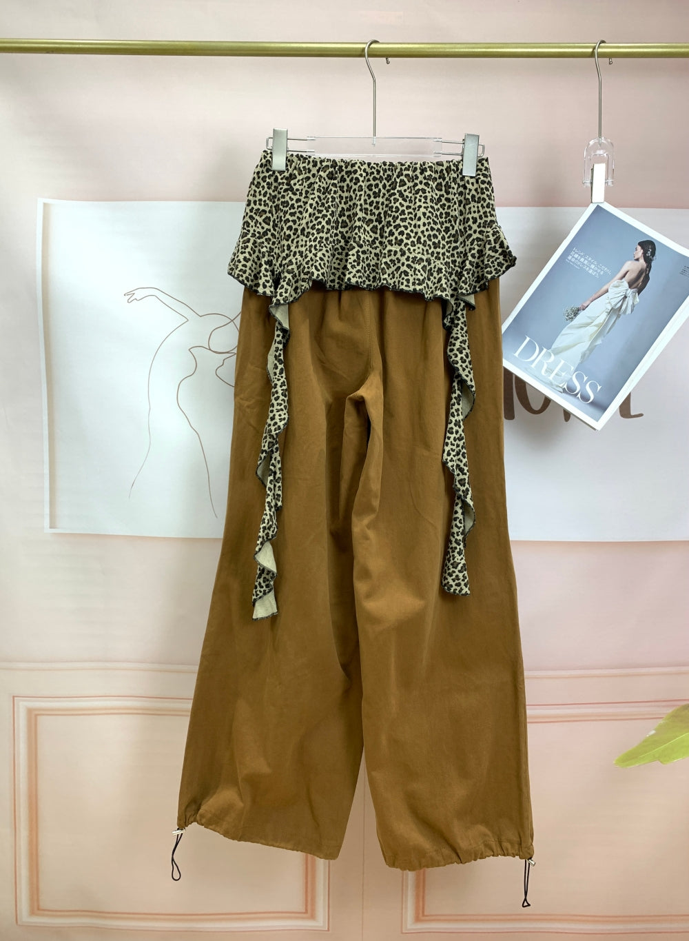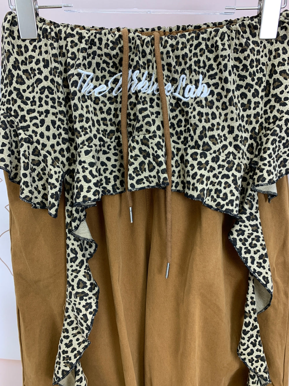 Details: Elastic waistband with leopard frill layer, drawstring hem, large side pockets