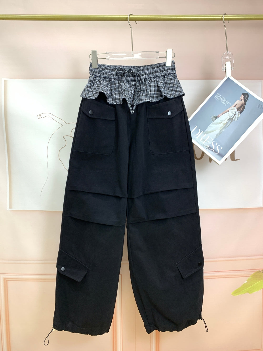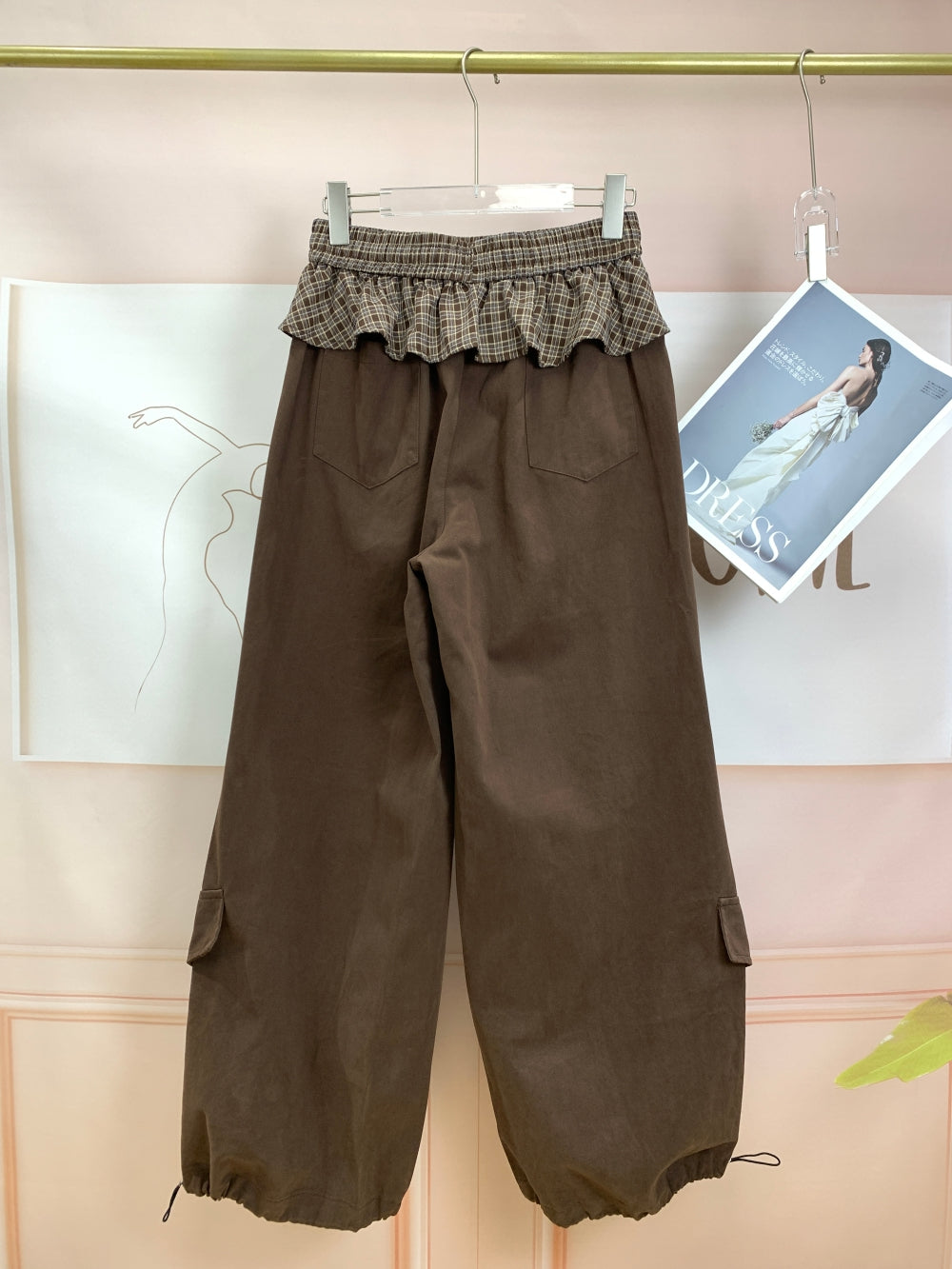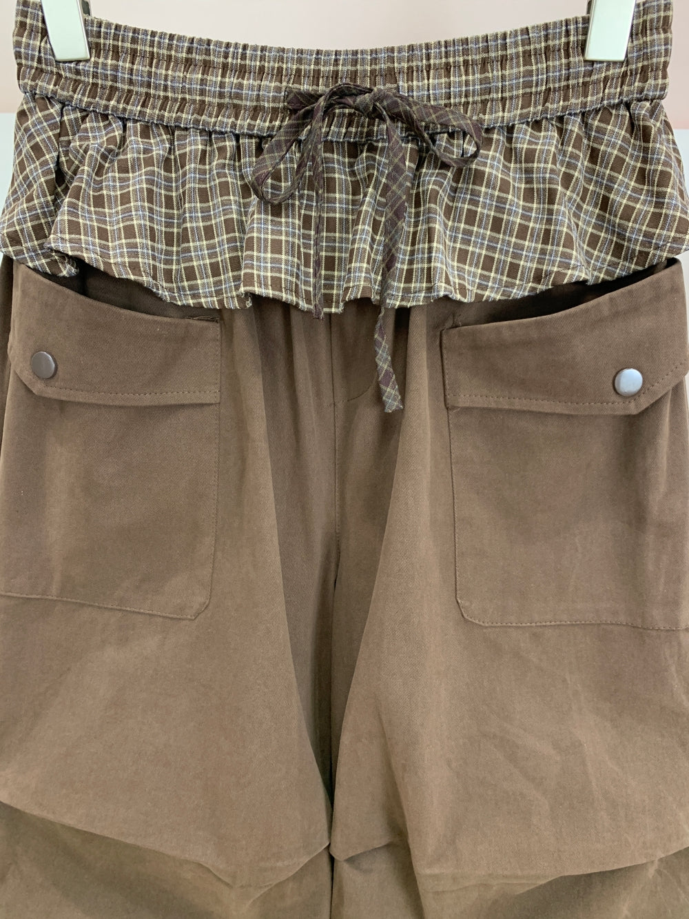 Details: Elastic waist with plaid ruffle trim, flap pockets, adjustable hem ties