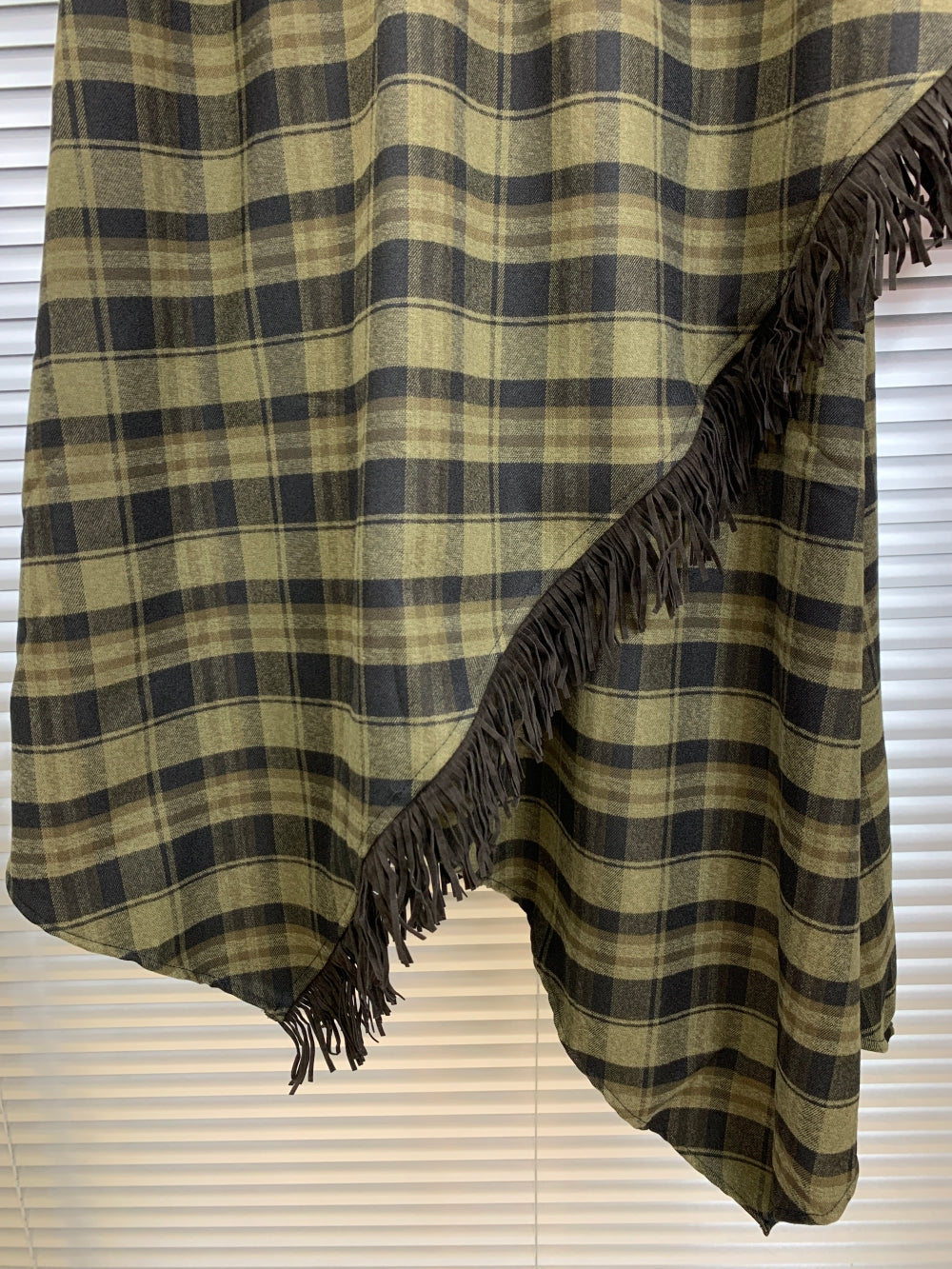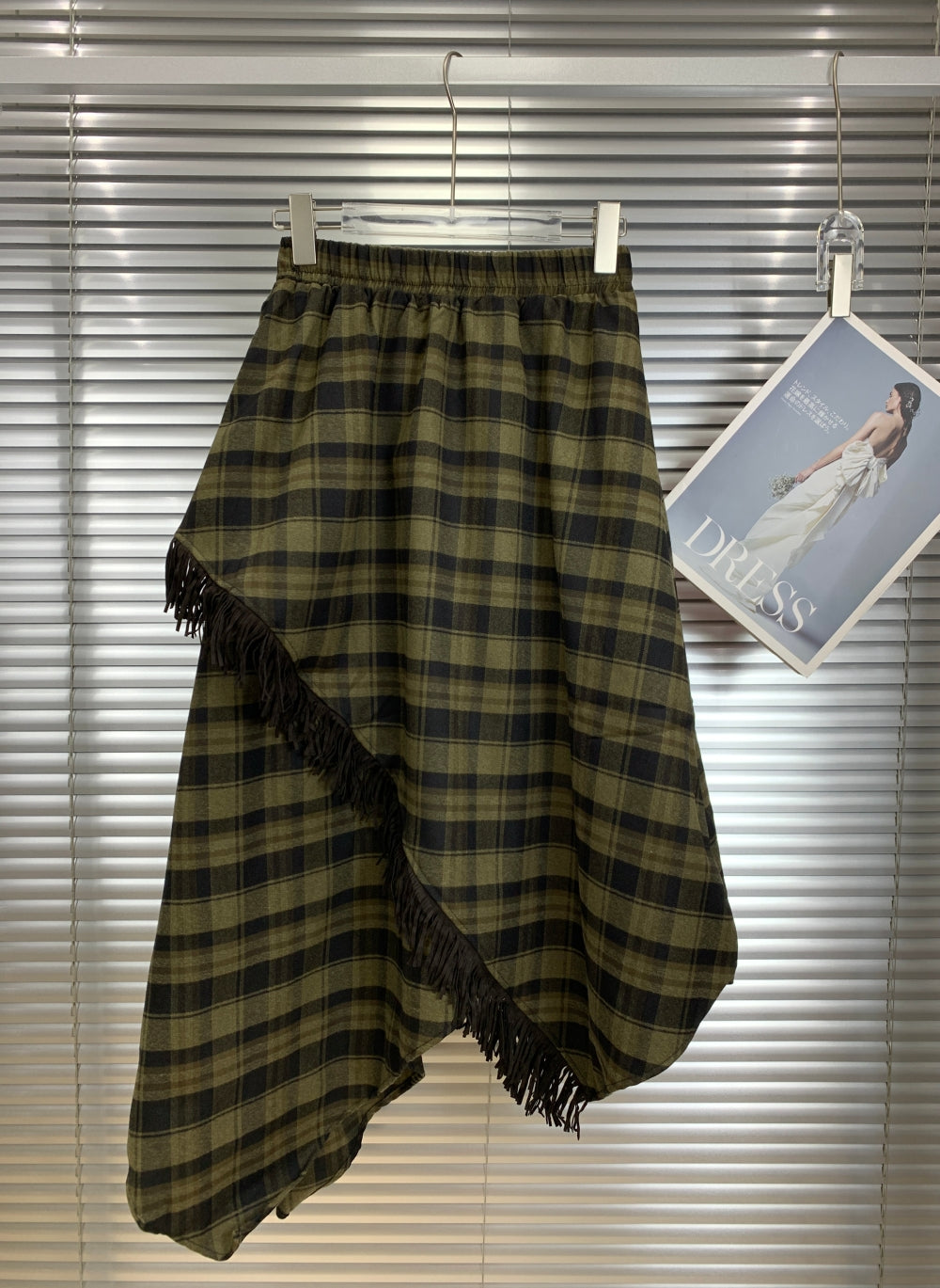 Details: Elastic waist, asymmetric hem with fringe trimming