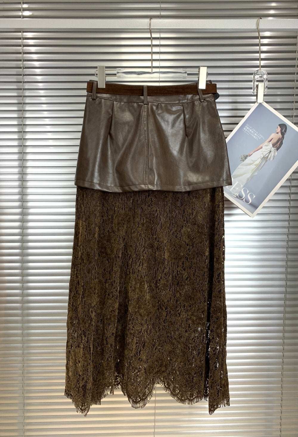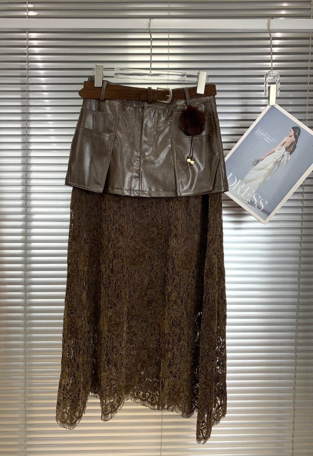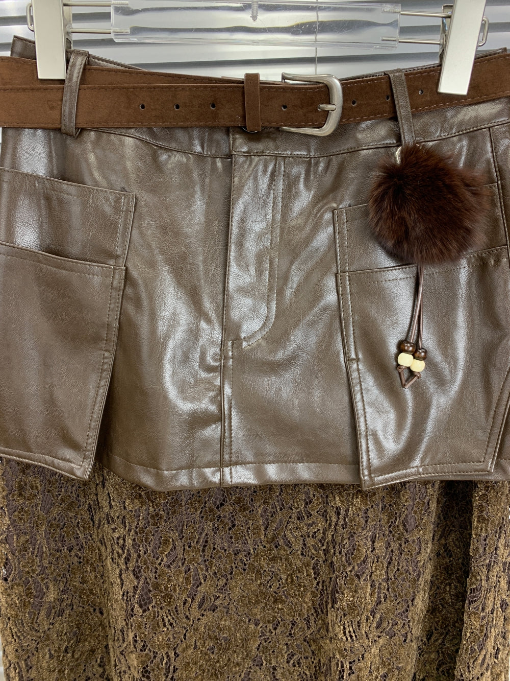 Details: Textured leather top with patch pockets, attached lace bottom layer, decorative belt with fur keychain