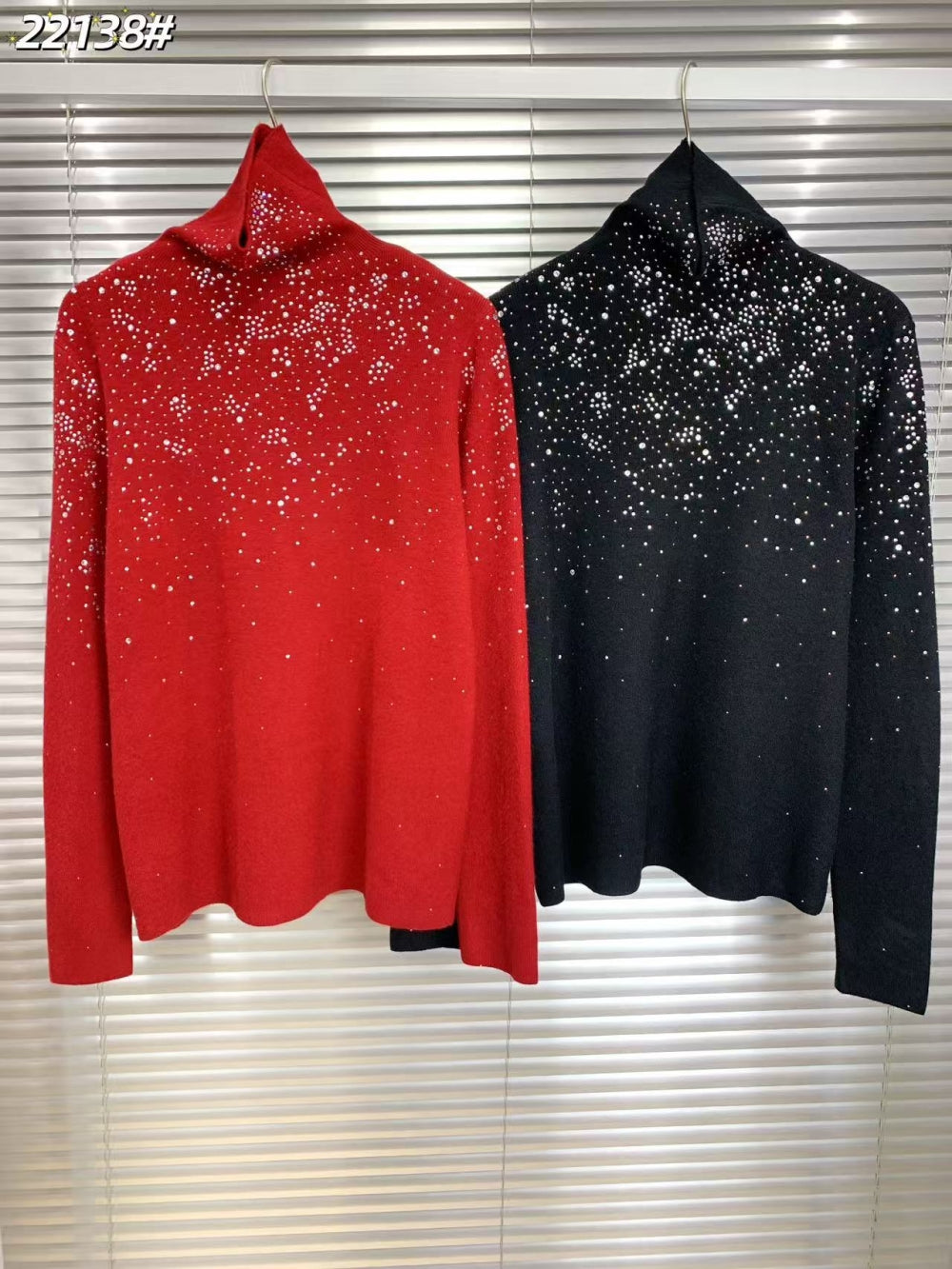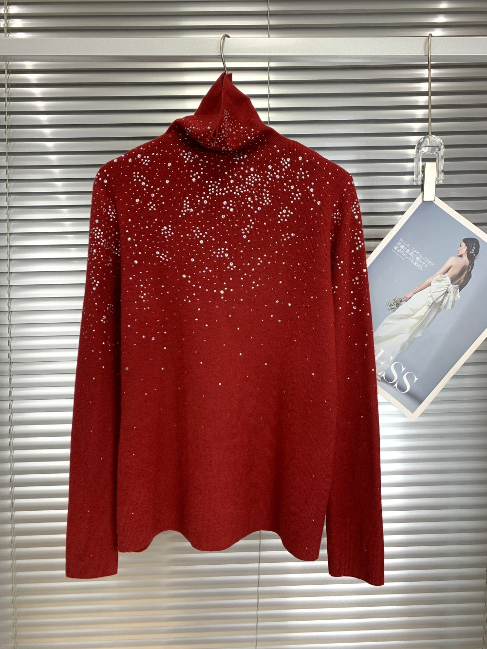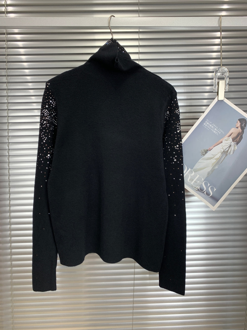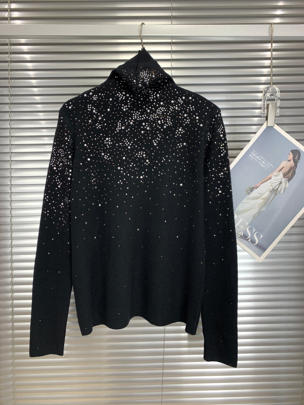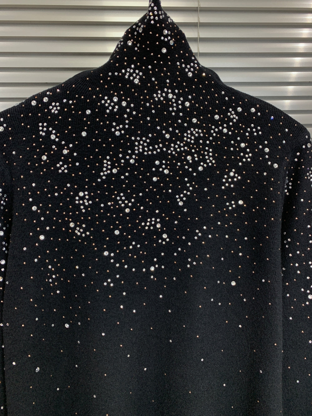 Details: All-over ombre crystal embellishment, high neckline, ribbed cuffs