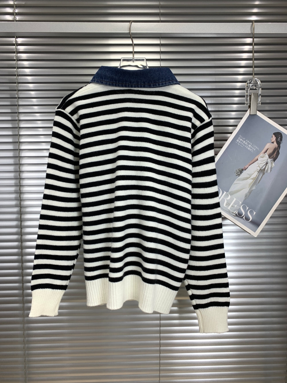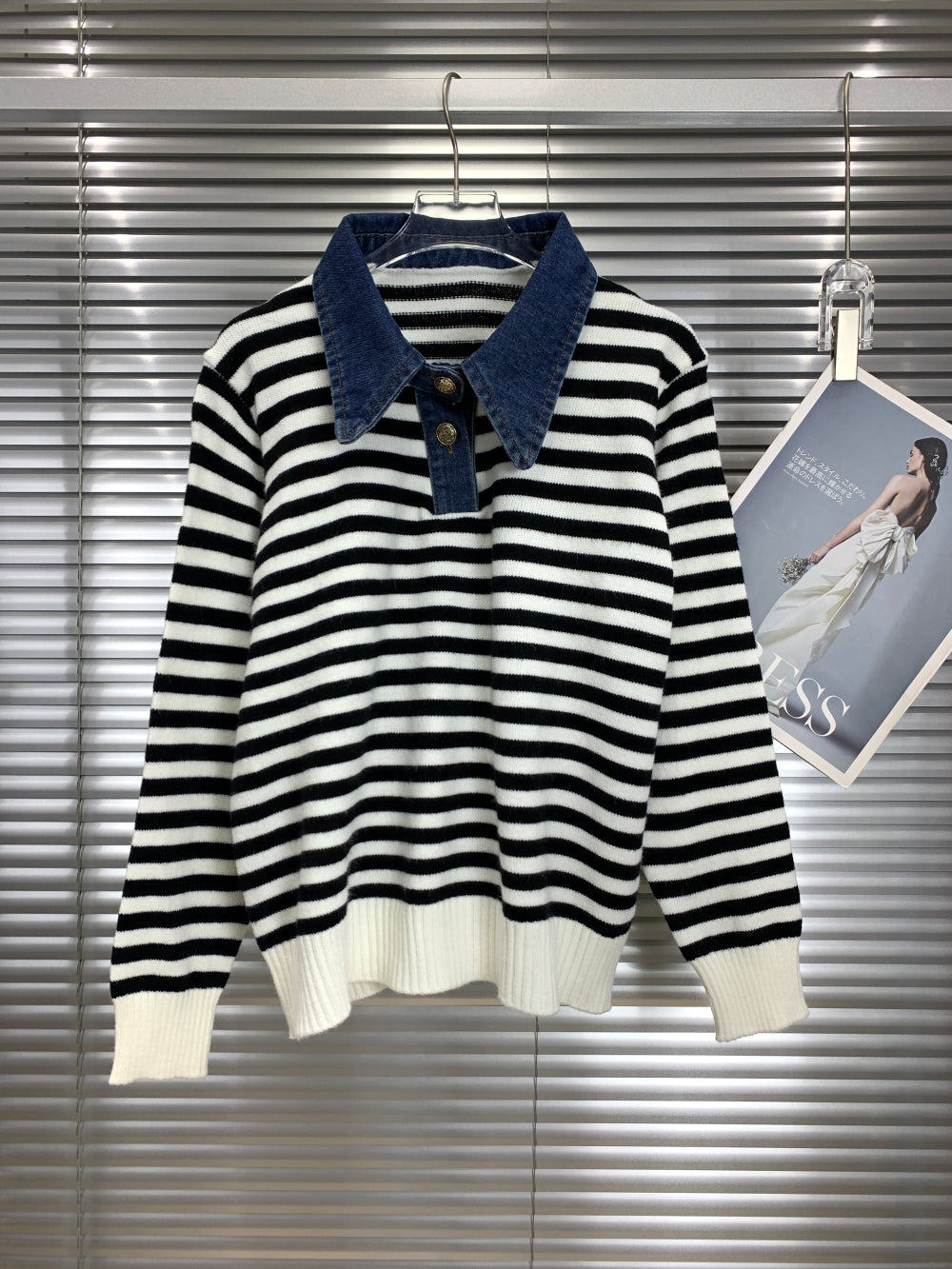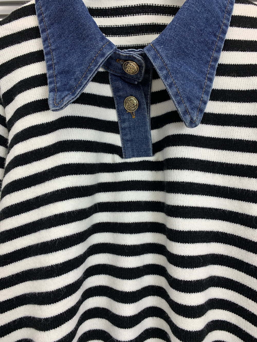 Details: Denim shirt collar, single gold button detail, ribbed edges
