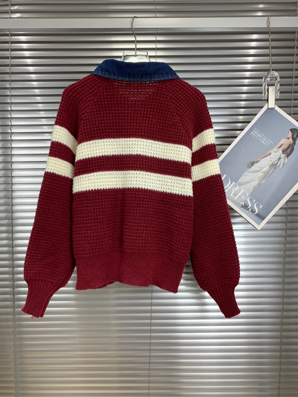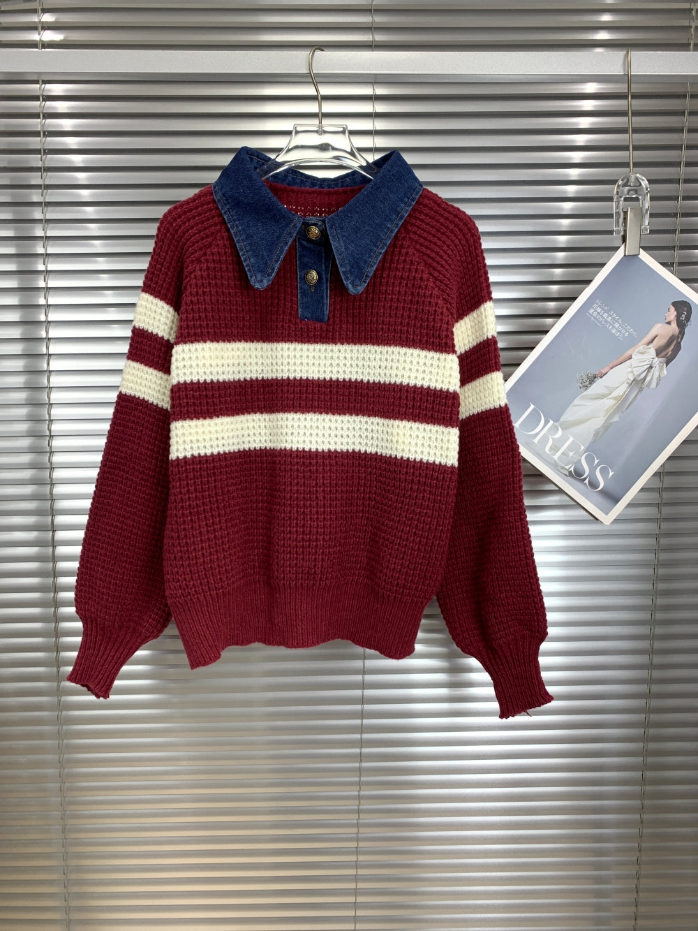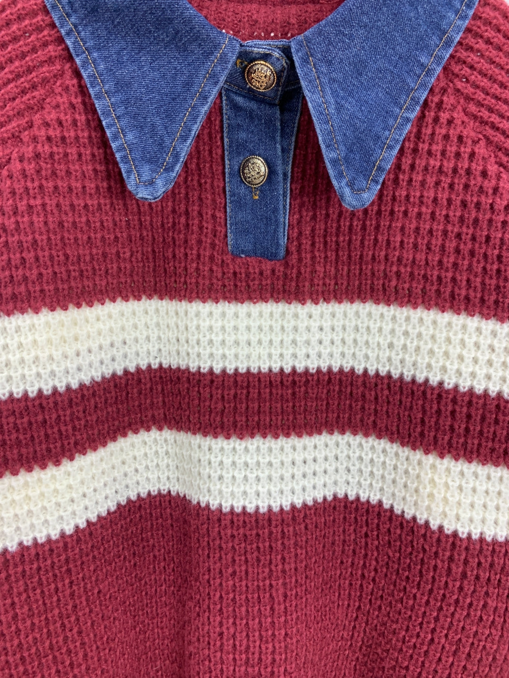 Details: Denim contrast collar and placket, metal button detail, rib hem