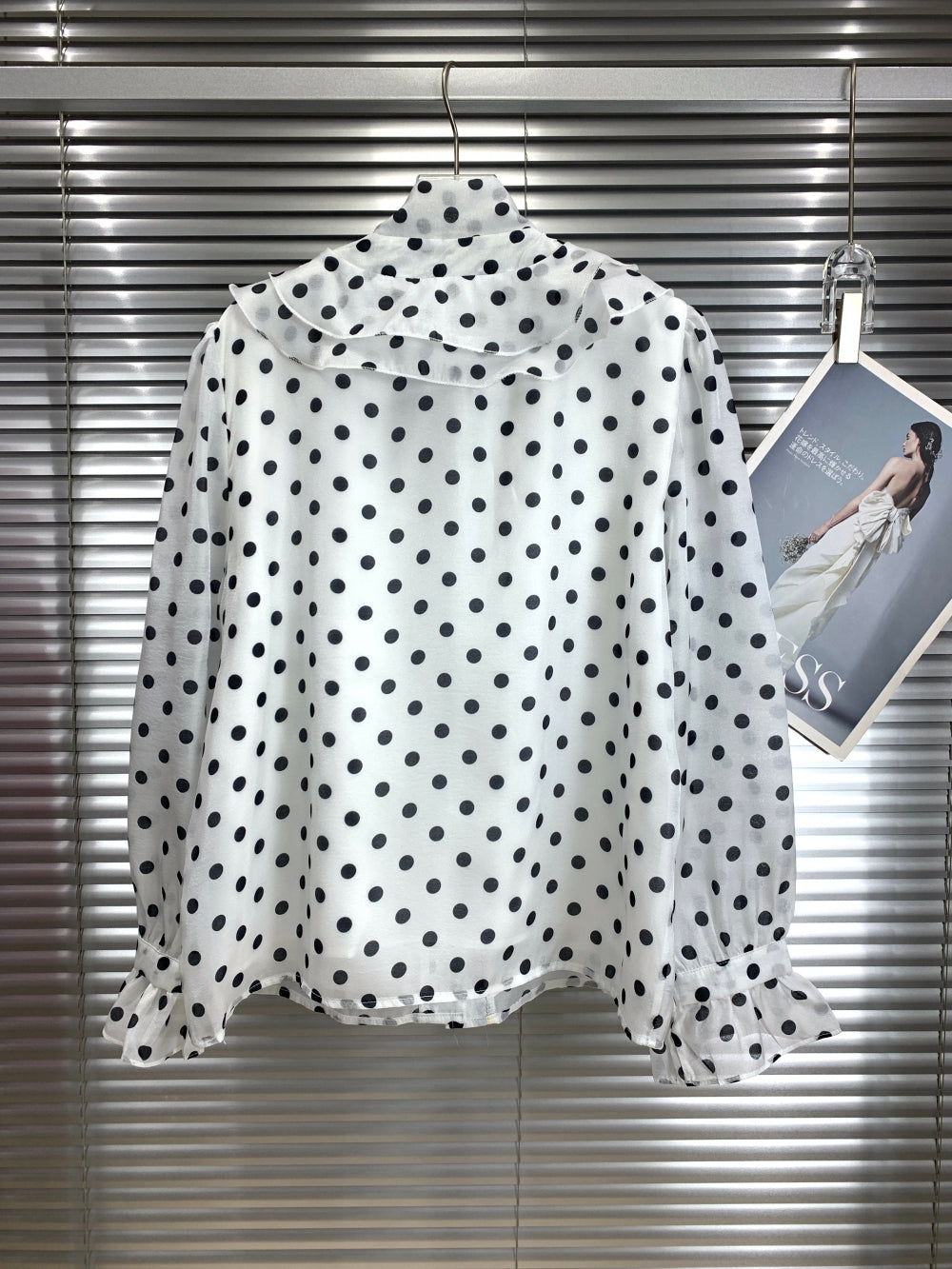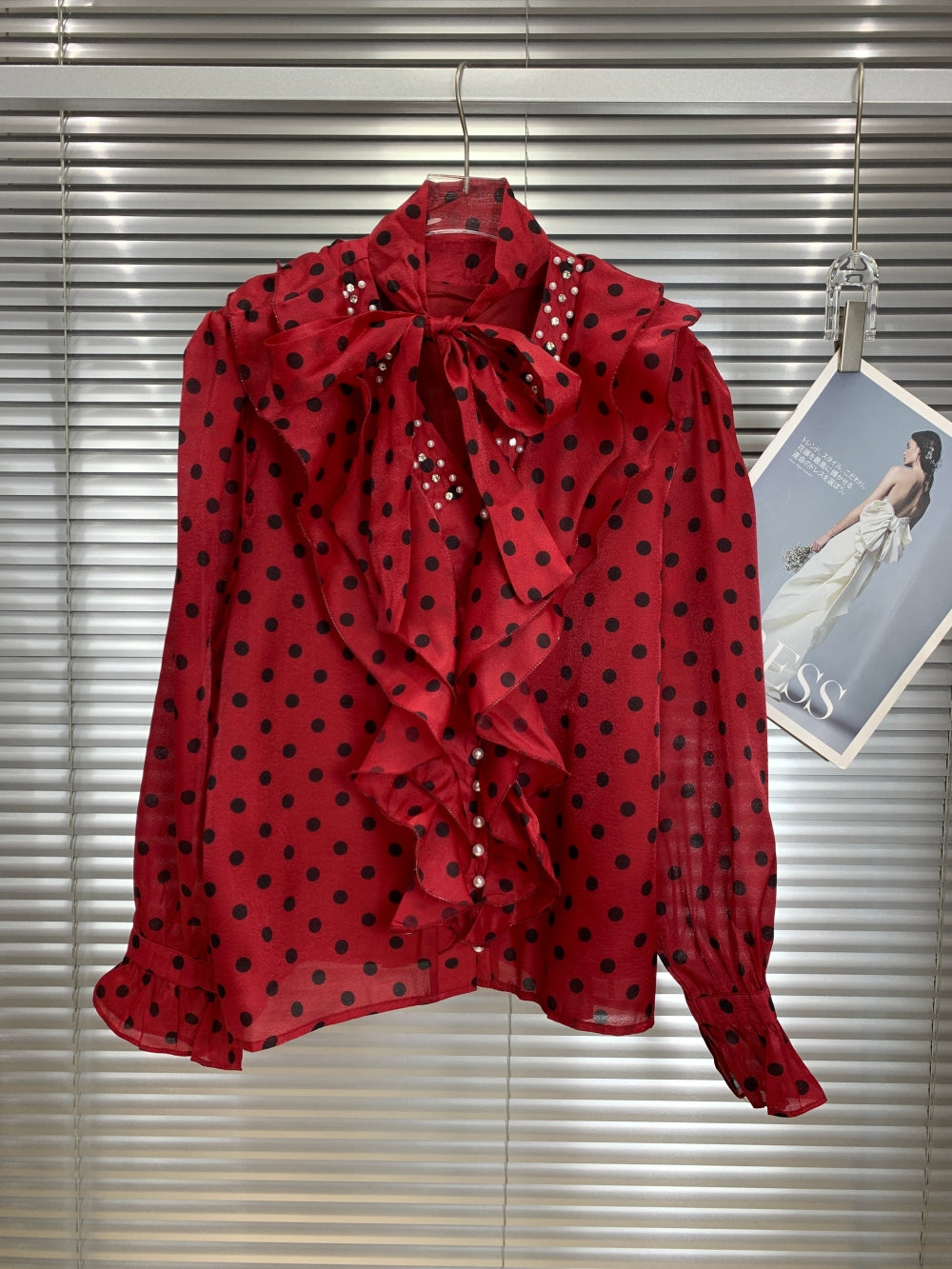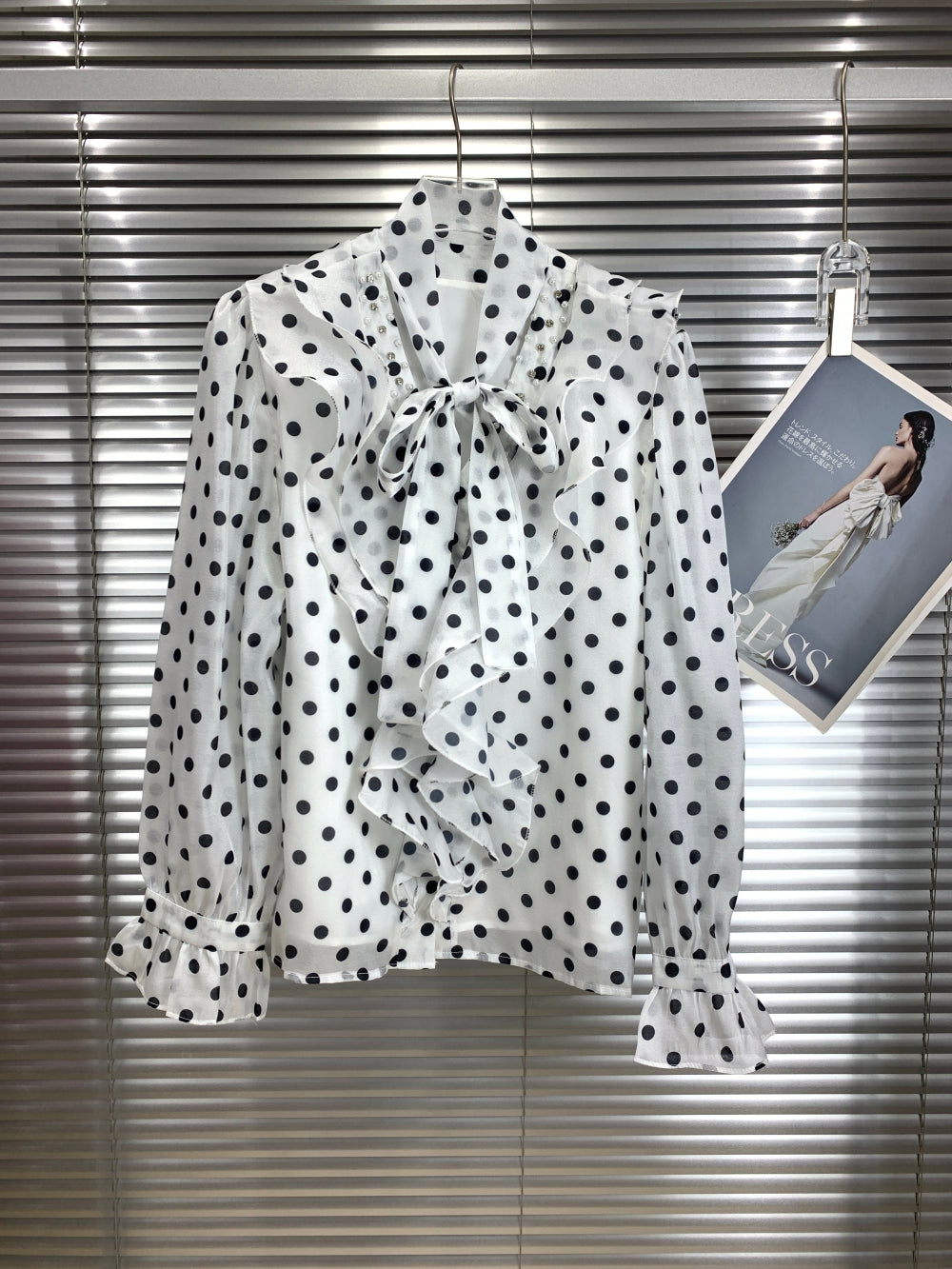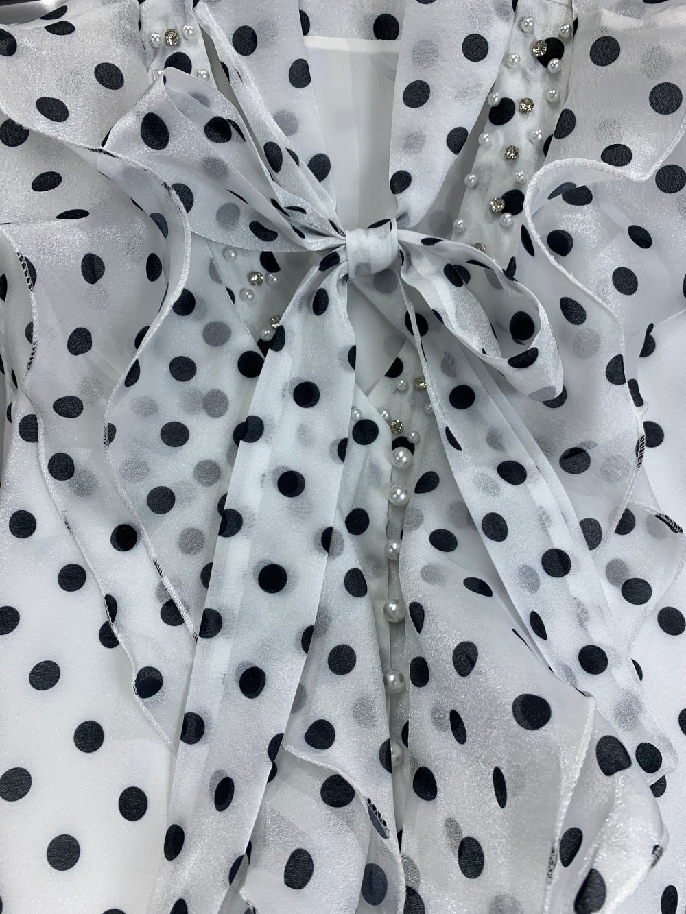 Details: Layered ruffles, pearl button front, bow tie neck, puff sleeves