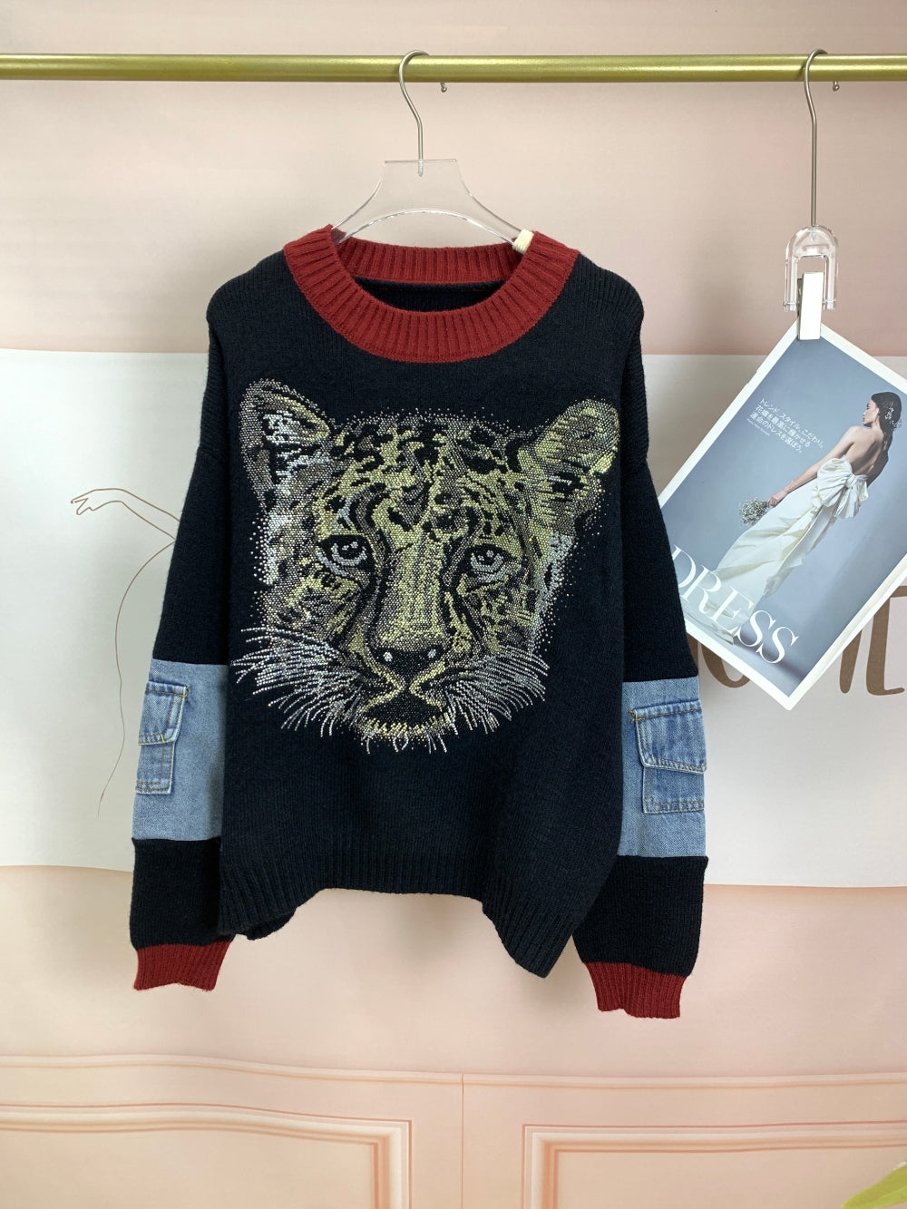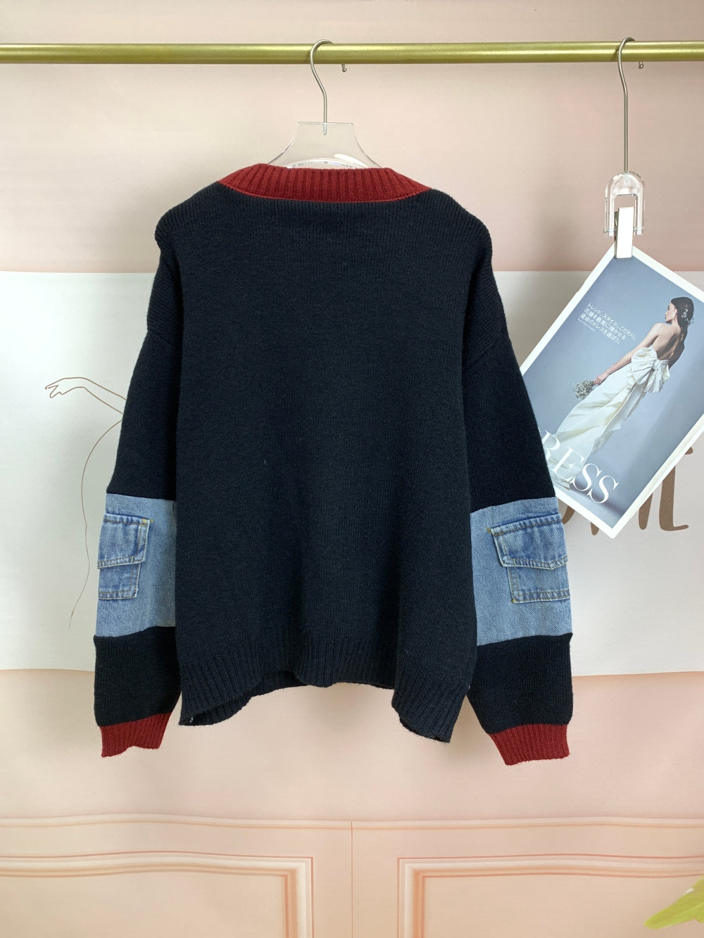 Details: Sequin front, red contrast neckline & cuffs, denim patch pockets