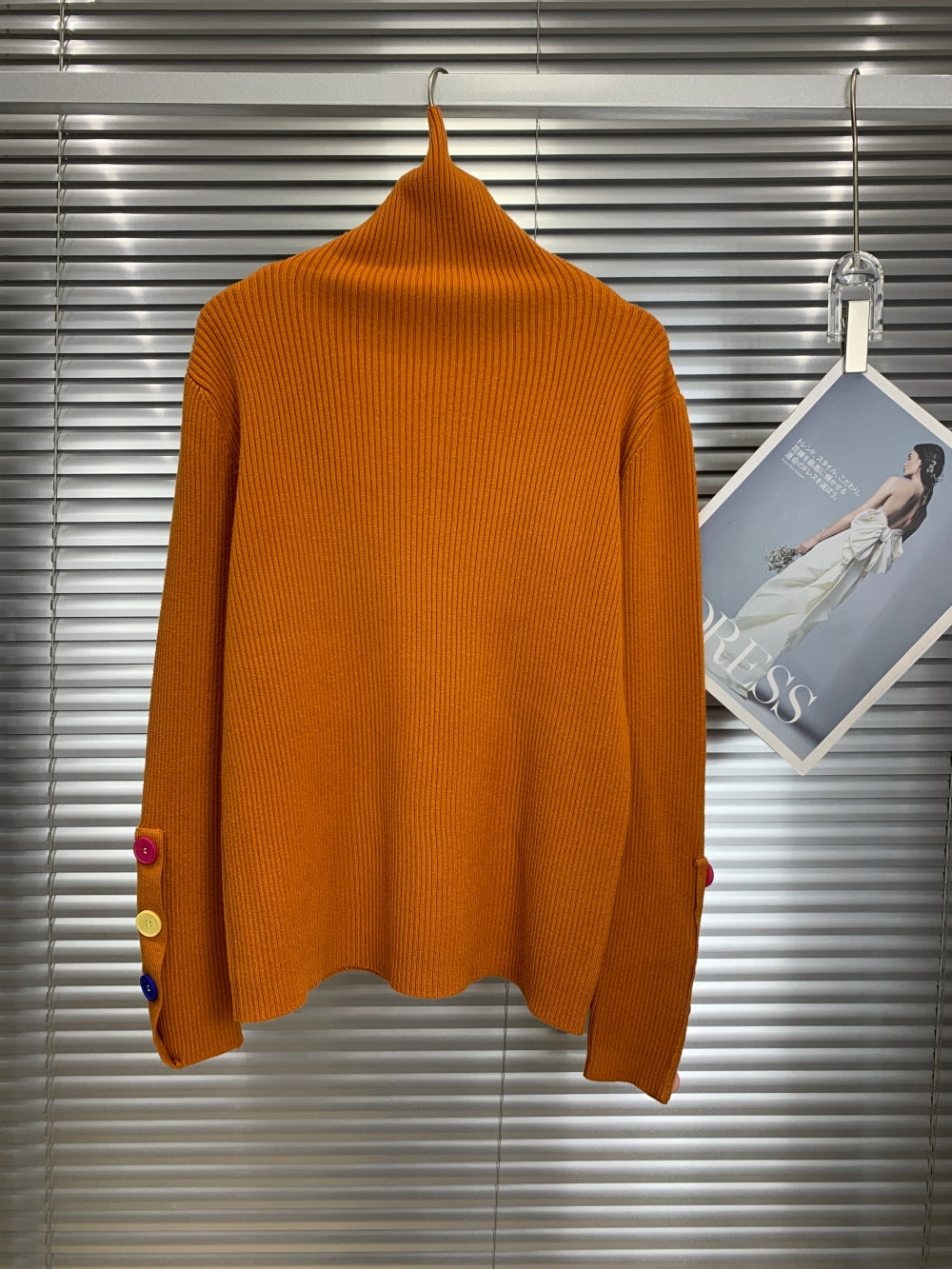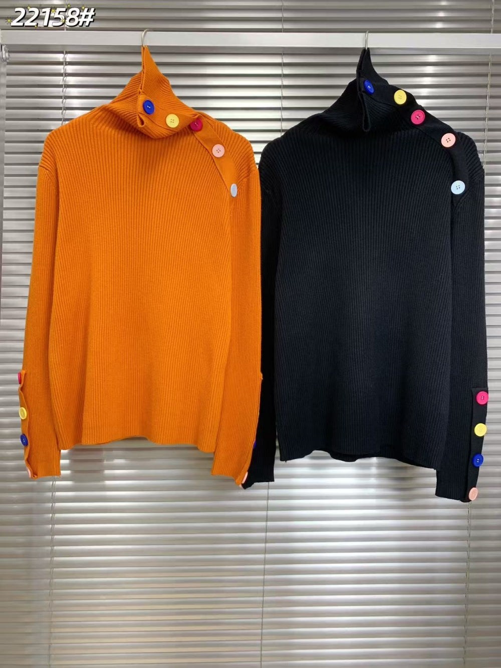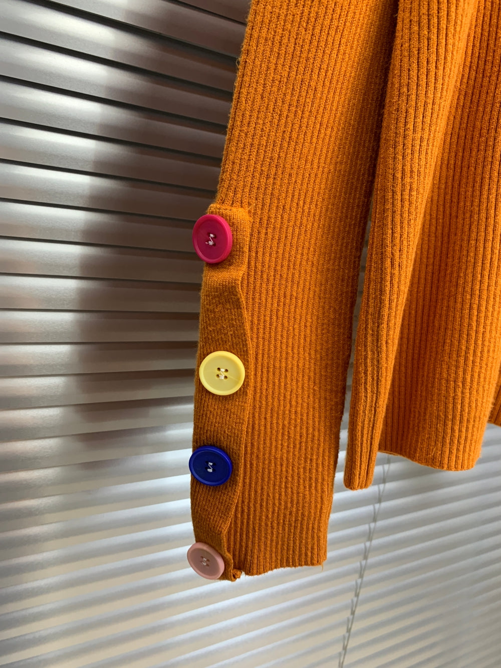 Details: Asymmetric button-down neck and sleeve placket, multi-color button accents