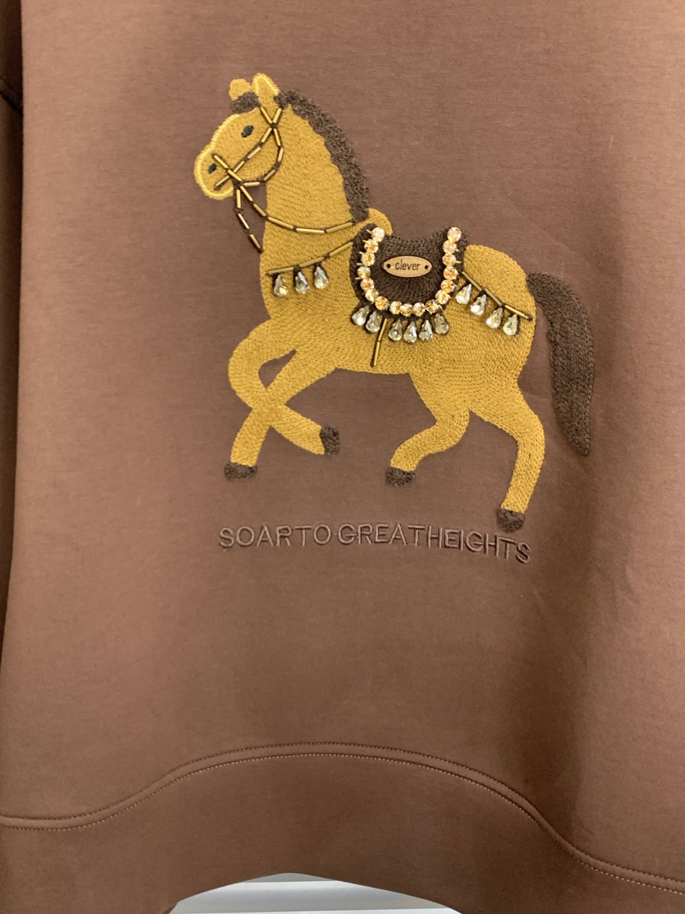 Details: Embroidered horse with beaded accents, drop shoulder, ribbed cuffs and hem