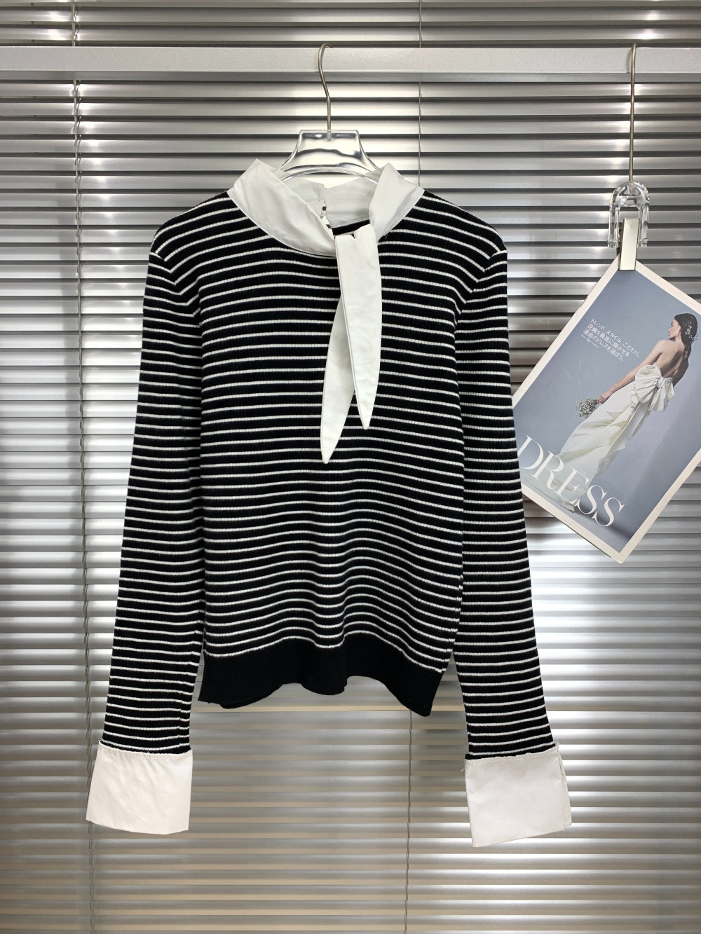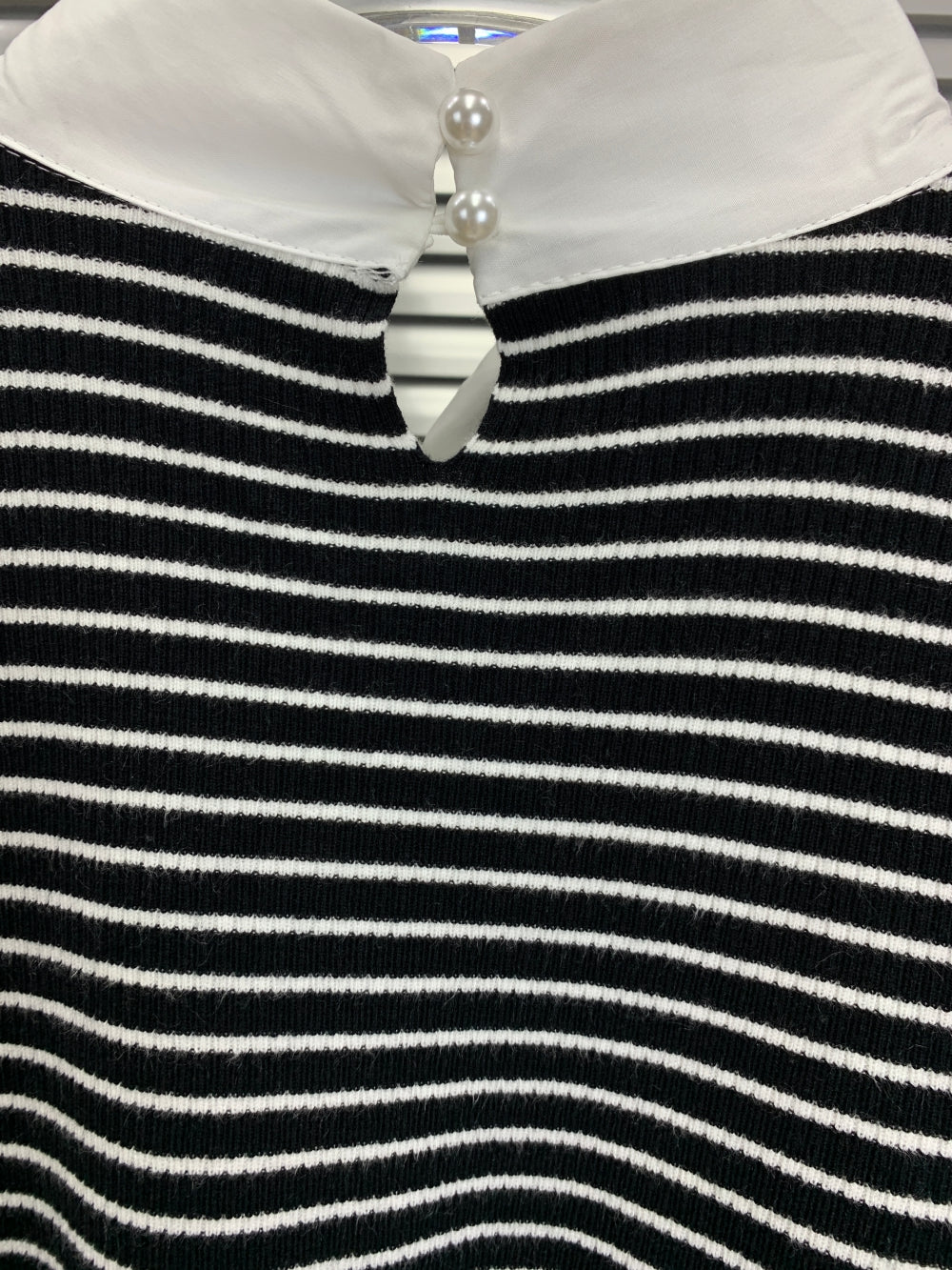 Details: Contrast white collar and cuffs, partial button front placket, long sleeves
