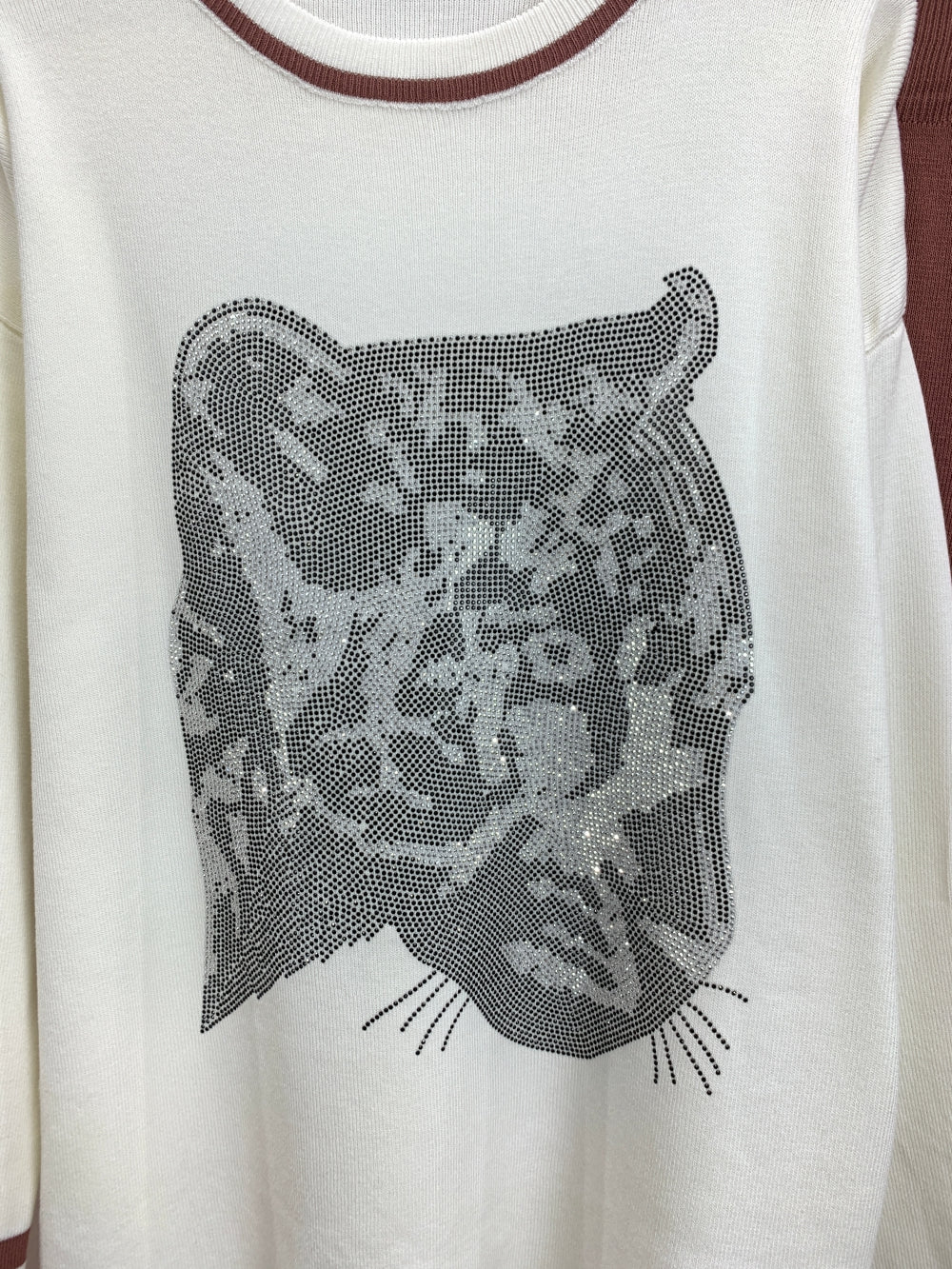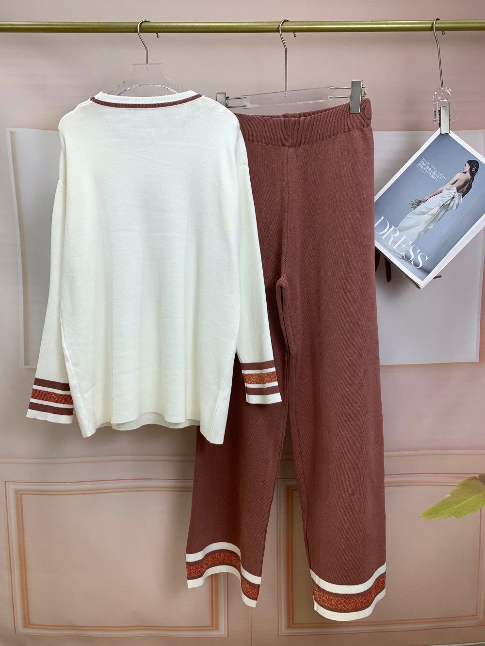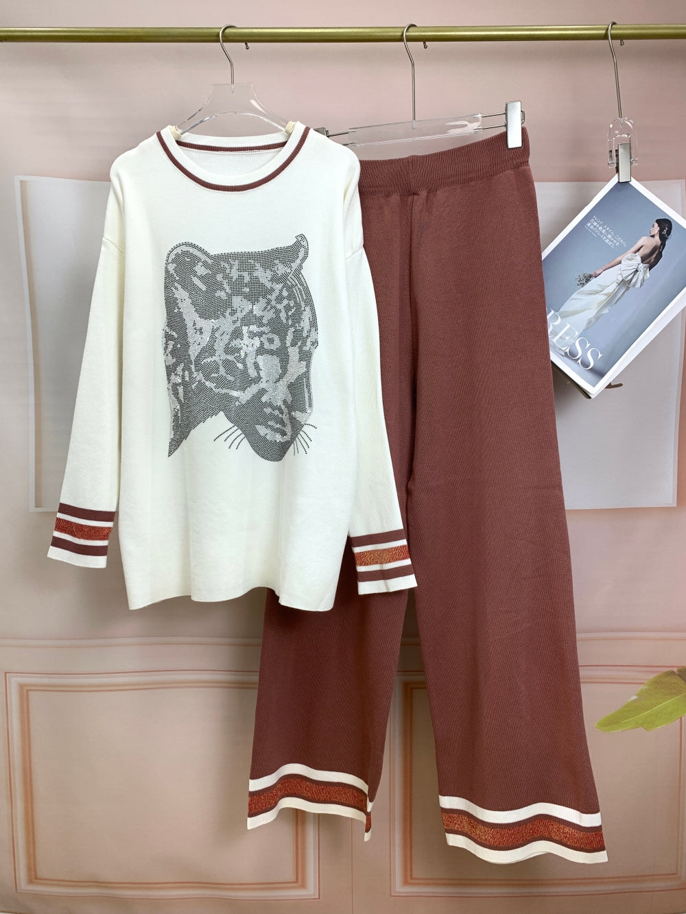 Details: Long-sleeve knit tunic with graphic motif and matching knit pants, both trimmed with sporty red and white stripe cuffs, soft stretch texture