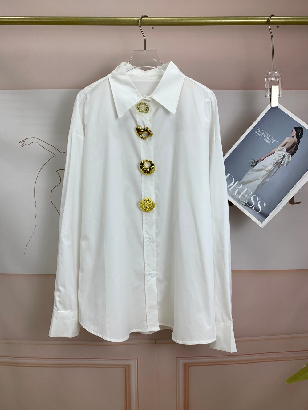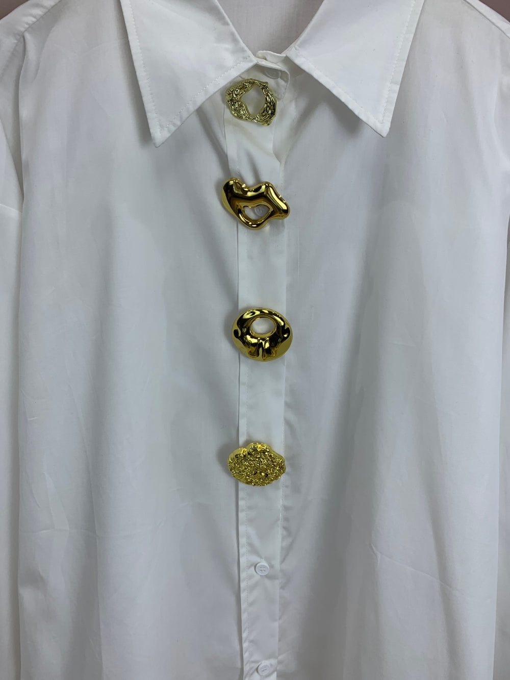 Details: Statement gold sculpted buttons in assorted shapes (ring, lips, flower), structured collar, long sleeves with cuff detail, straight hem