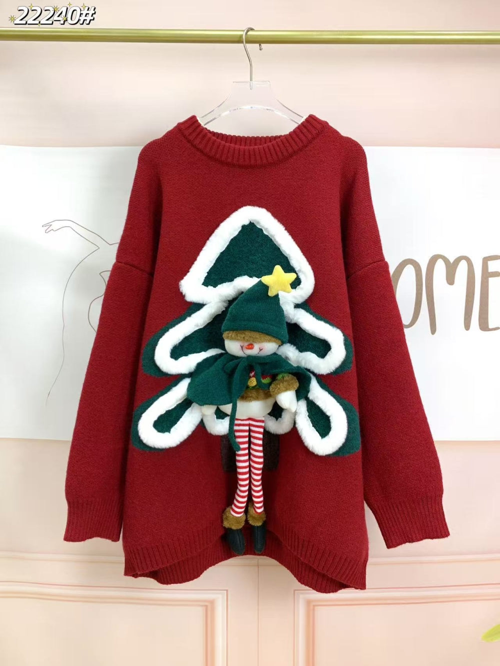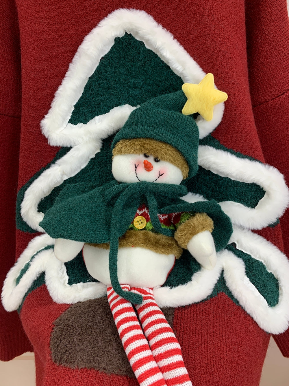 Details: Plush Christmas tree and elf doll embellishment, ribbed neckline and cuffs