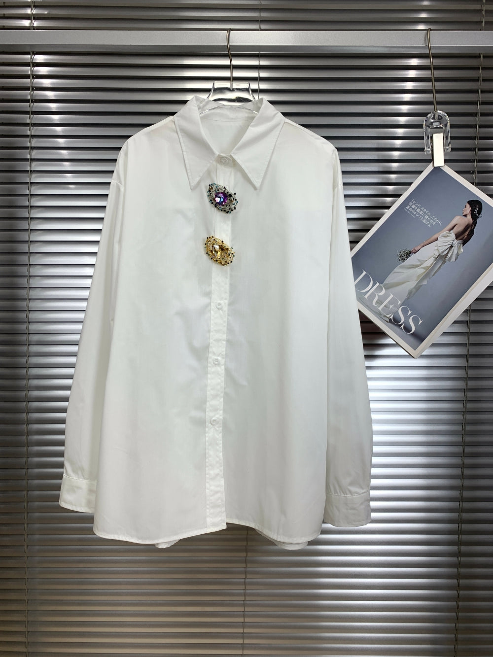 Details: Oversized jeweled buttons in multicolor stones, pointed collar, long sleeves