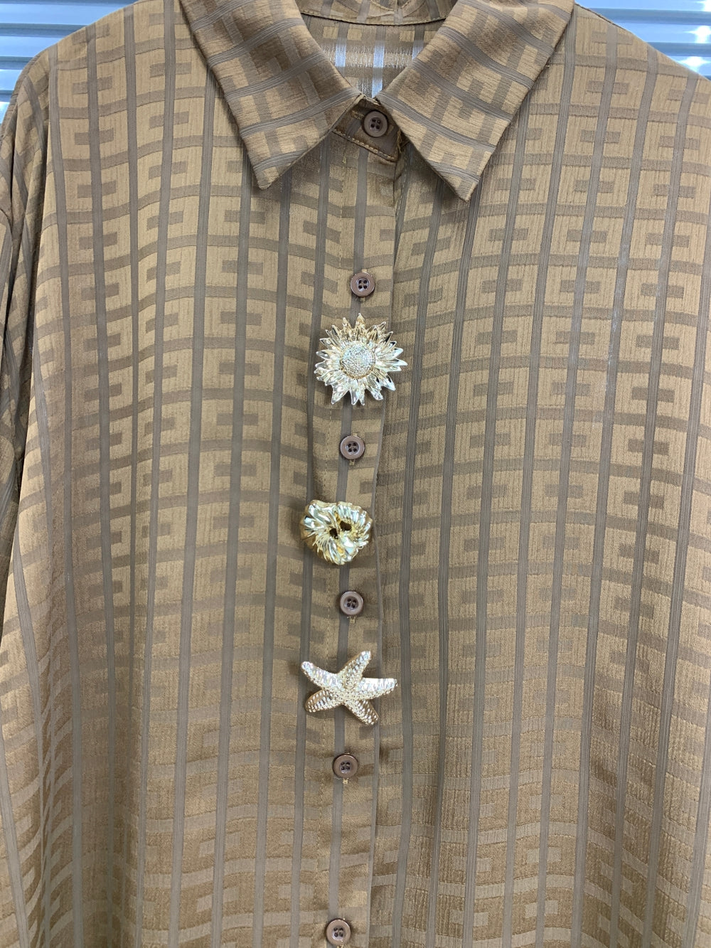 Details: Gold sculptural buttons with starfish accent, pointed collar, drapey fabric