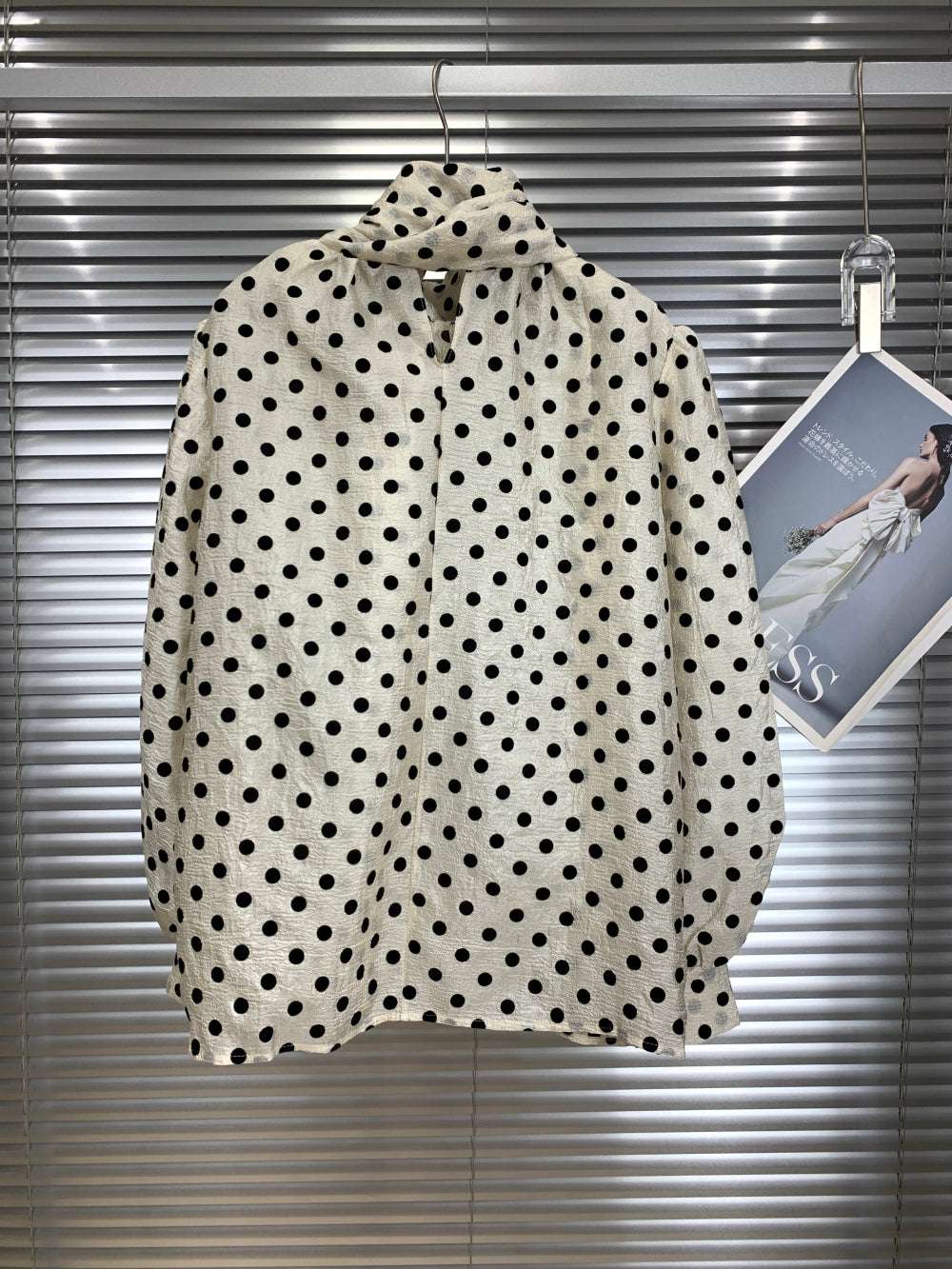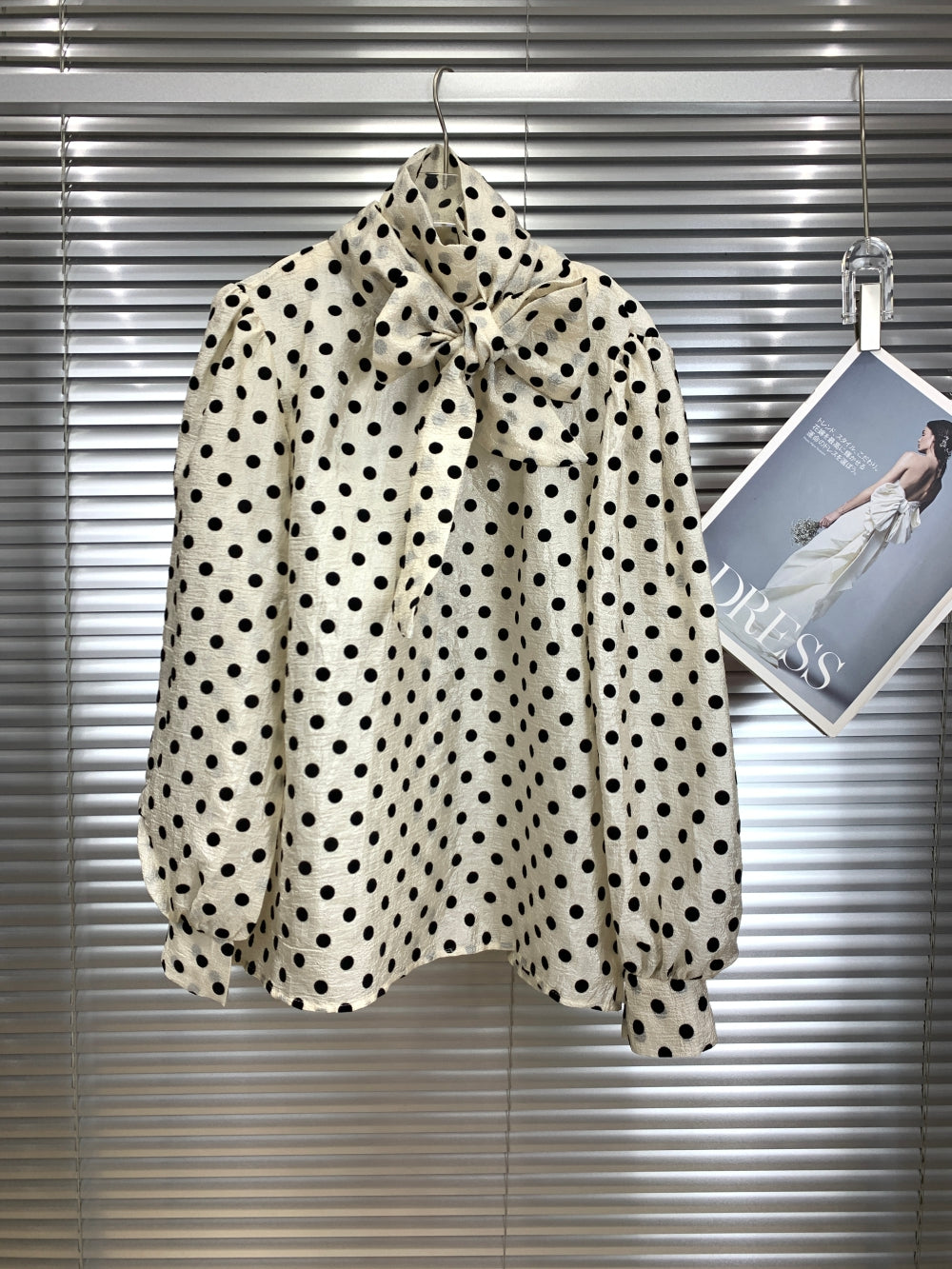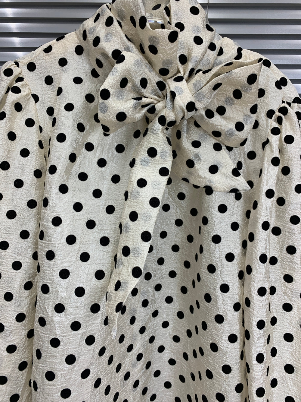 Details: Large bow-tie neck, puffed sleeves, button cuffs