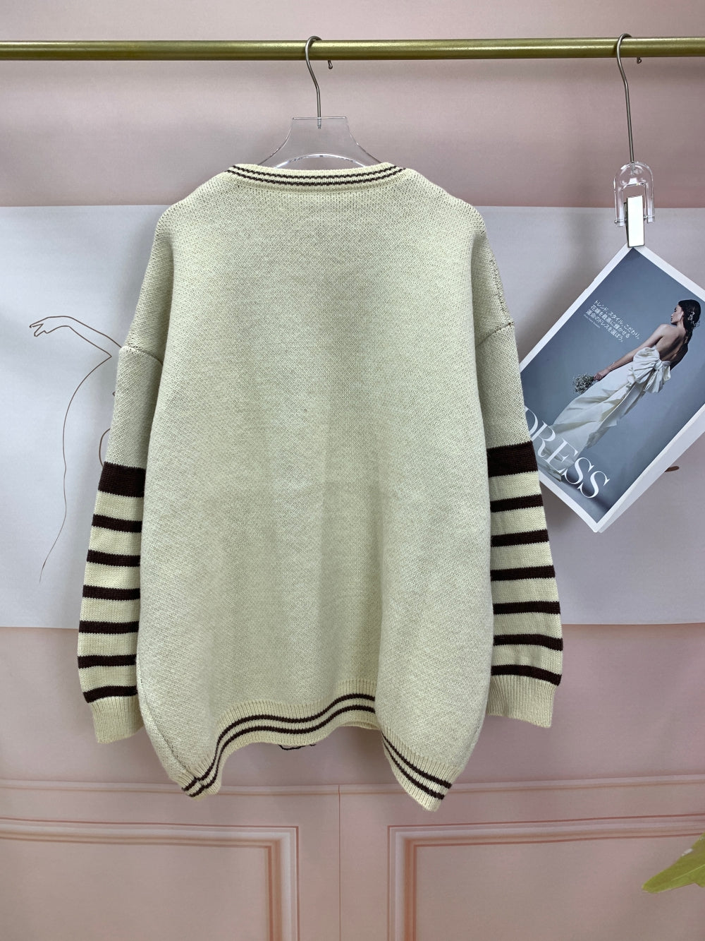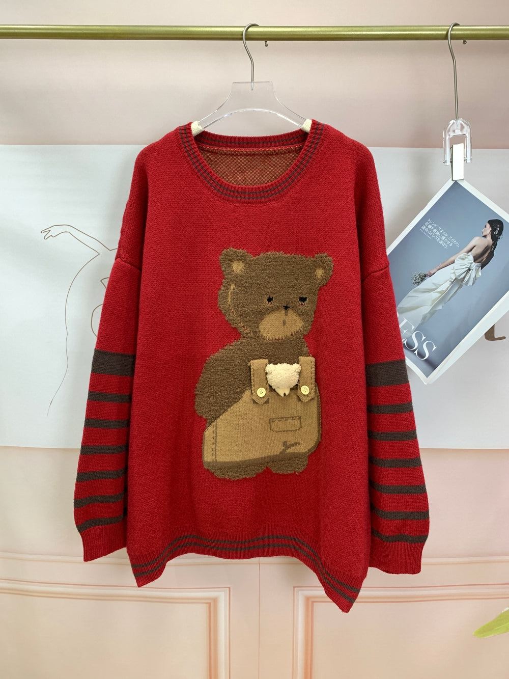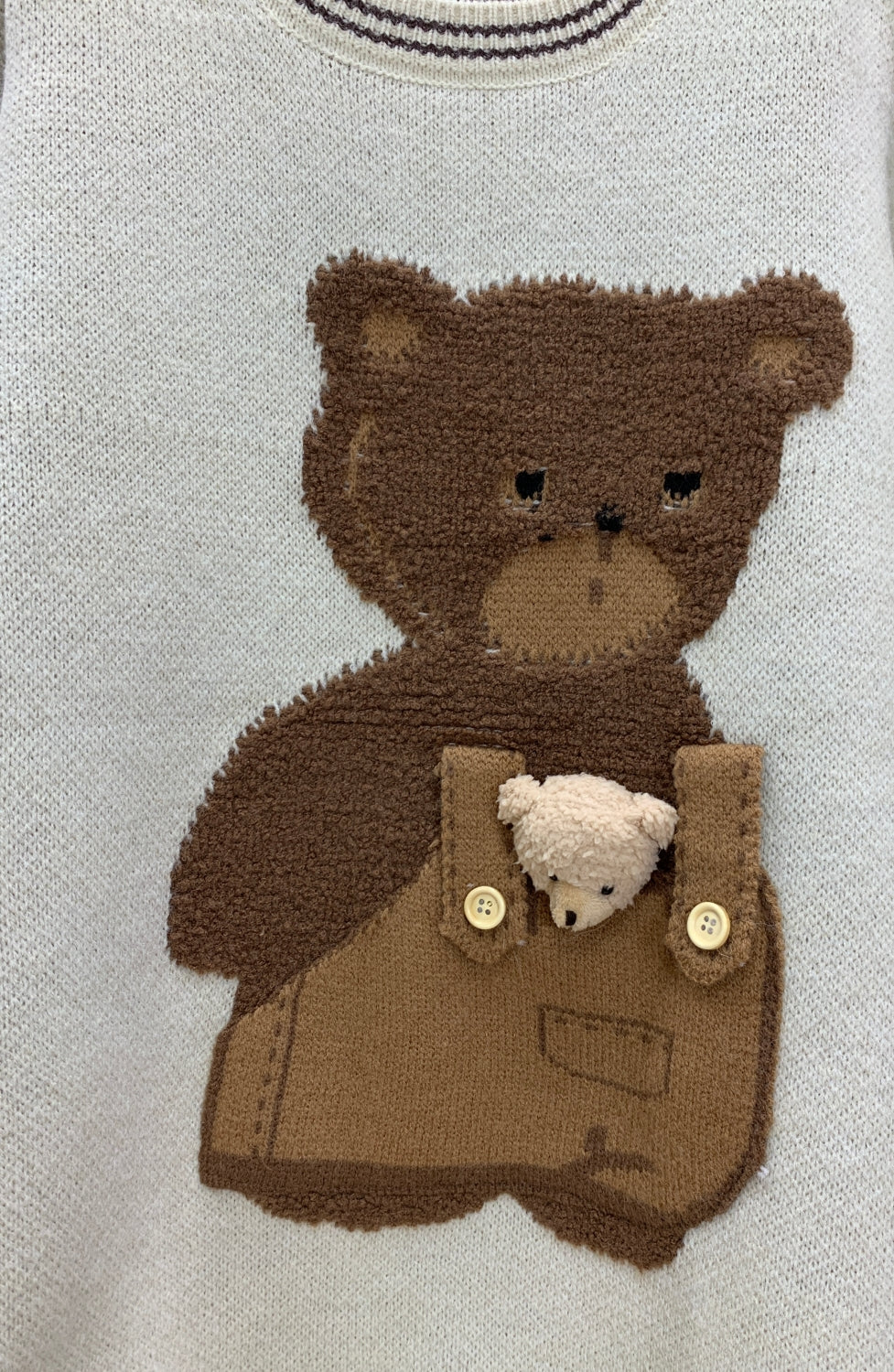 Details: 3D teddy bear applique in overalls, contrast stripe cuffs and neckline