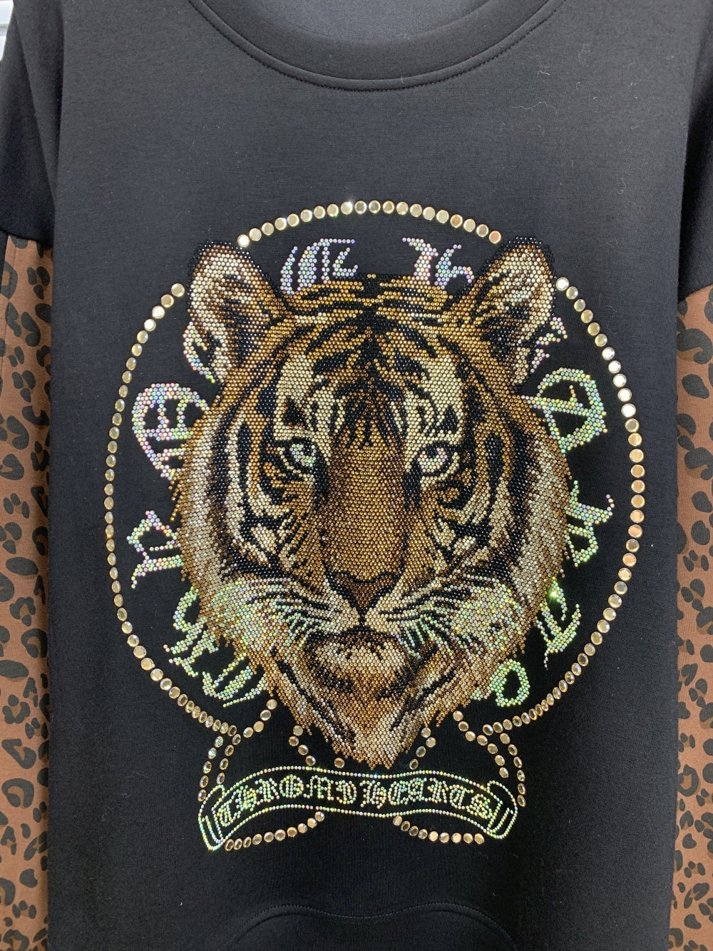 Details: Rhinestone tiger face embellishment, “BOMBHEADS” slogan, ribbed cuffs and hem