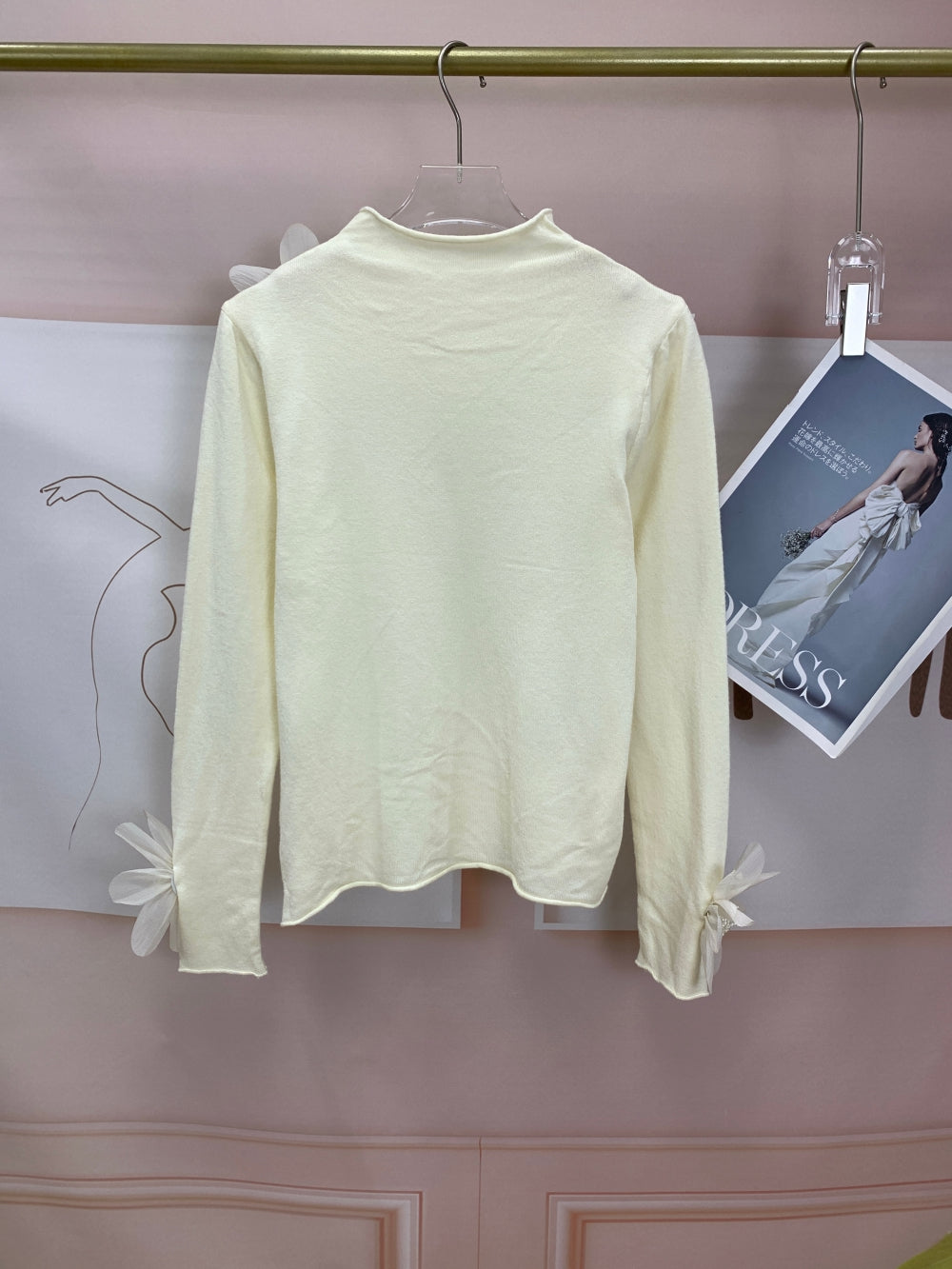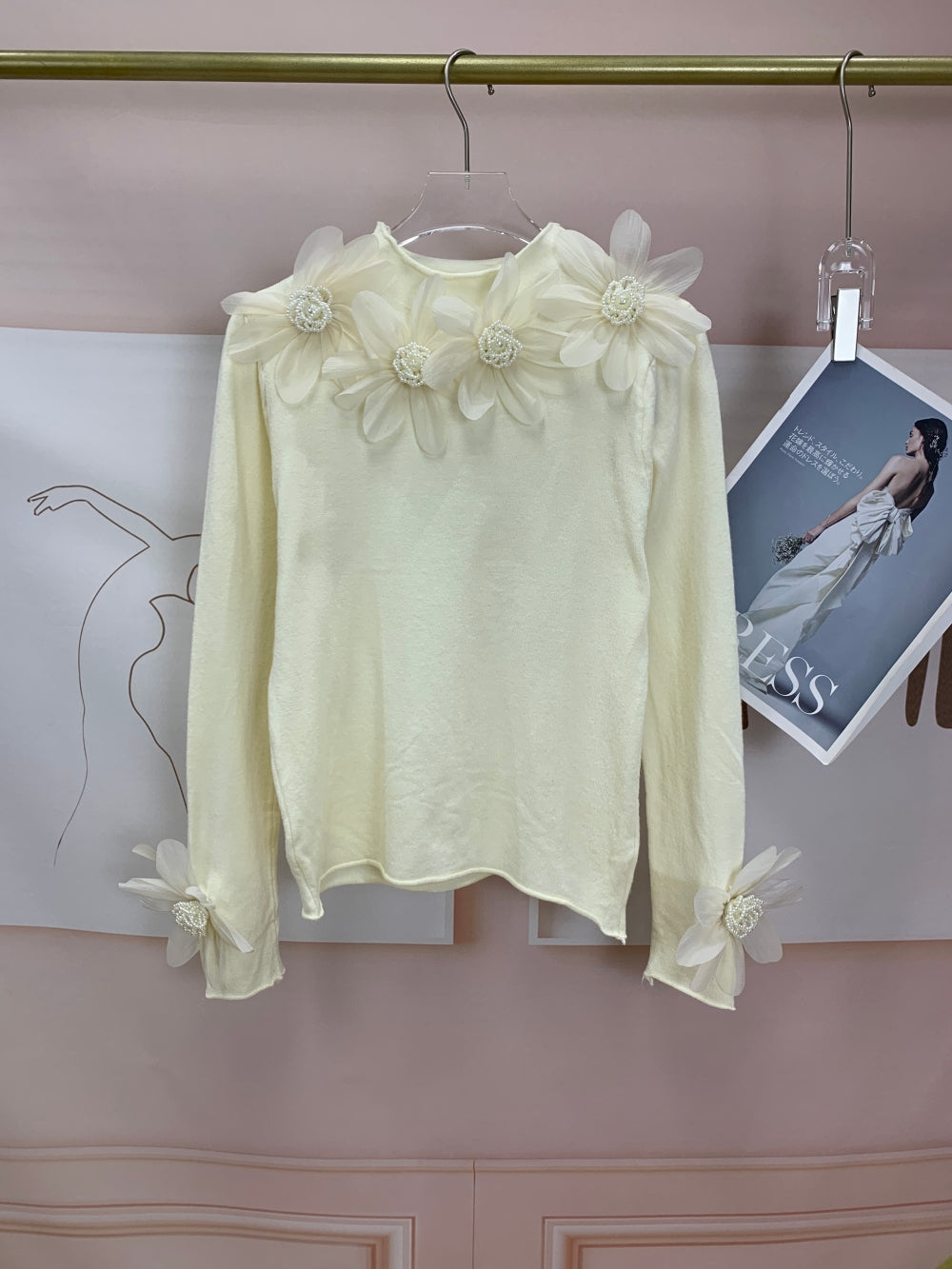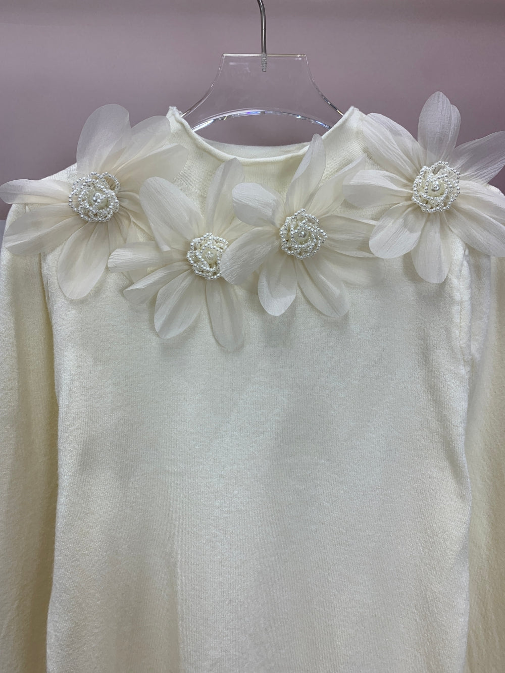 Details: Sheer organza 3D flowers with pearl beaded centers at shoulders and cuffs, soft stretch knit body, round neckline, feminine elegant design