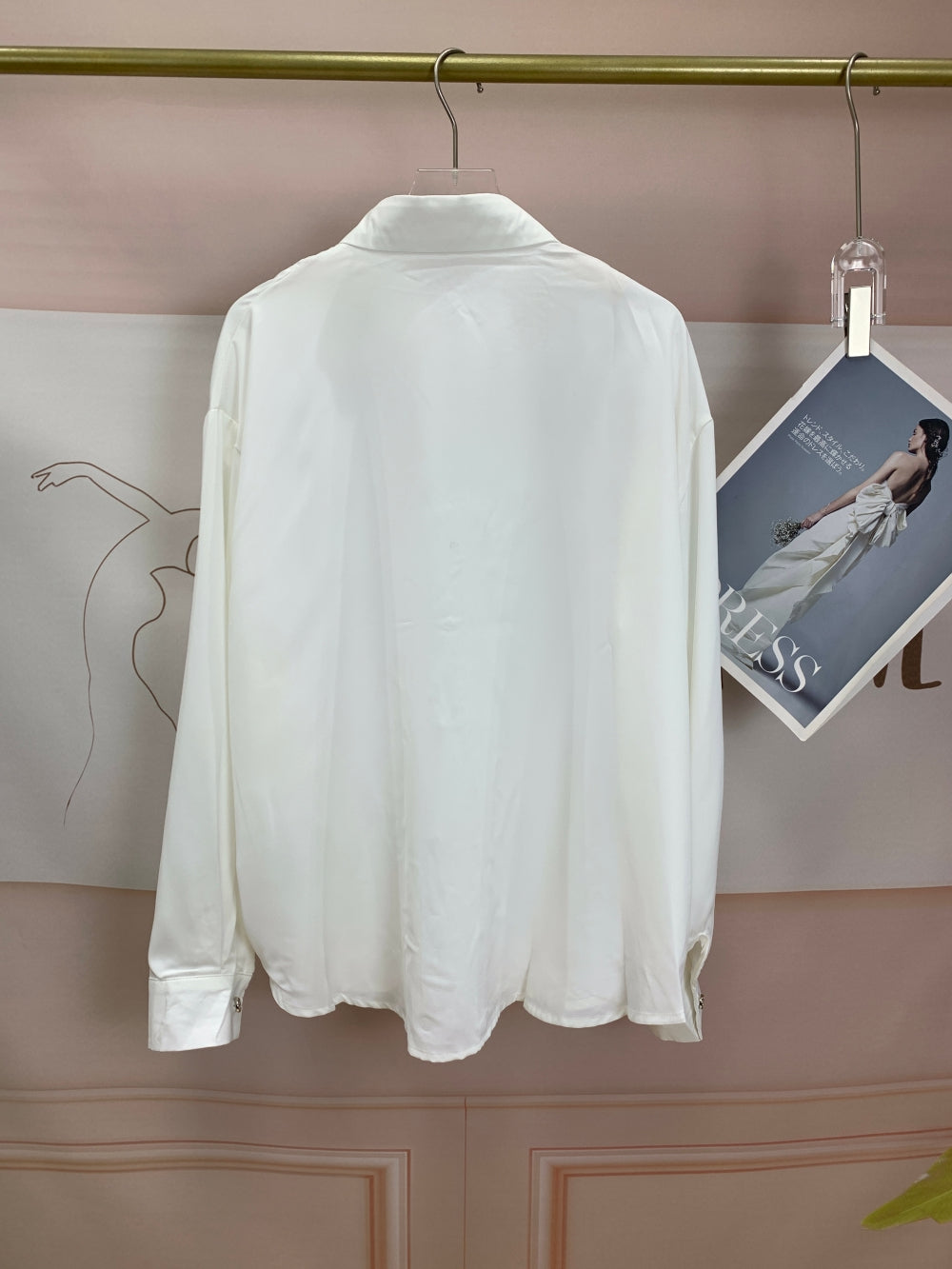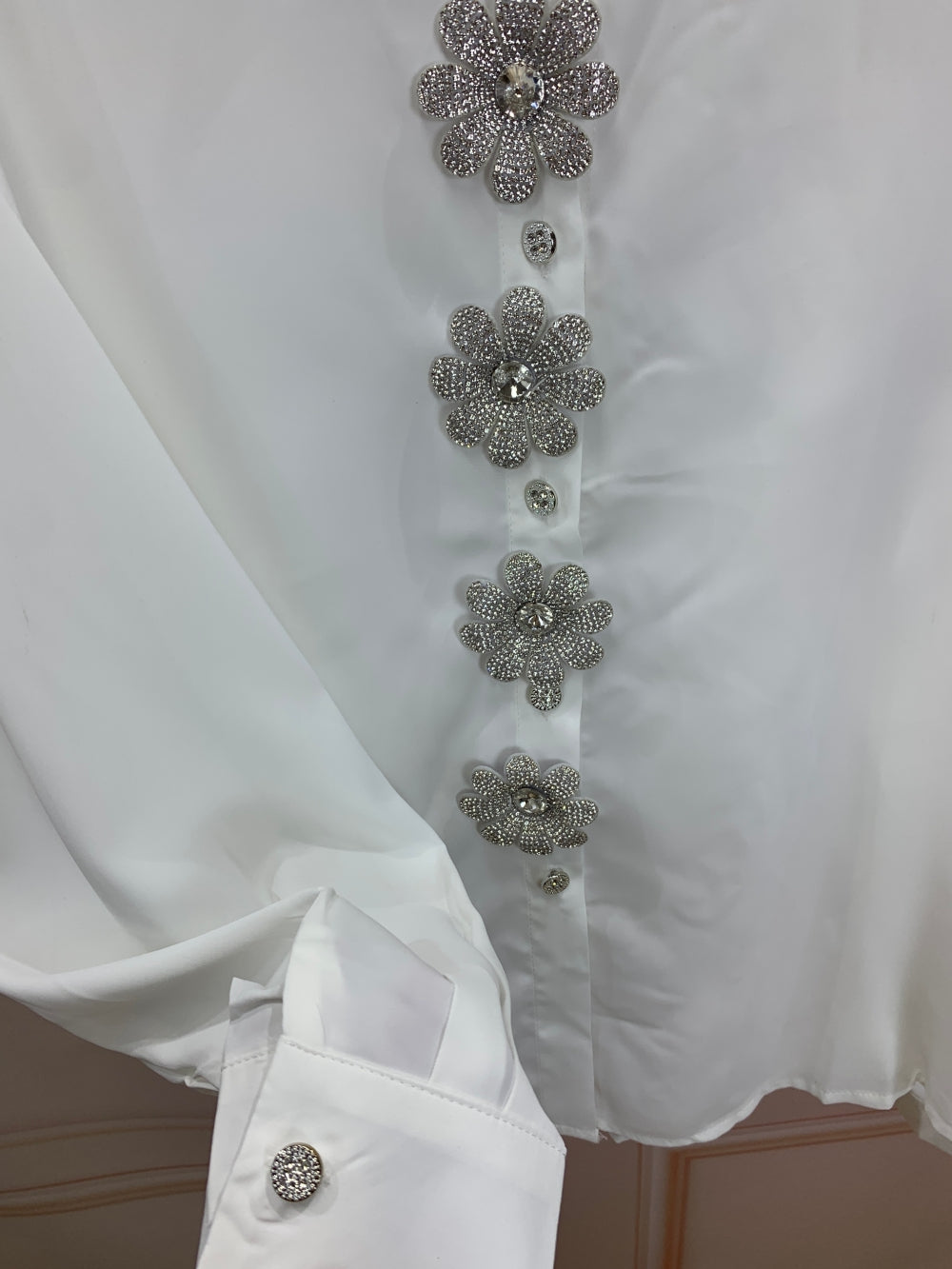 Details: Metallic flower-shaped buttons with rhinestone centers along placket, structured pointed collar, long sleeves with button cuffs