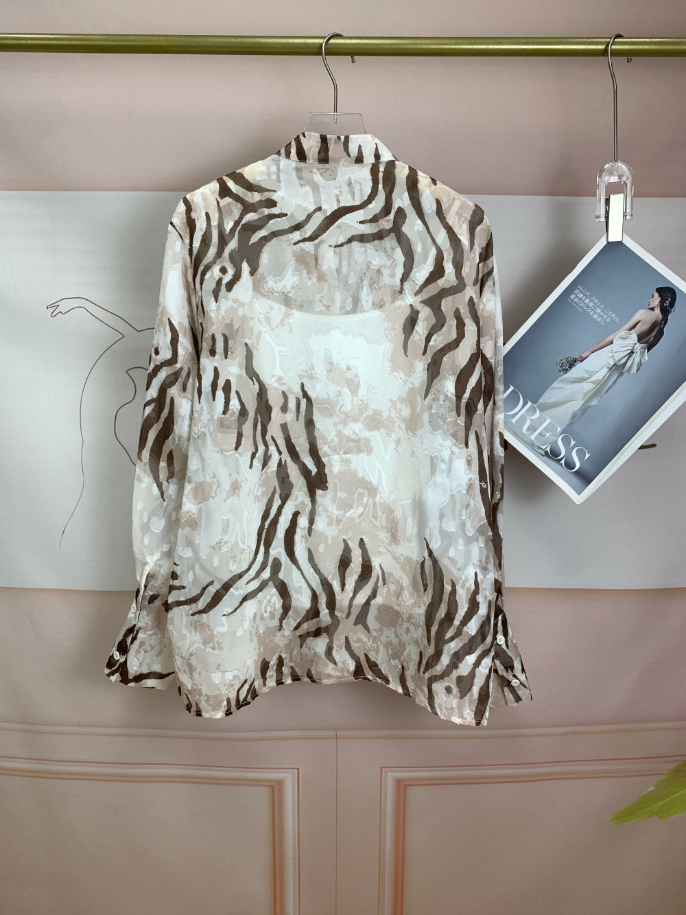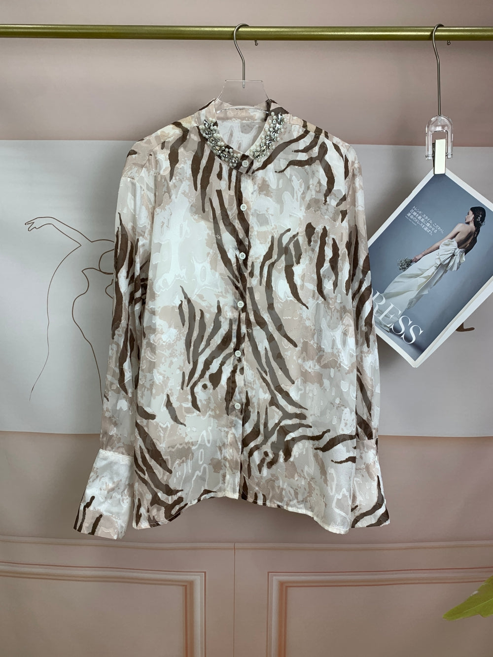 Details: Subtle metallic sheen fabric, jewel-encrusted collar detail, button closure front, fluid drape, long sleeves