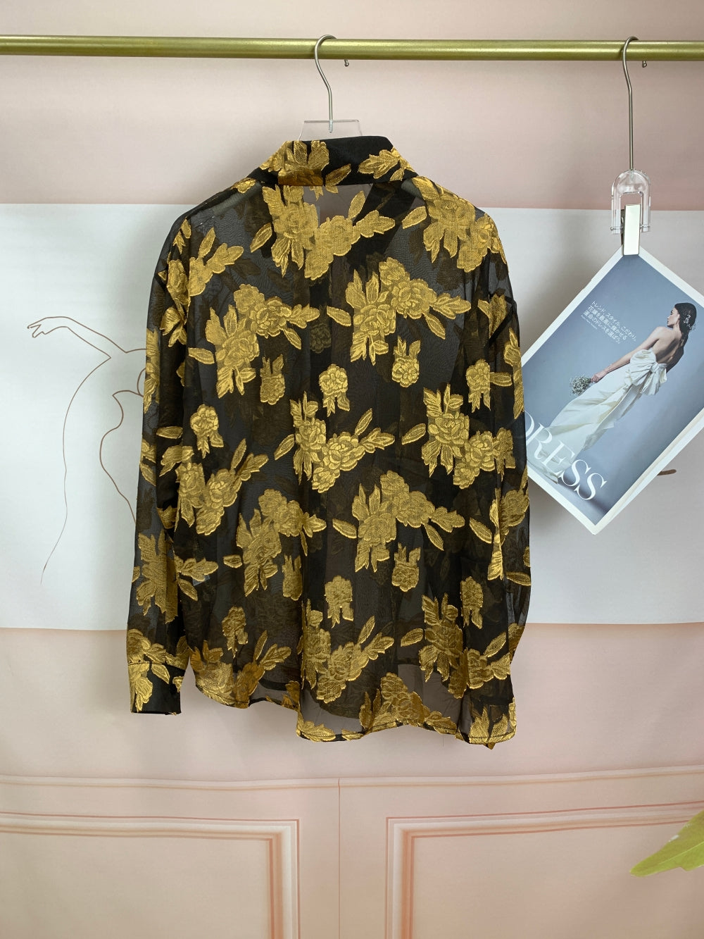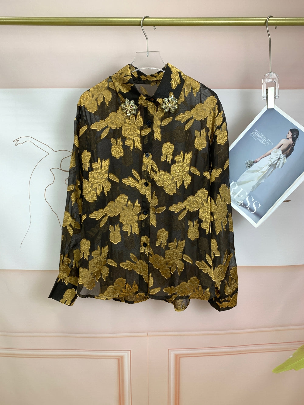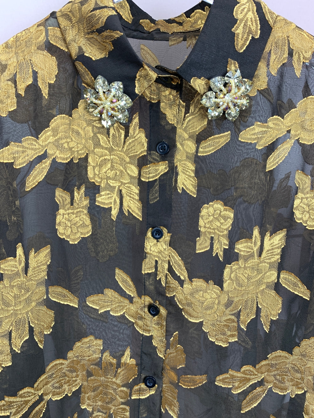 Details: Black base with gold embroidered floral motifs, crystal-embellished collar, lightweight semi-transparent texture