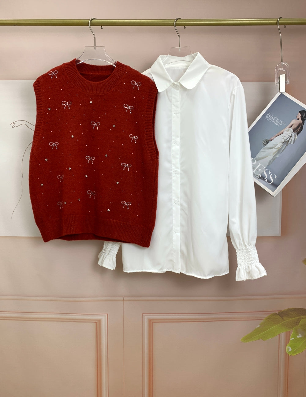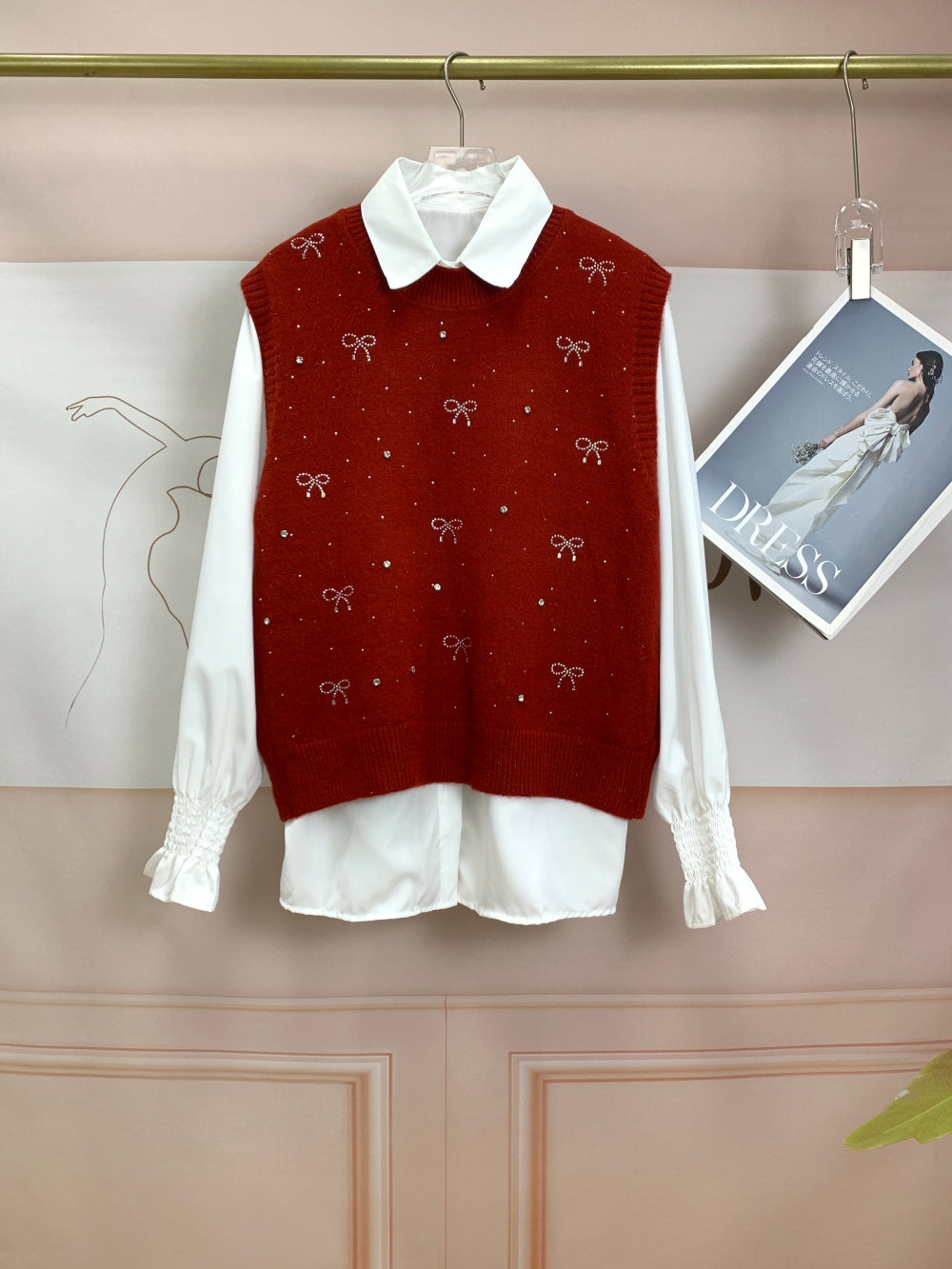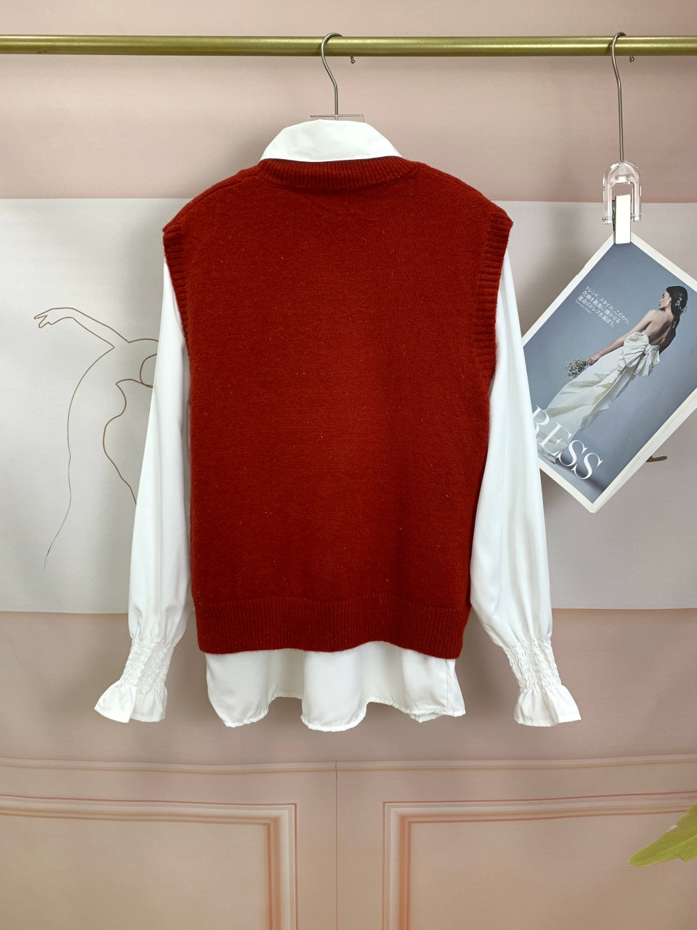 Details: Layered look with collared shirt insert, sleeveless knit vest overlay