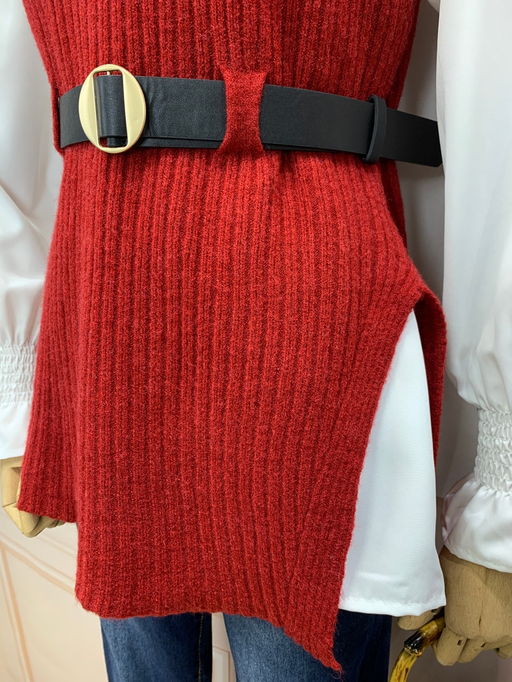 Details: Ribbed sleeveless vest overlay with fitted belt, white shirt base with shirred cuffs, structured collar, available in beige and red