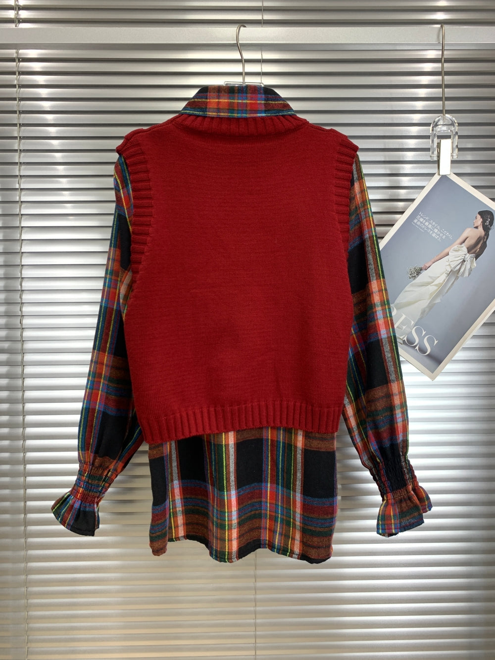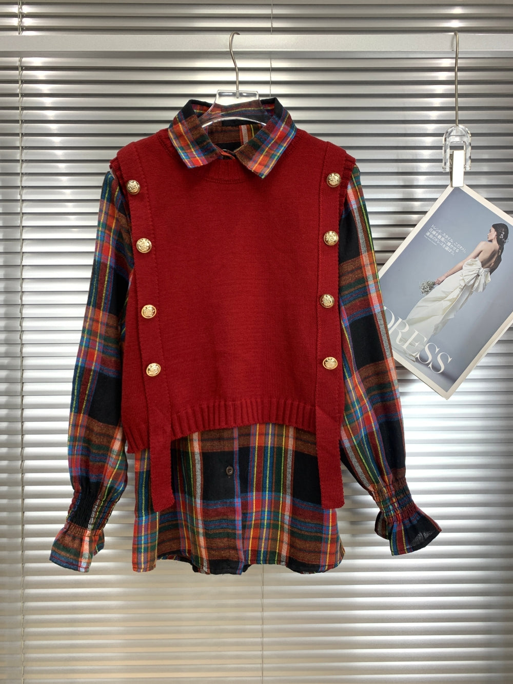 Details: Gold button accents on vest, layered design, cuffed plaid sleeves