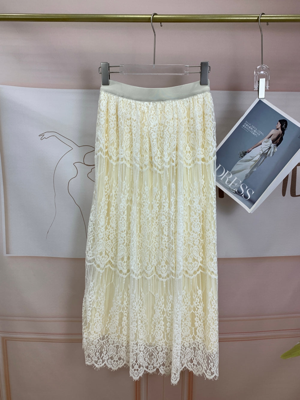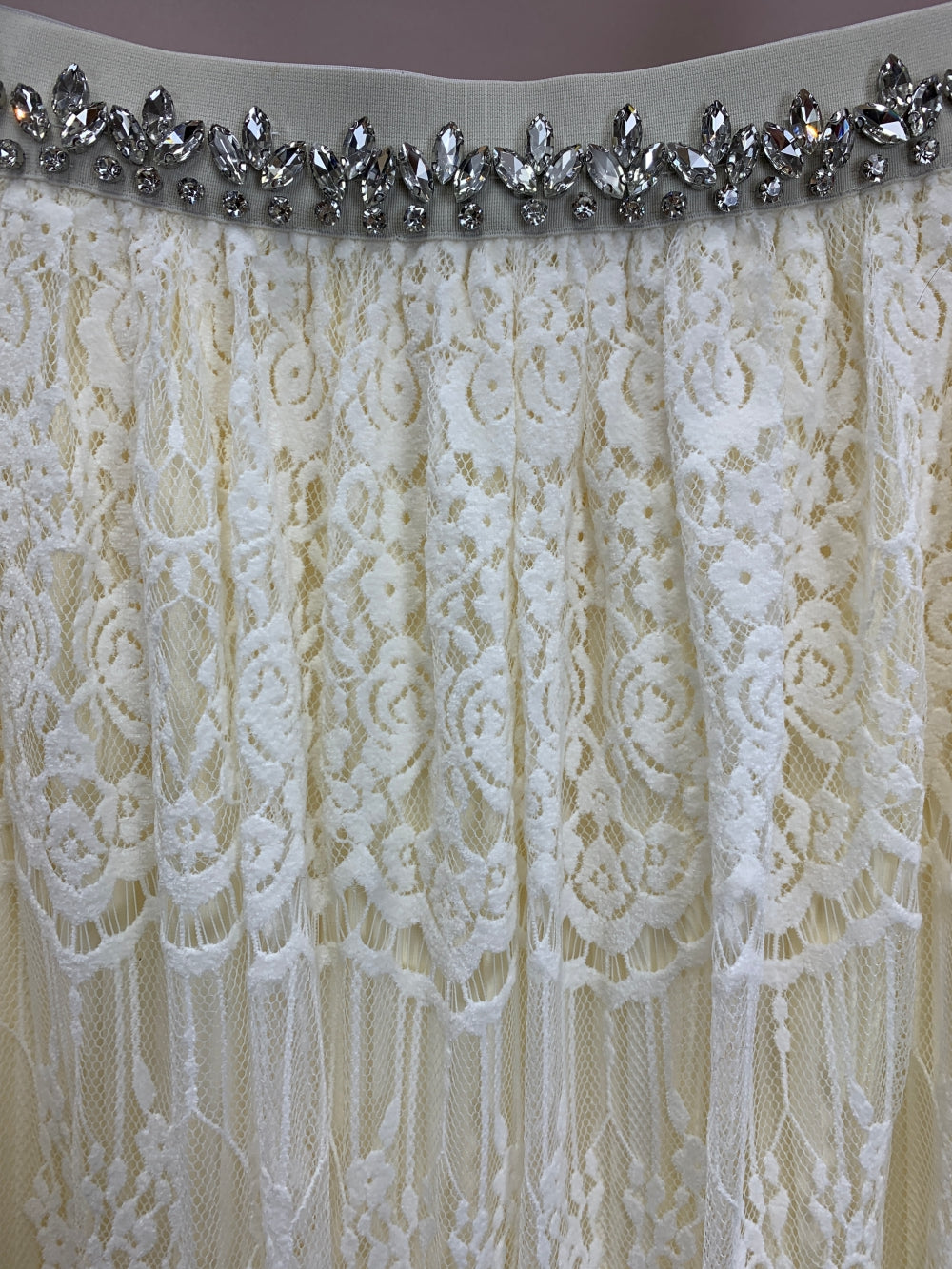 Details: Layered lace tiers, embellished waistband with crystals or amber stones, fully lined, available in cream and brown