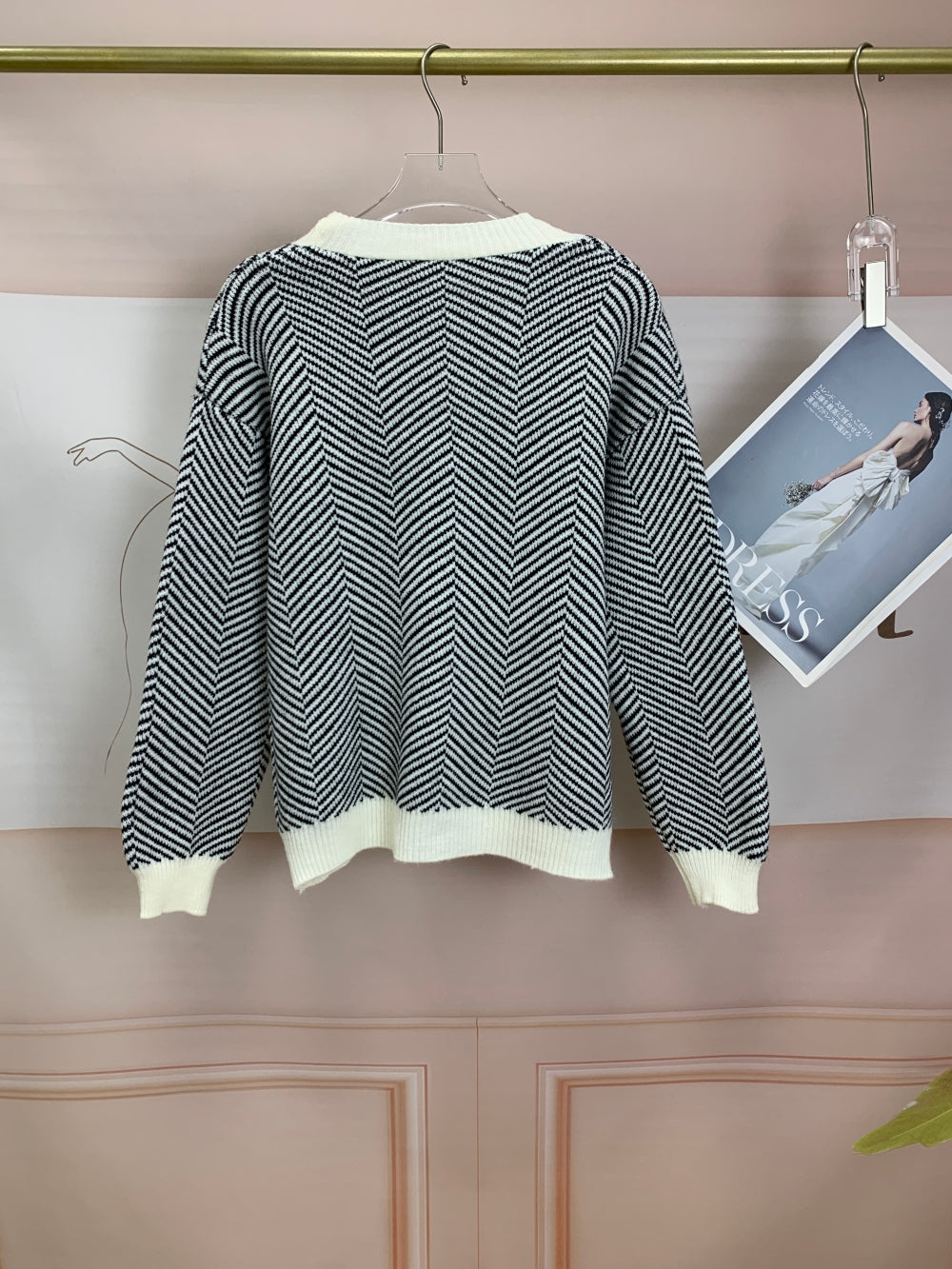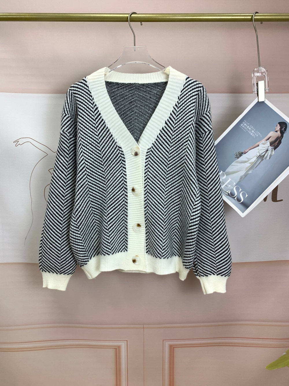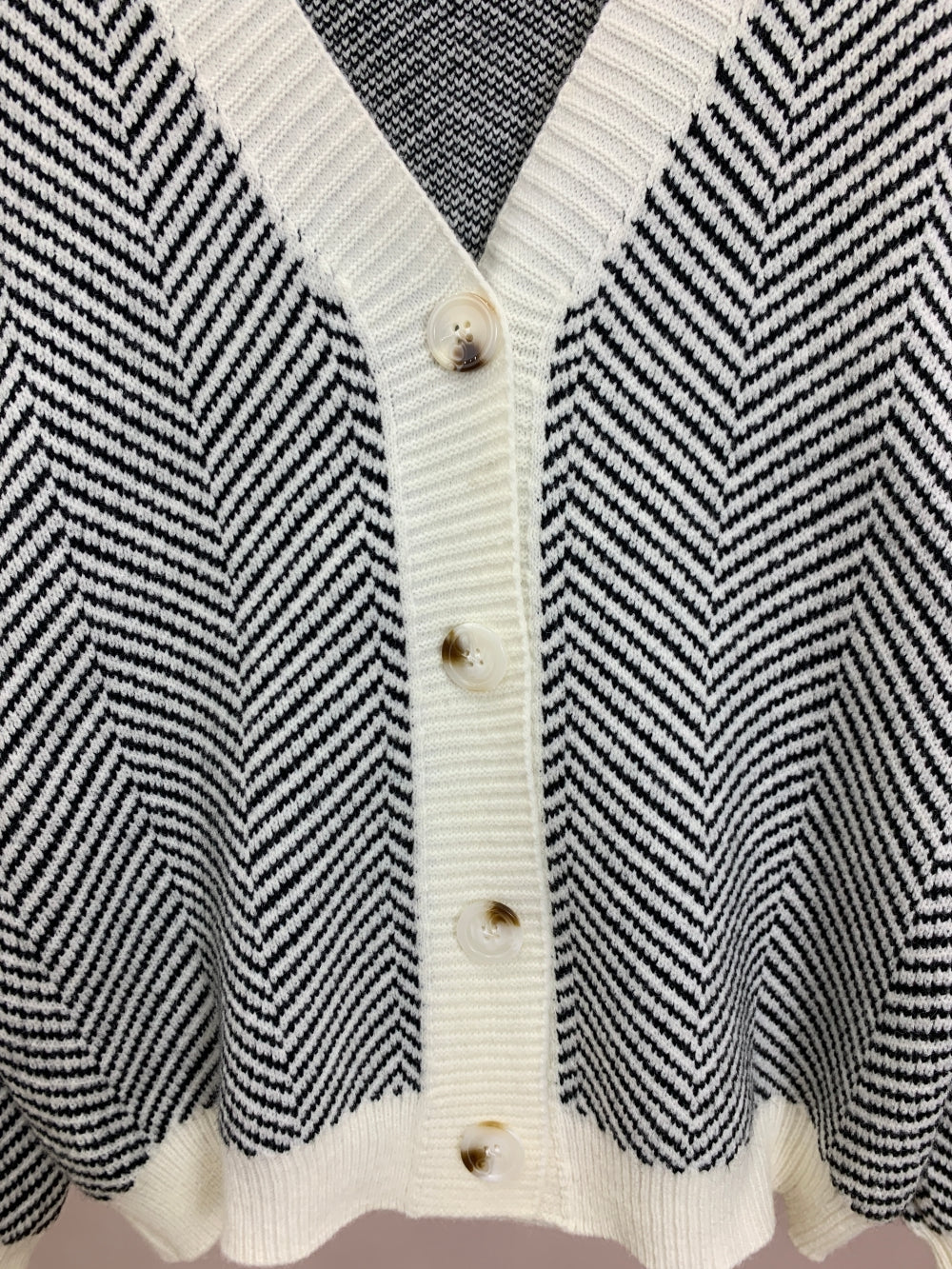 Details: Large tortoiseshell buttons, wide ribbed placket and hem, drop shoulders