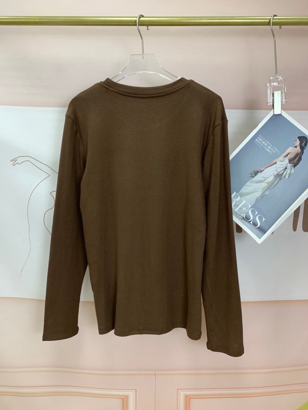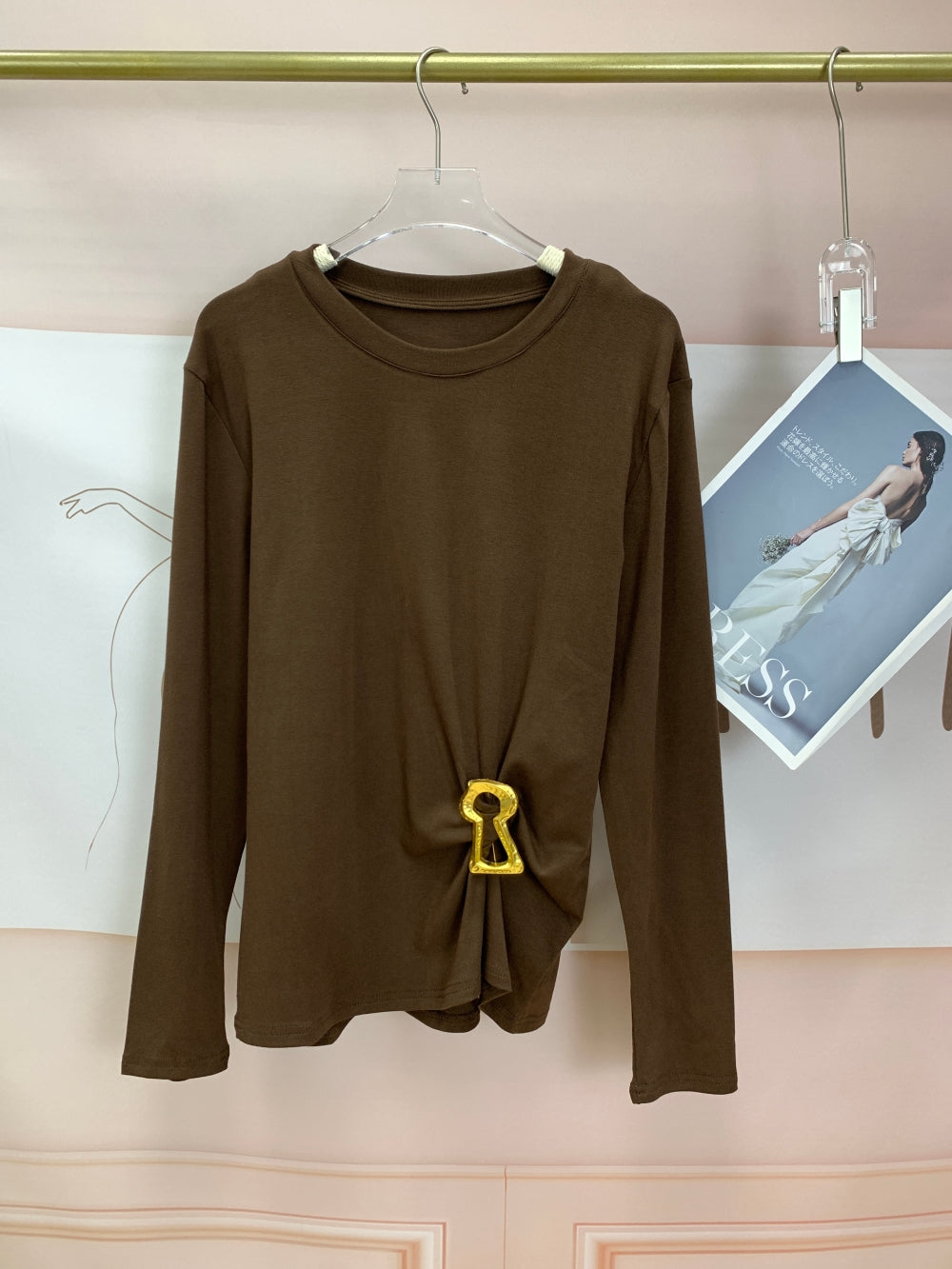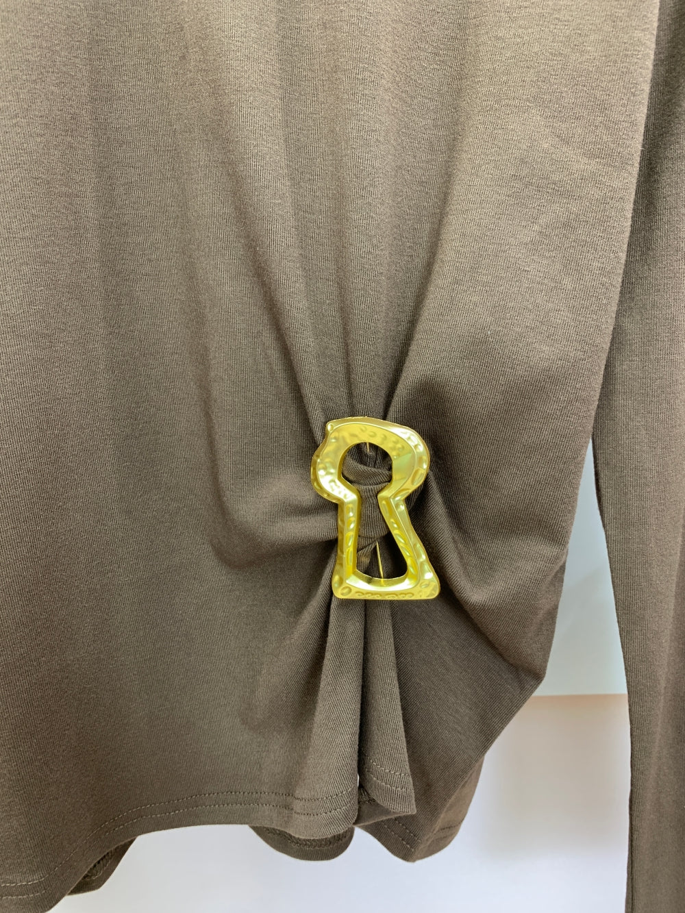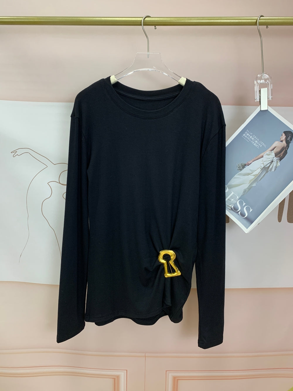 Details: Side metal ring accent creating ruched twist detail, crew neck, long sleeves