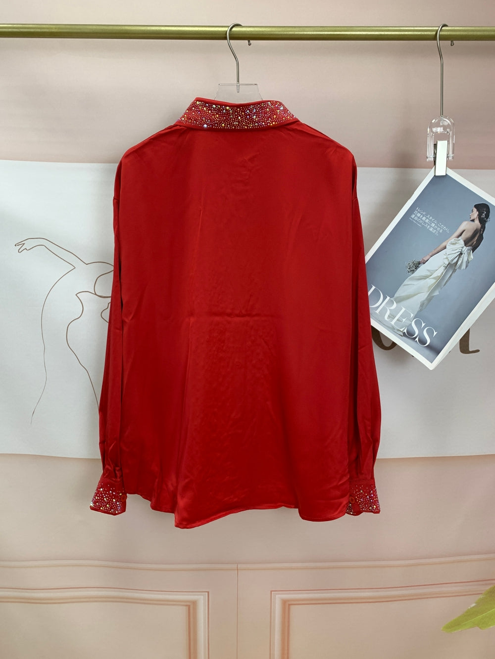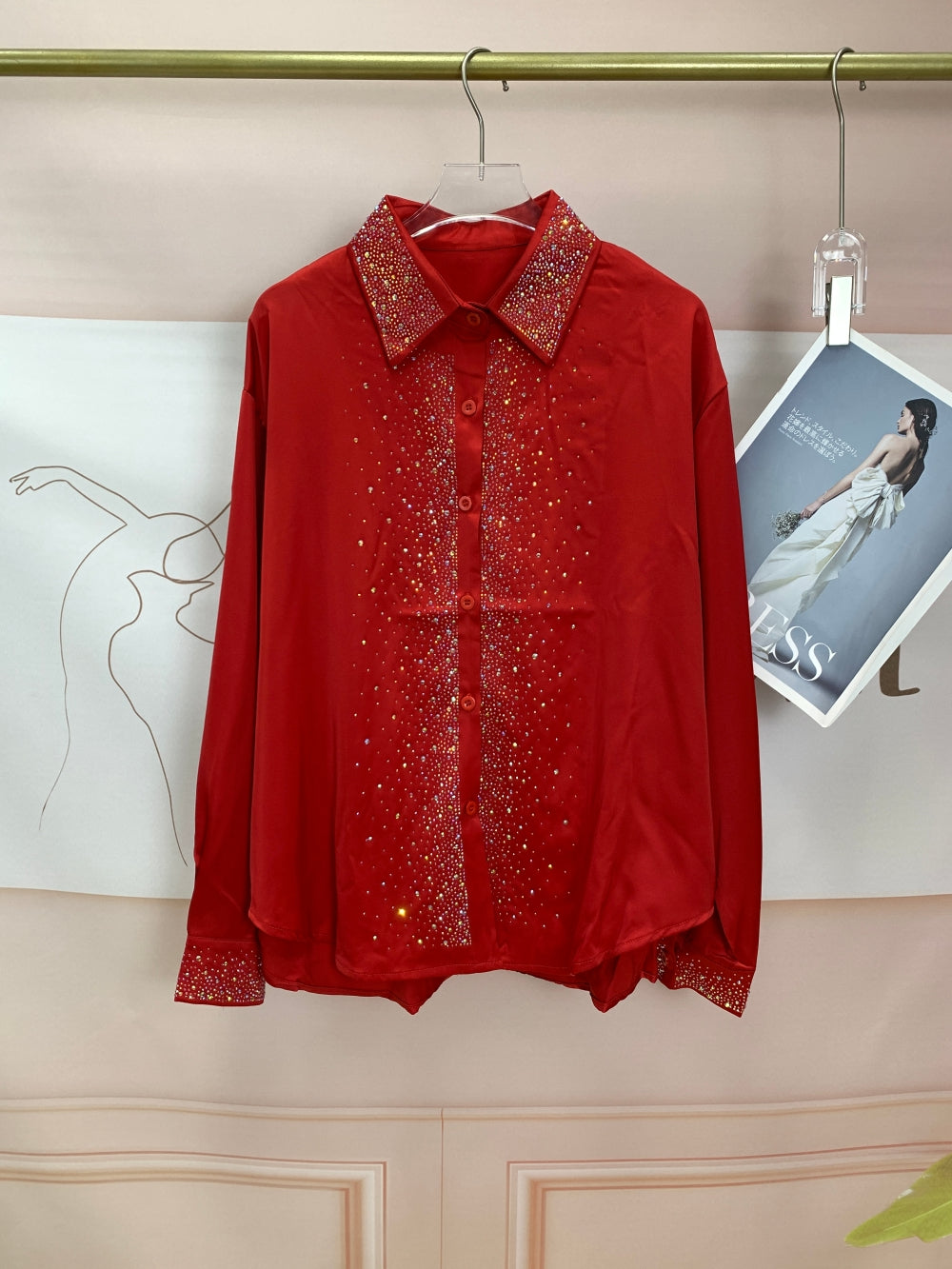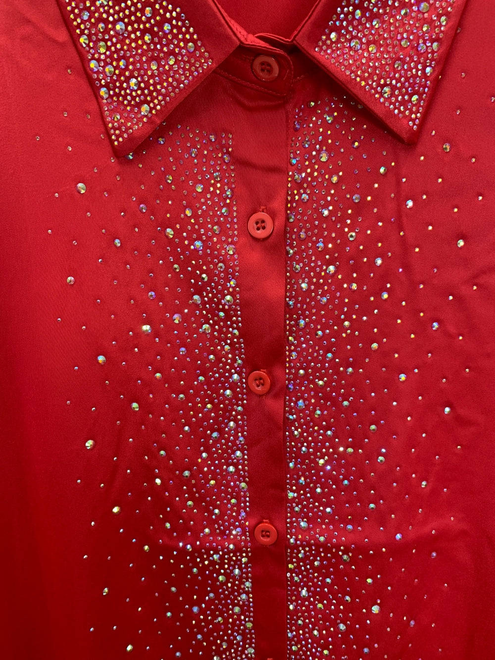 Details: Gradient rhinestone accents on front panel, collar, and cuffs; button-up front; glossy finish
