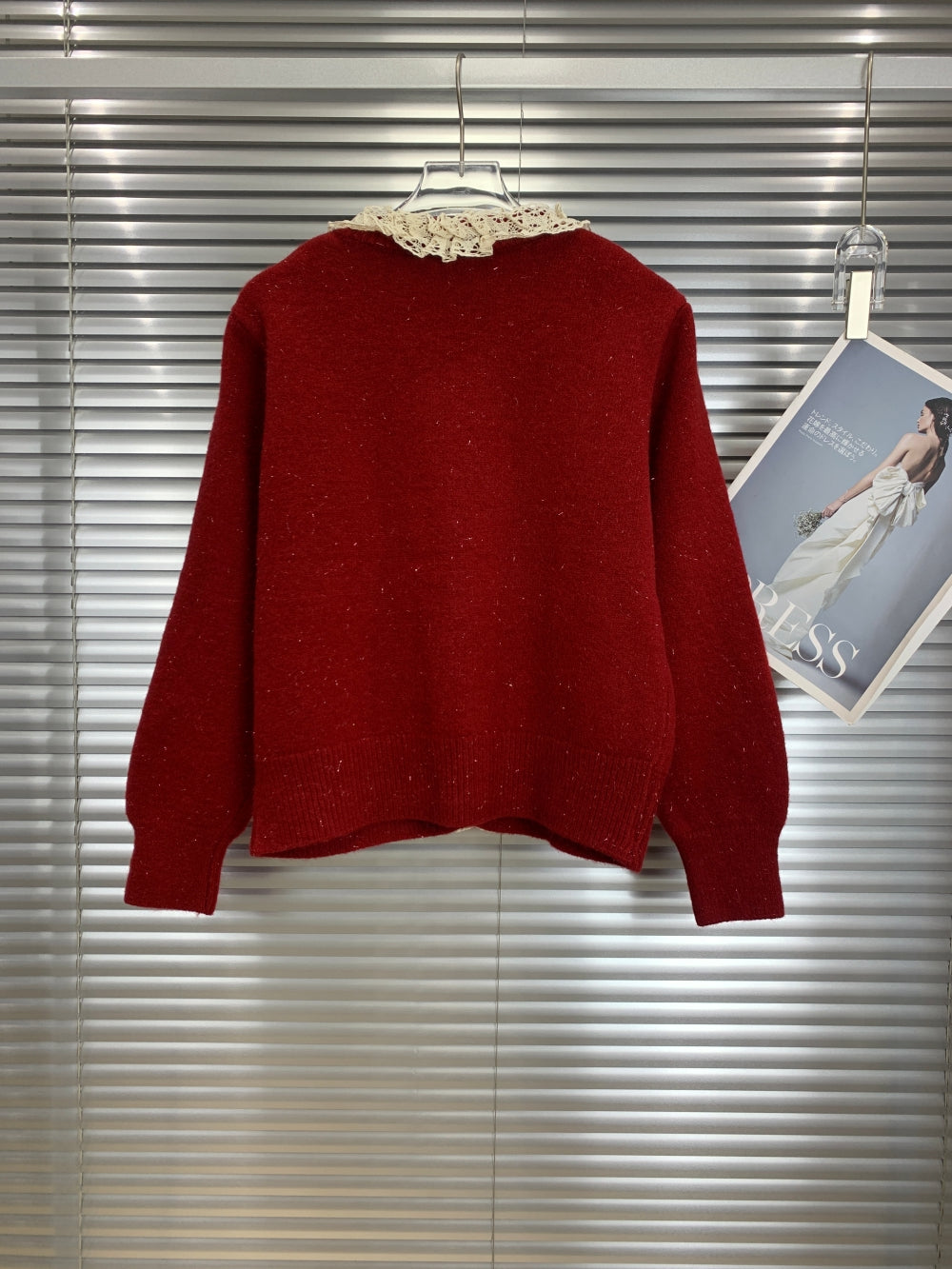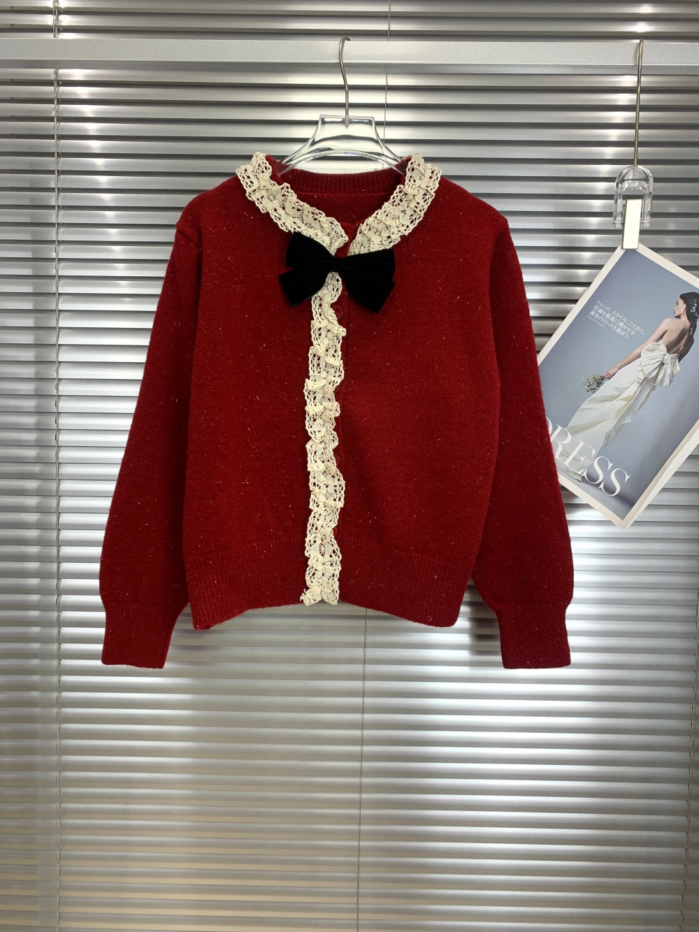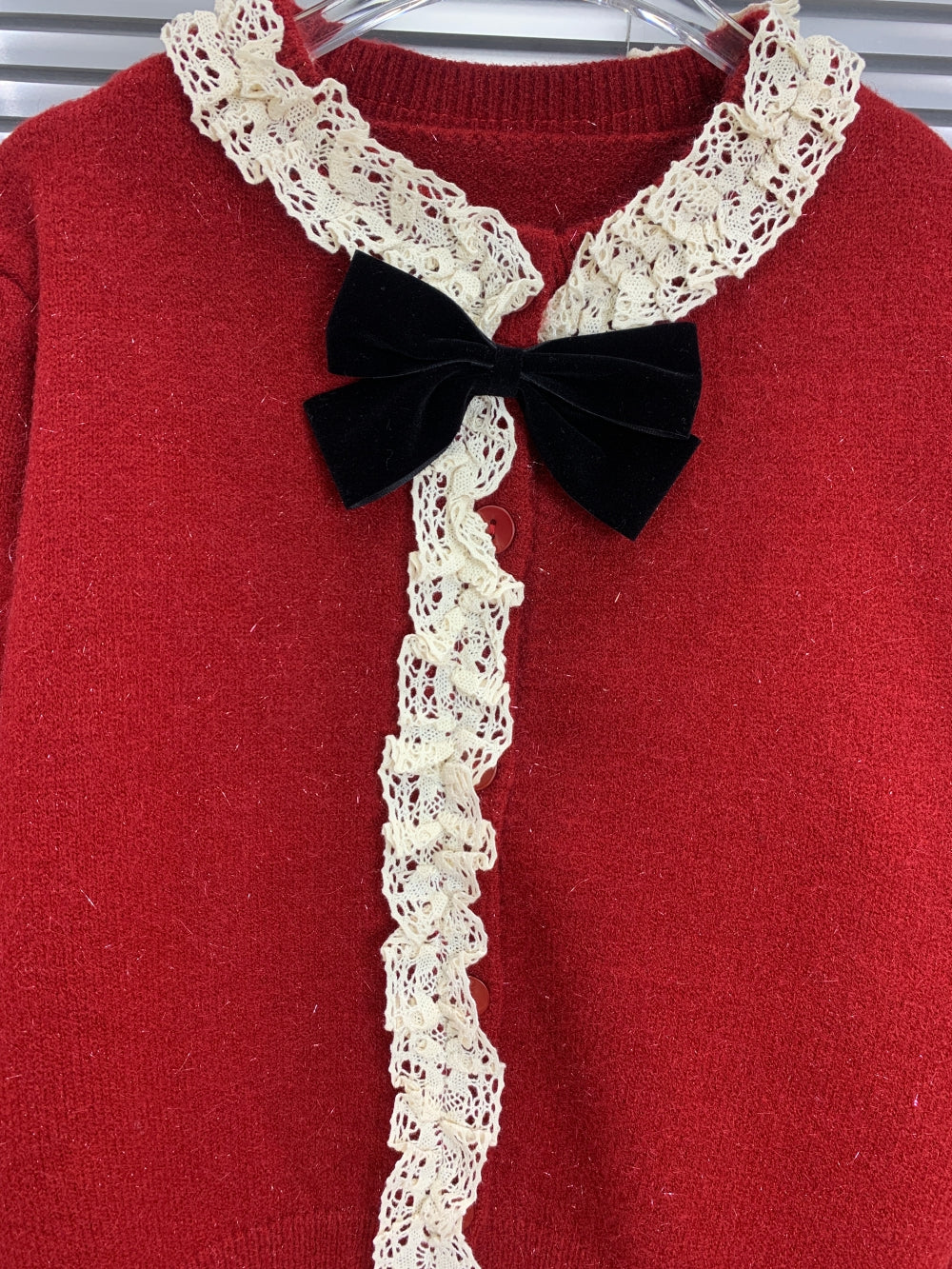 Details: Cream lace front trim, black velvet bow, ribbed cuffs