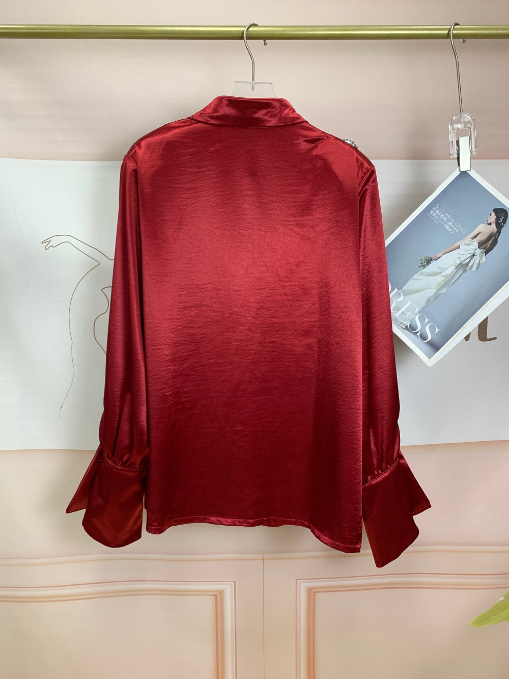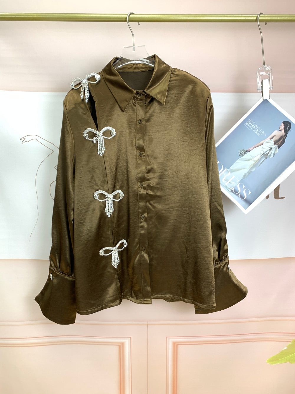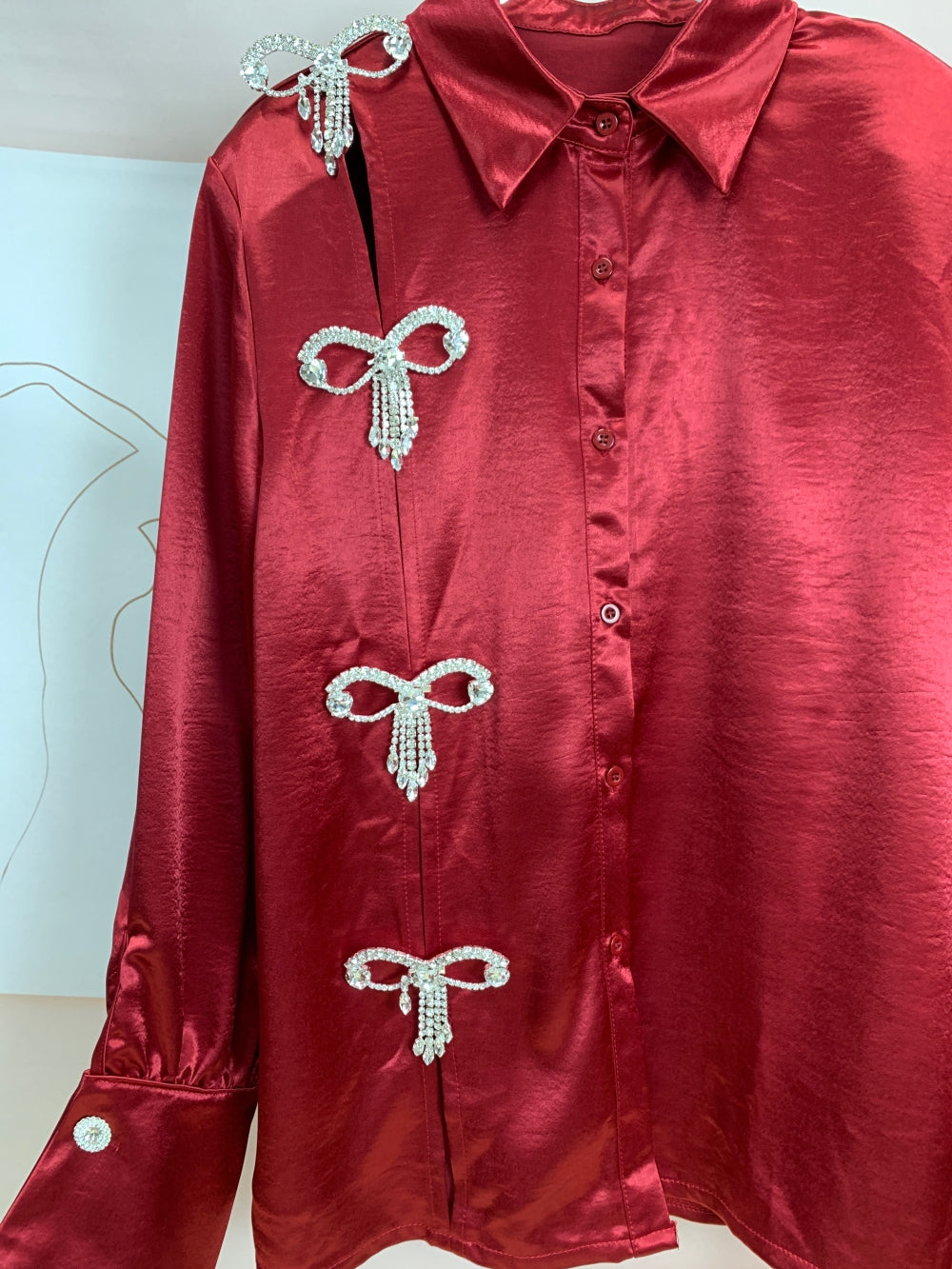Details: Decorative pearl bow appliqués along shoulder and side, long sleeves with button cuffs, collared neckline